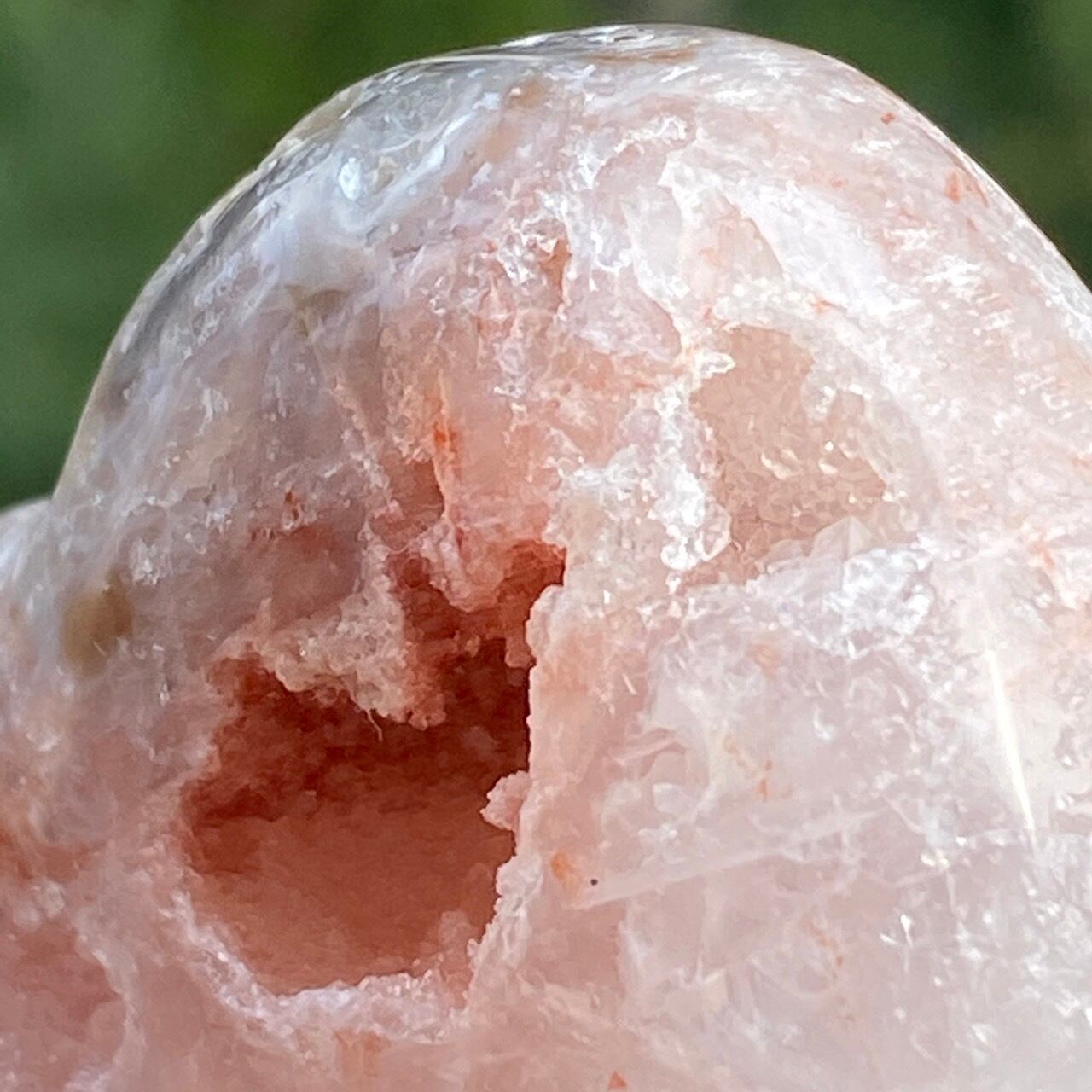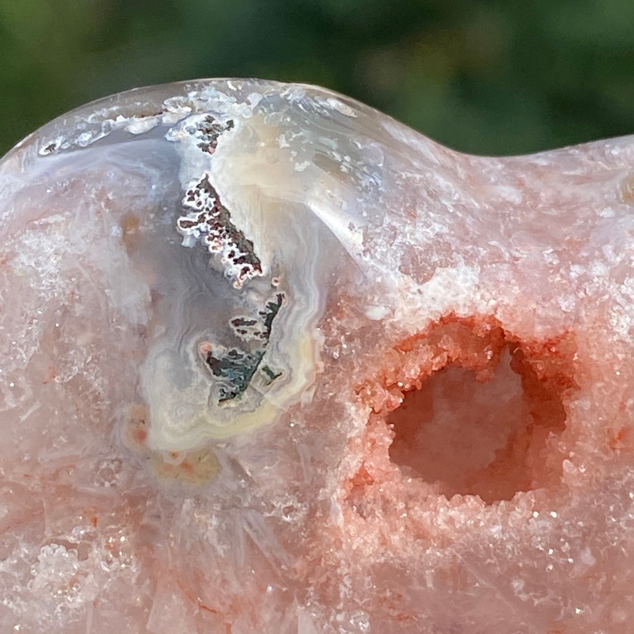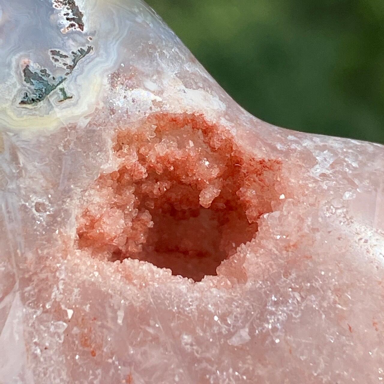 両面にアプリコット系色味のドゥルージー(片方は人魚や金魚の様な形をしています)があり、殆どの部分が結晶化したクォーツで覆われている素敵な子です。上部におそらく若干グリーンジャスパーの母岩的なものが透けて見えます。