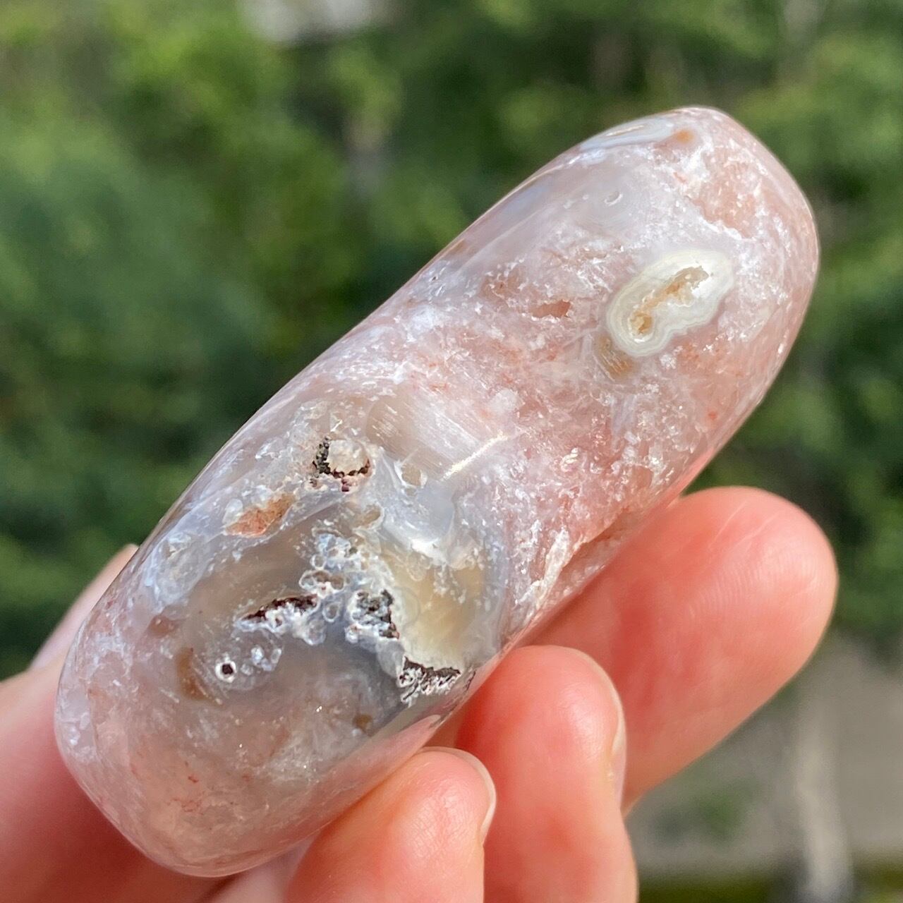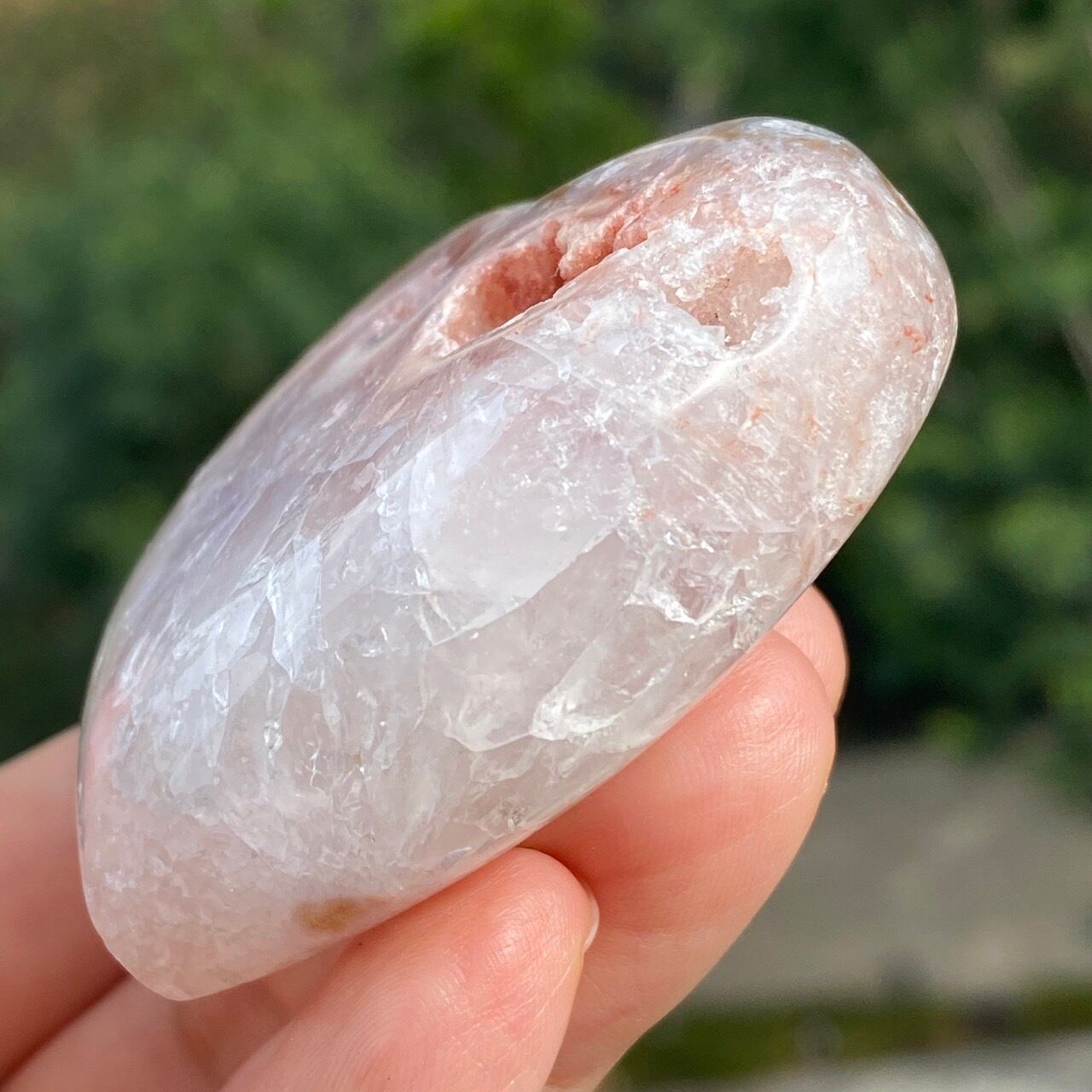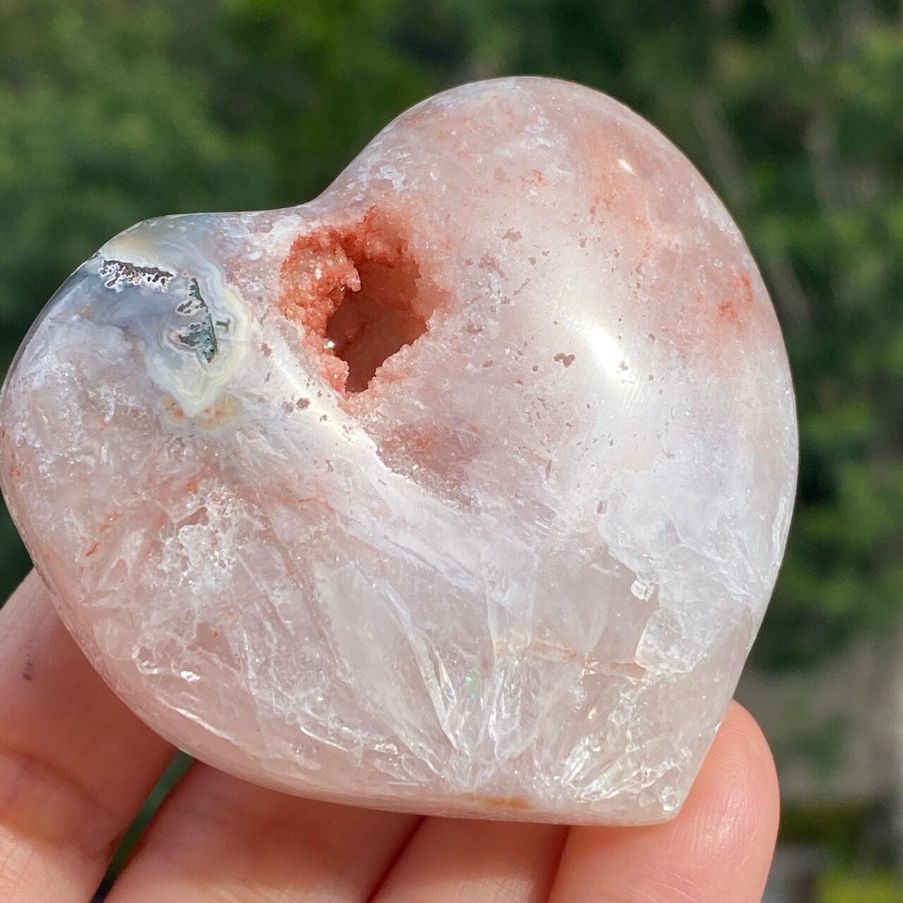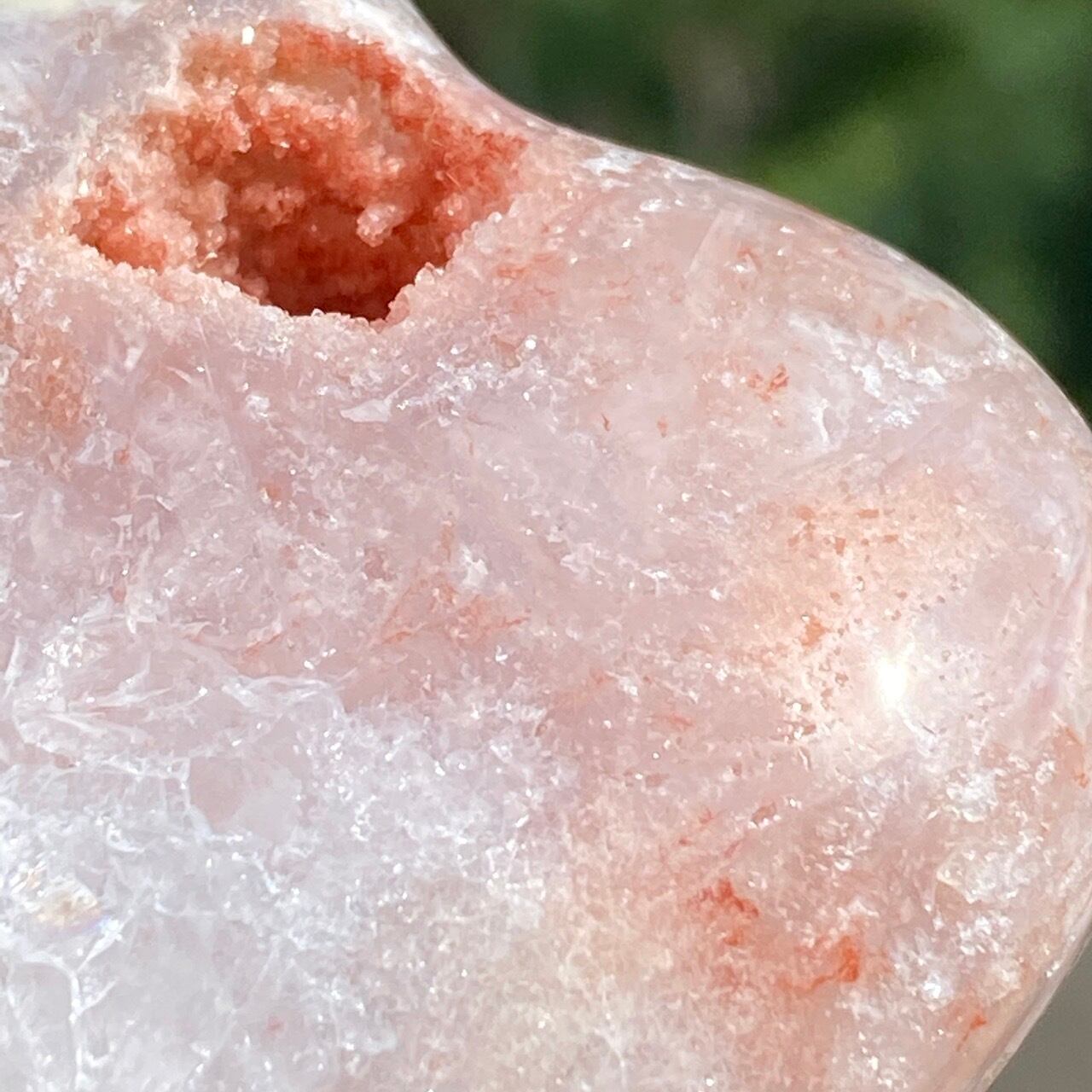 両面にアプリコット系色味のドゥルージー(片方は人魚や金魚の様な形をしています)があり、殆どの部分が結晶化したクォーツで覆われている素敵な子です。上部におそらく若干グリーンジャスパーの母岩的なものが透けて見えます。