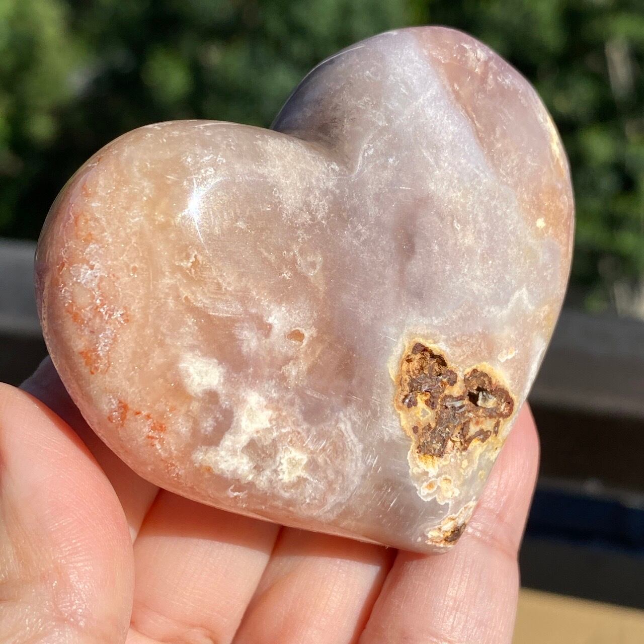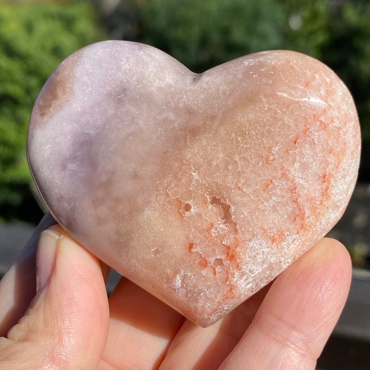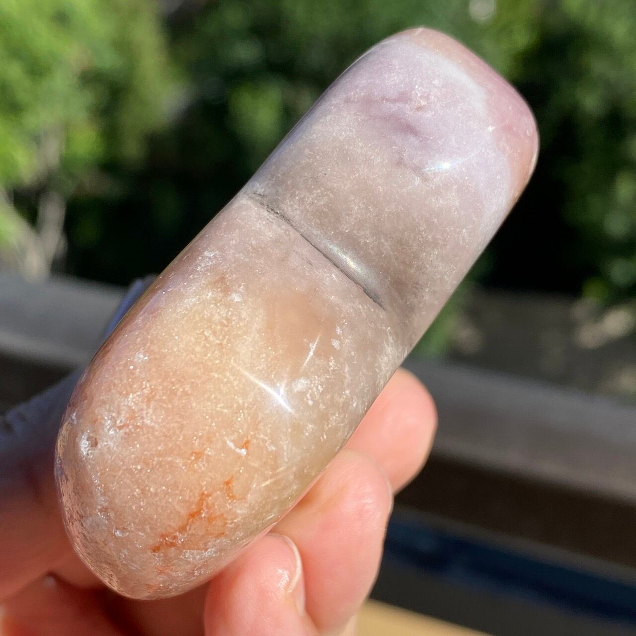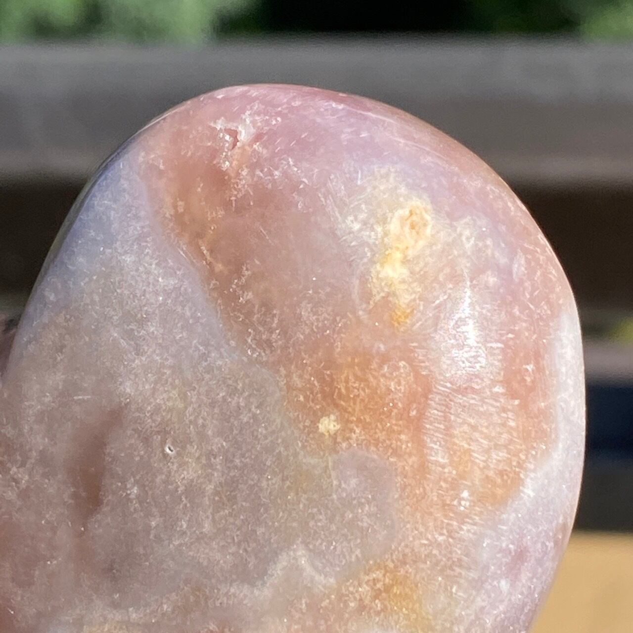 藤色にミルキーな色味、そしてスモーキーなアプリコット系の色味や結晶化したクォーツがグラデーションを構成しています。加わって、幻想的な模様が配されているとても素敵な子です。