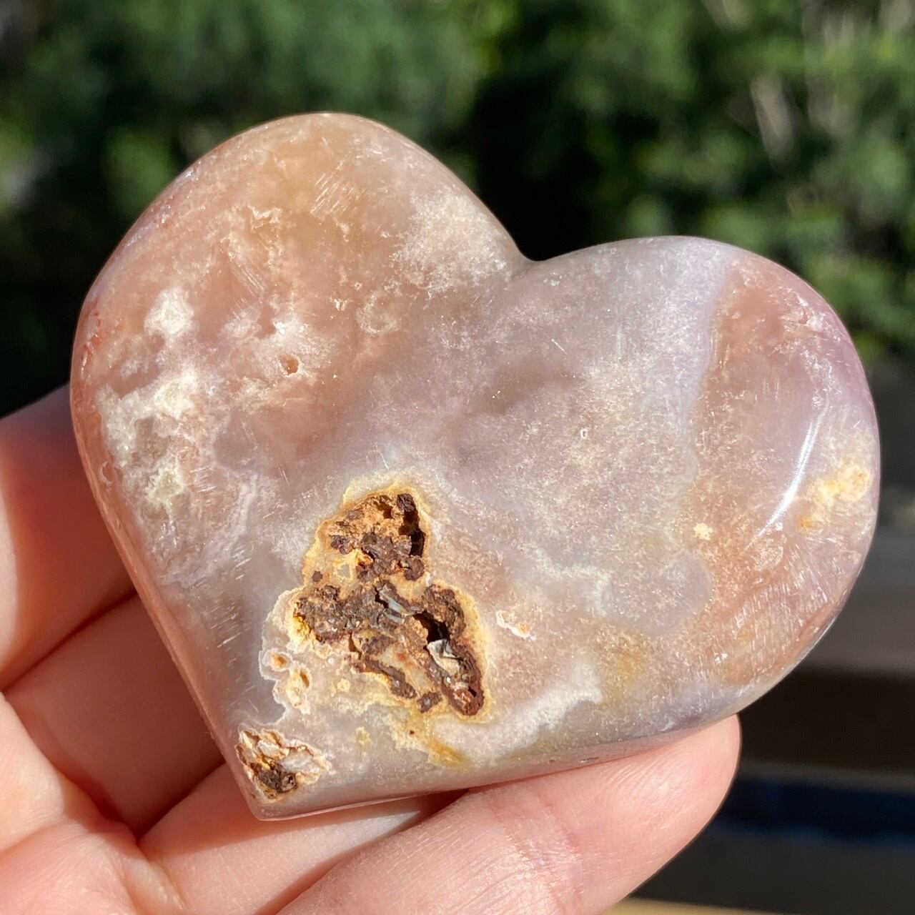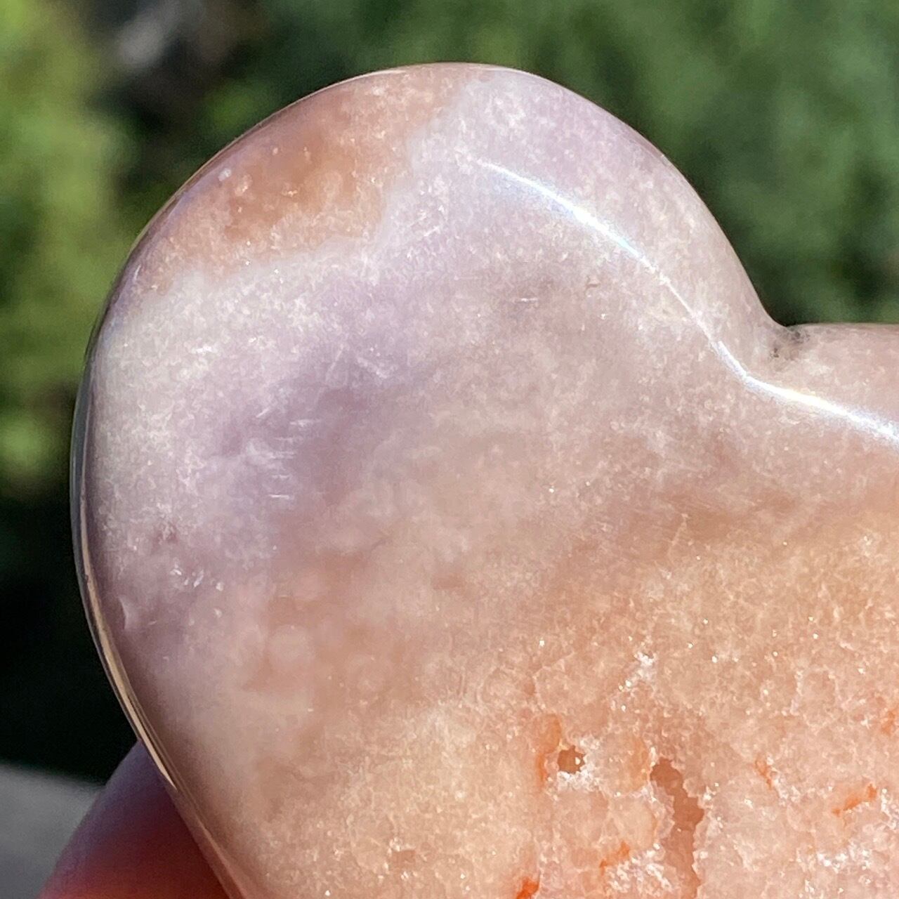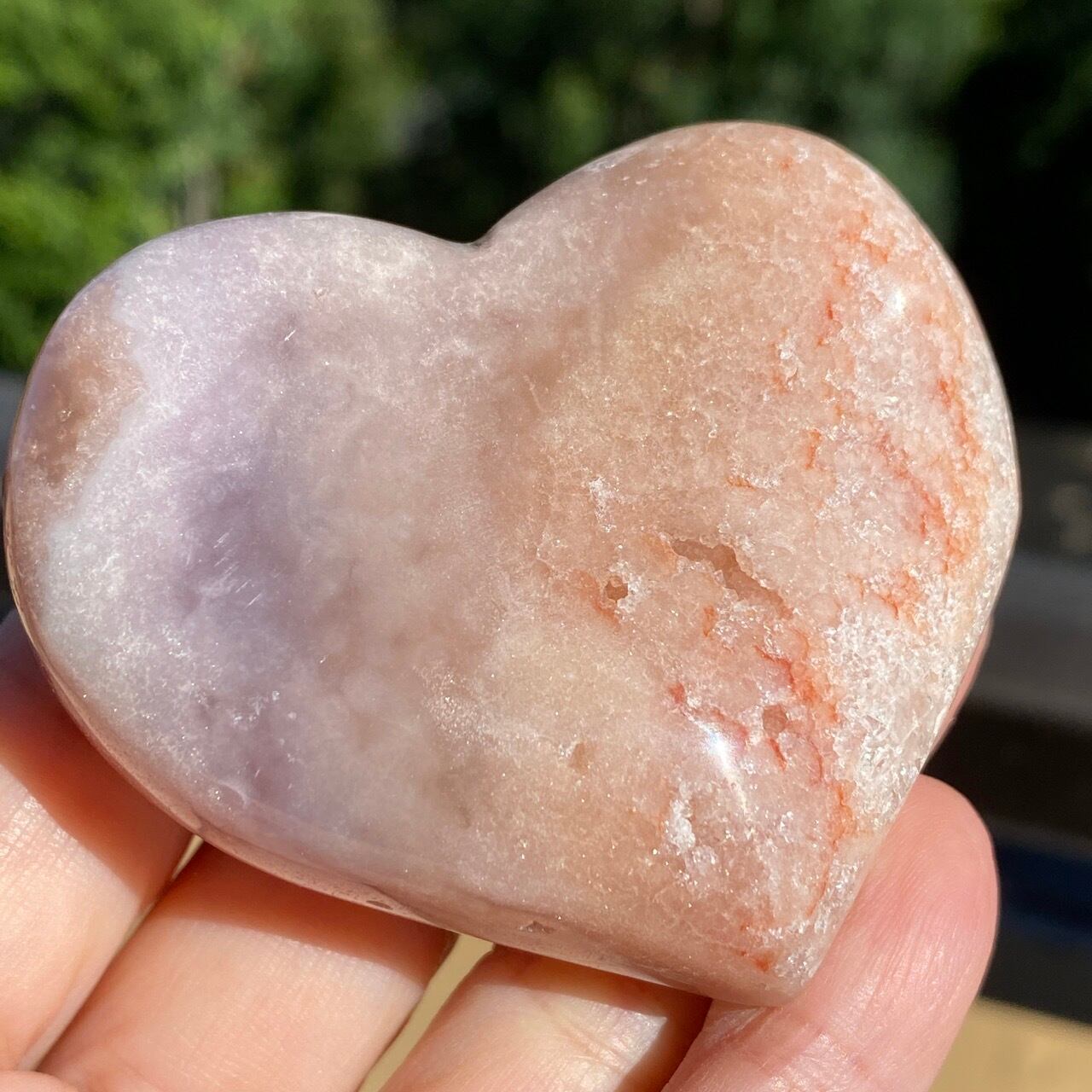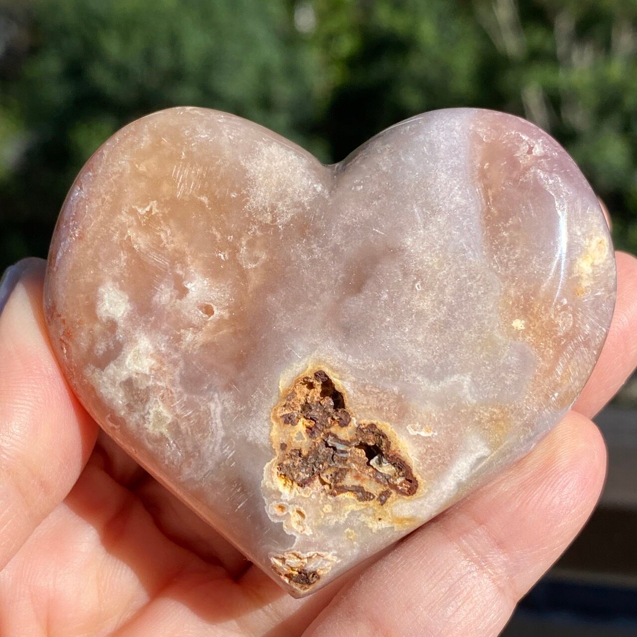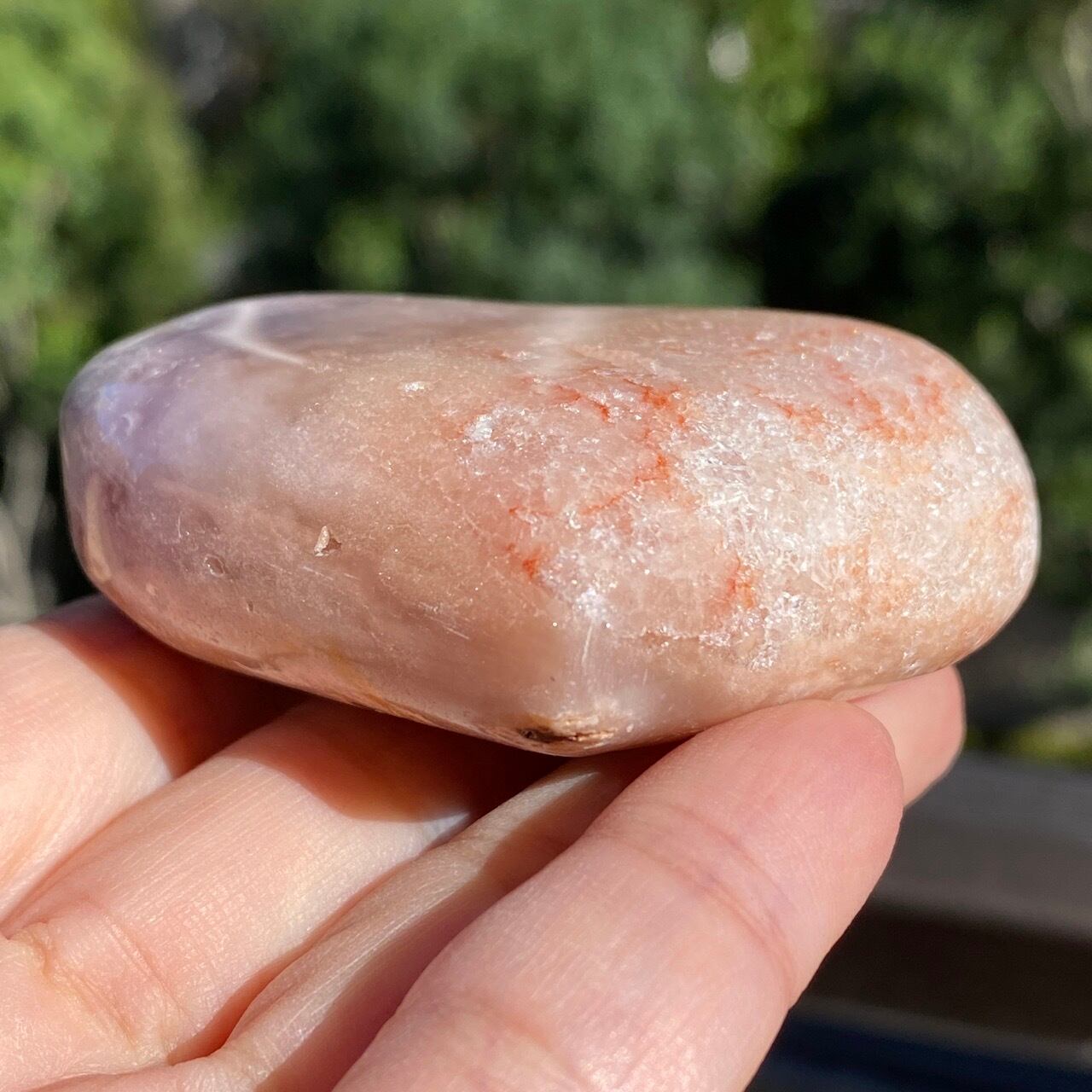 藤色にミルキーな色味、そしてスモーキーなアプリコット系の色味や結晶化したクォーツがグラデーションを構成しています。加わって、幻想的な模様が配されているとても素敵な子です。
