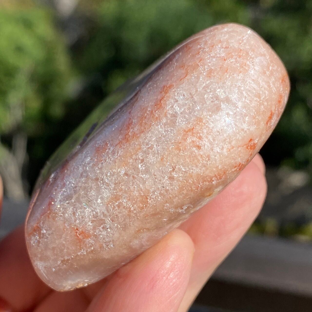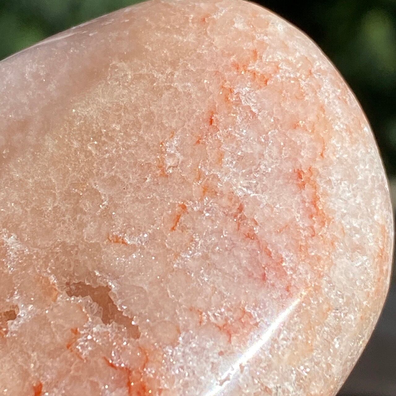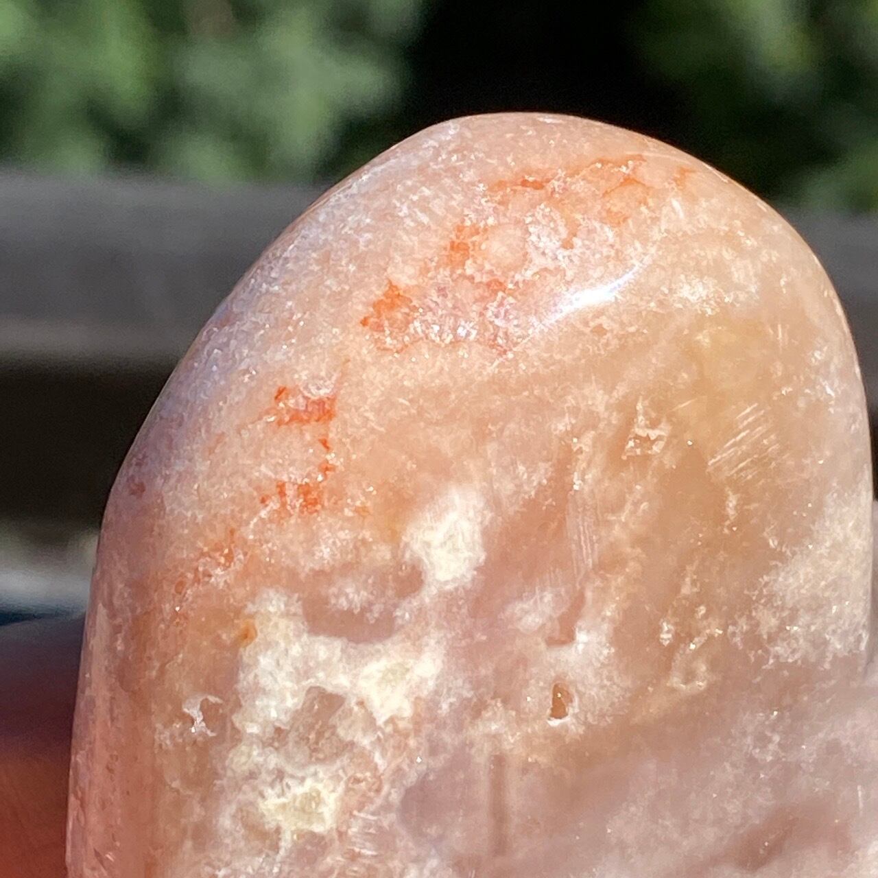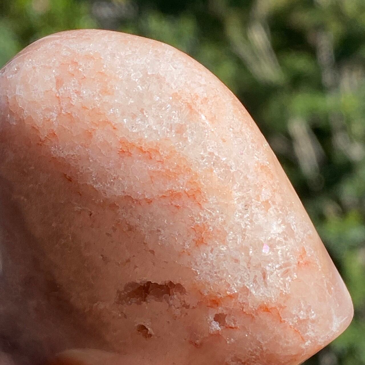 藤色にミルキーな色味、そしてスモーキーなアプリコット系の色味や結晶化したクォーツがグラデーションを構成しています。加わって、幻想的な模様が配されているとても素敵な子です。