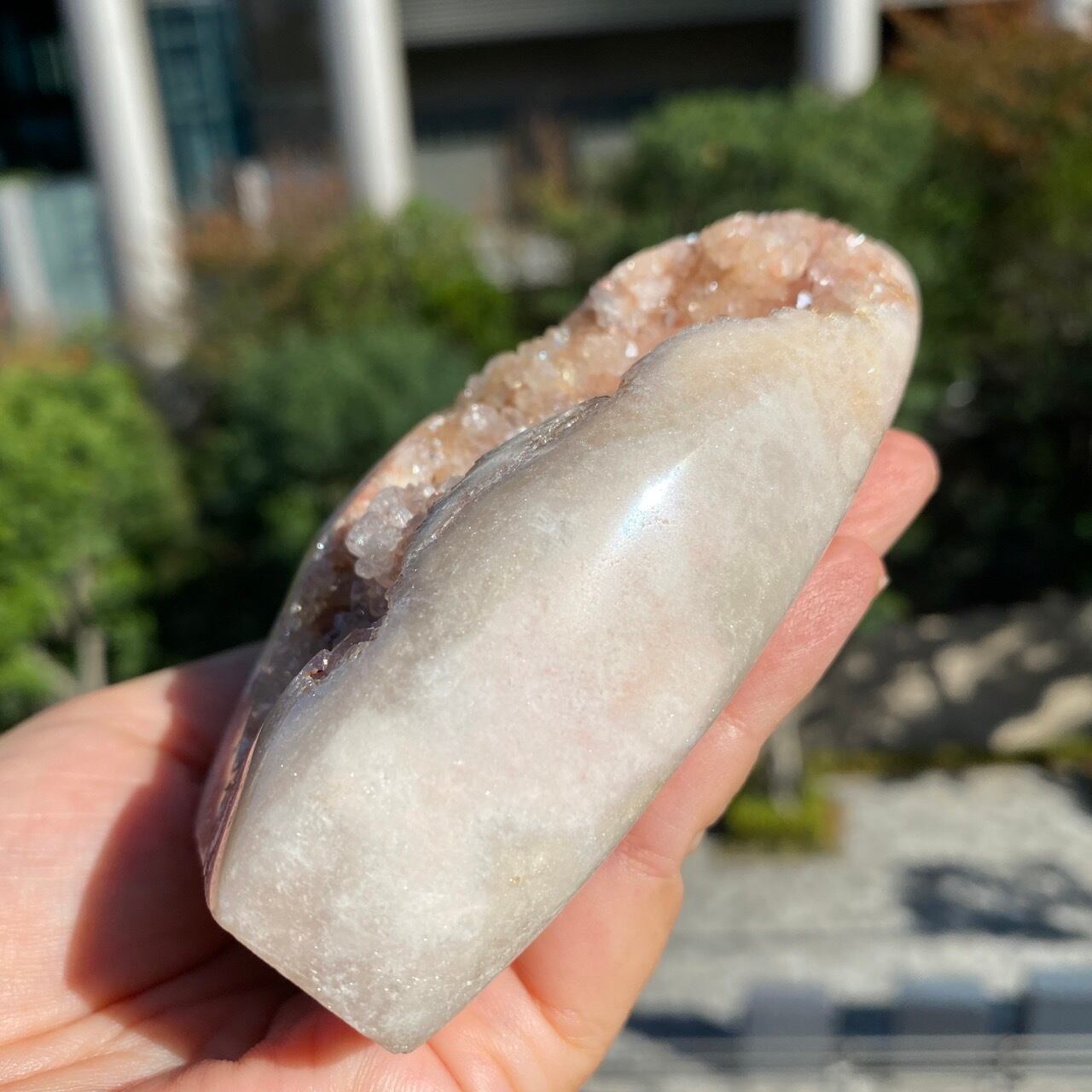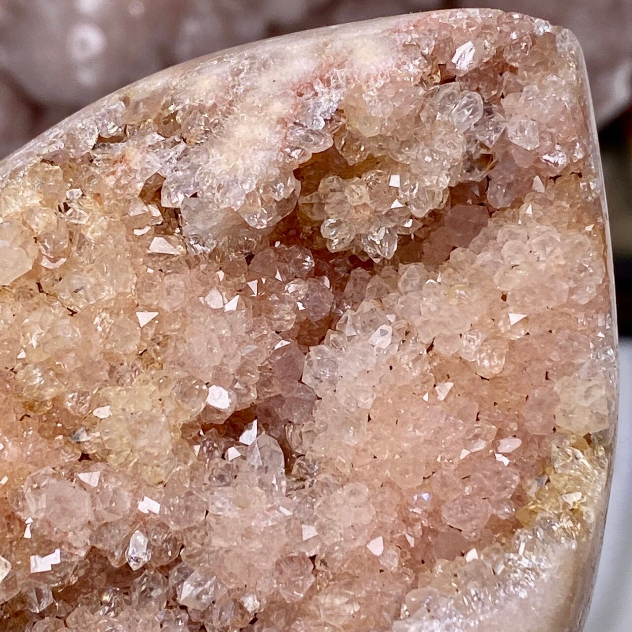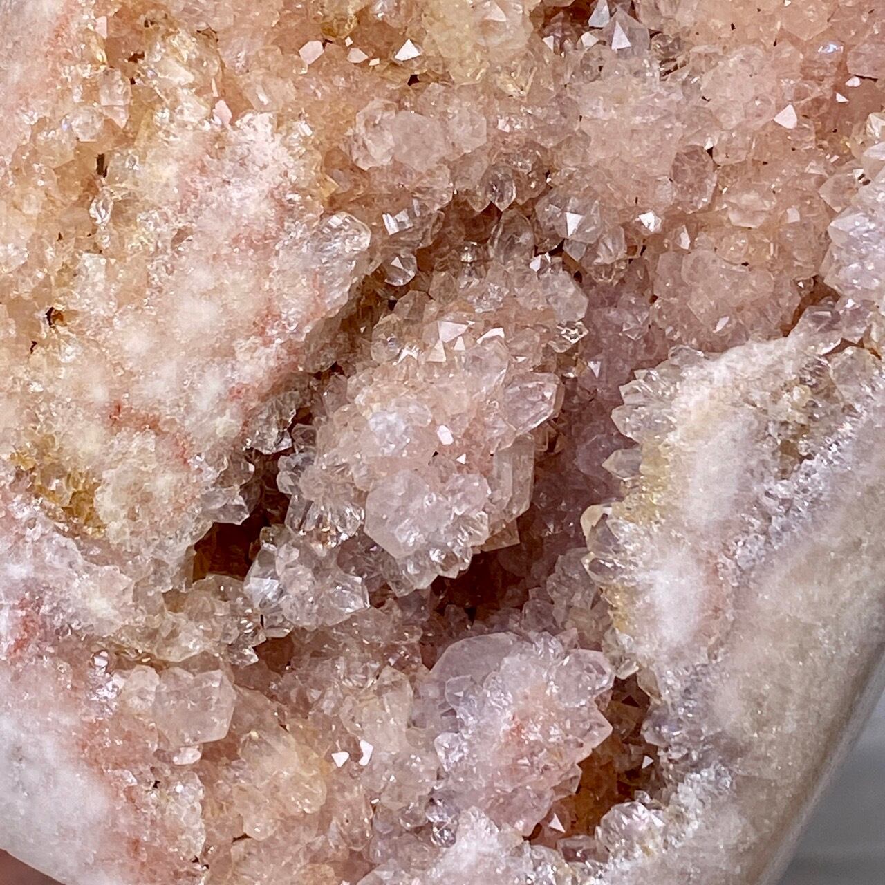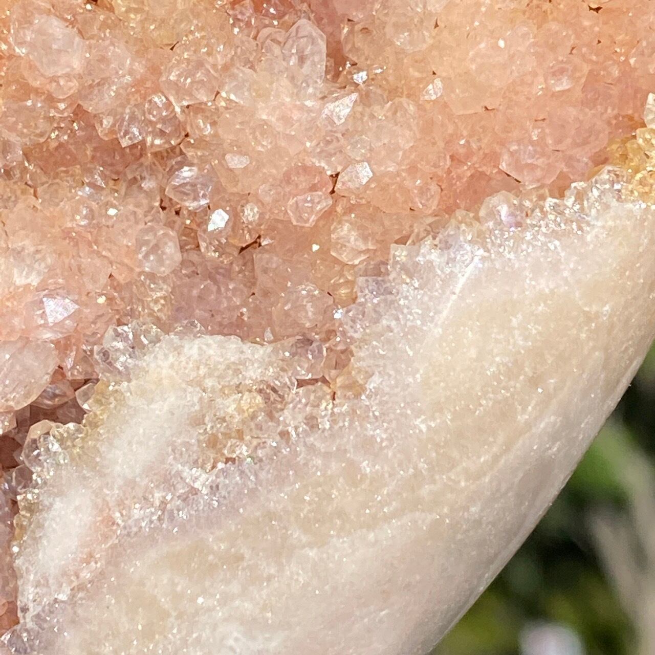 乳白色に近いミルクティー色のベースに、キラキラと輝くもこもこドゥルージーが前面を覆っているフリーフォーム。洗練された色味とゴージャスなドゥルージーが素敵にインテリアを装飾してくれます。屋外で撮影した画像はドライでマットな質感のように見えますが、実際は表面は研磨されていてつるっとしていますし、ドゥルージーはキラキラと眩い光を放っています。