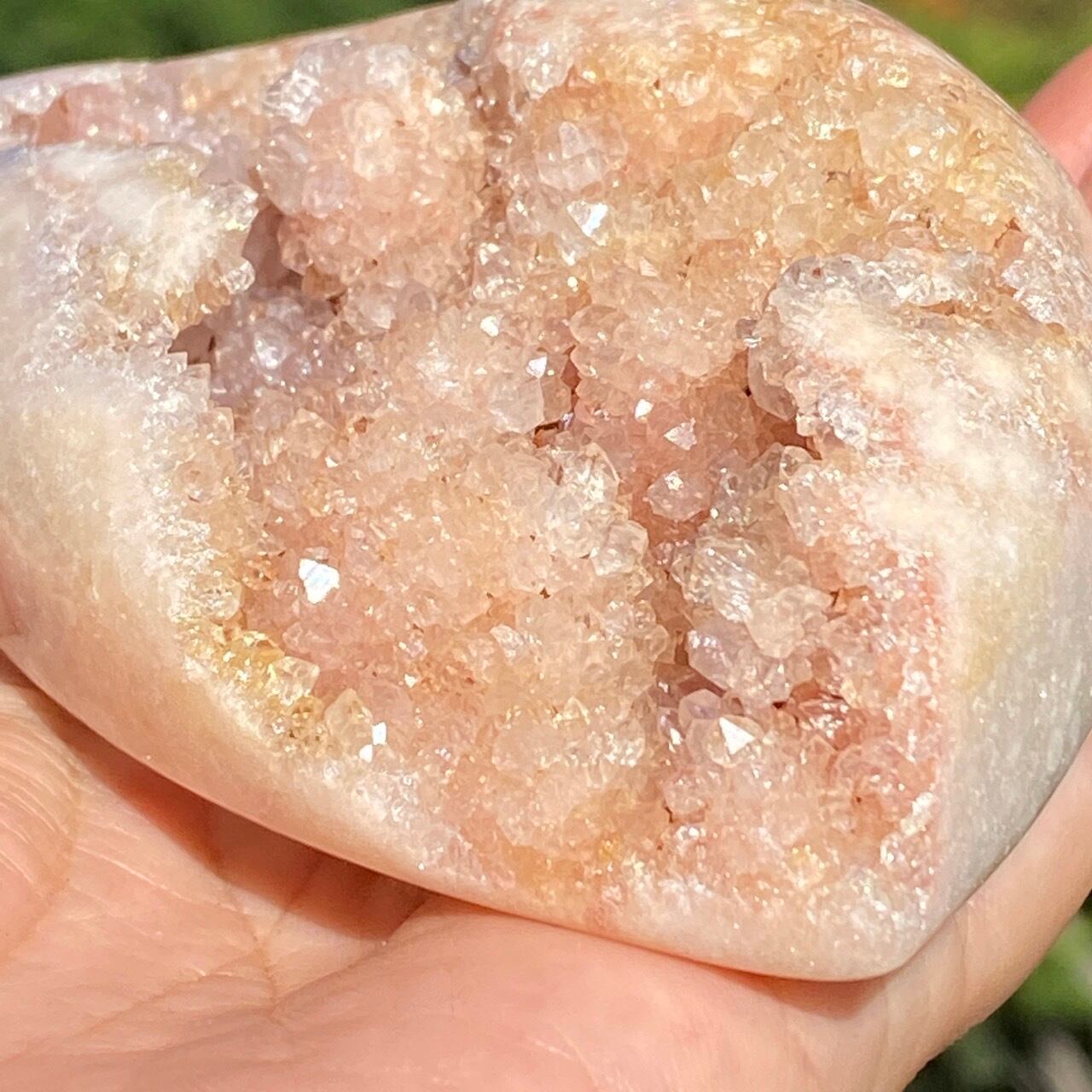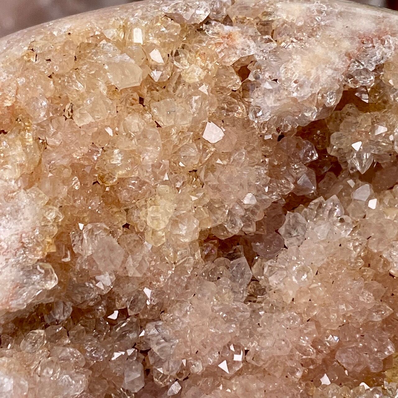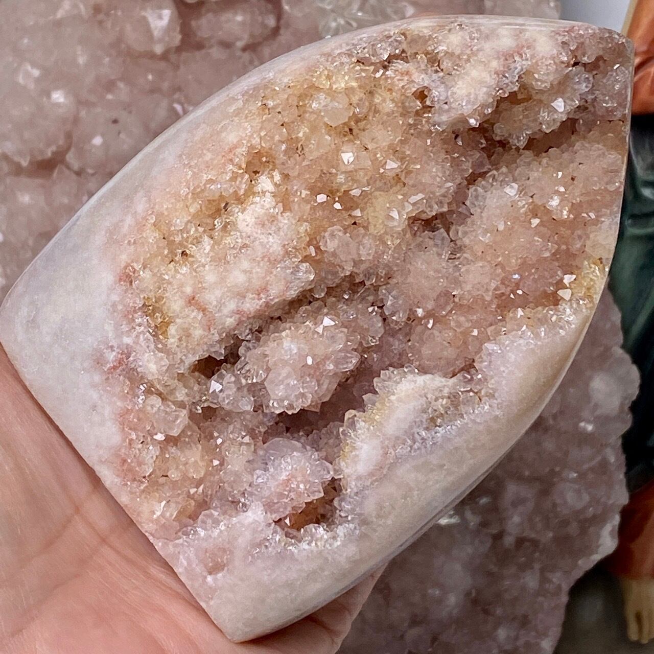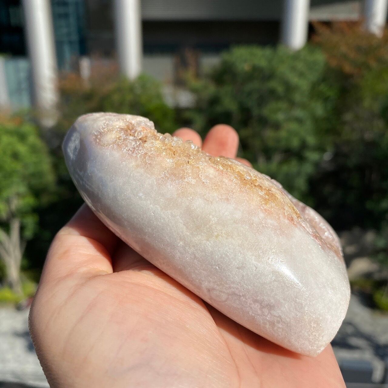 乳白色に近いミルクティー色のベースに、キラキラと輝くもこもこドゥルージーが前面を覆っているフリーフォーム。洗練された色味とゴージャスなドゥルージーが素敵にインテリアを装飾してくれます。屋外で撮影した画像はドライでマットな質感のように見えますが、実際は表面は研磨されていてつるっとしていますし、ドゥルージーはキラキラと眩い光を放っています。