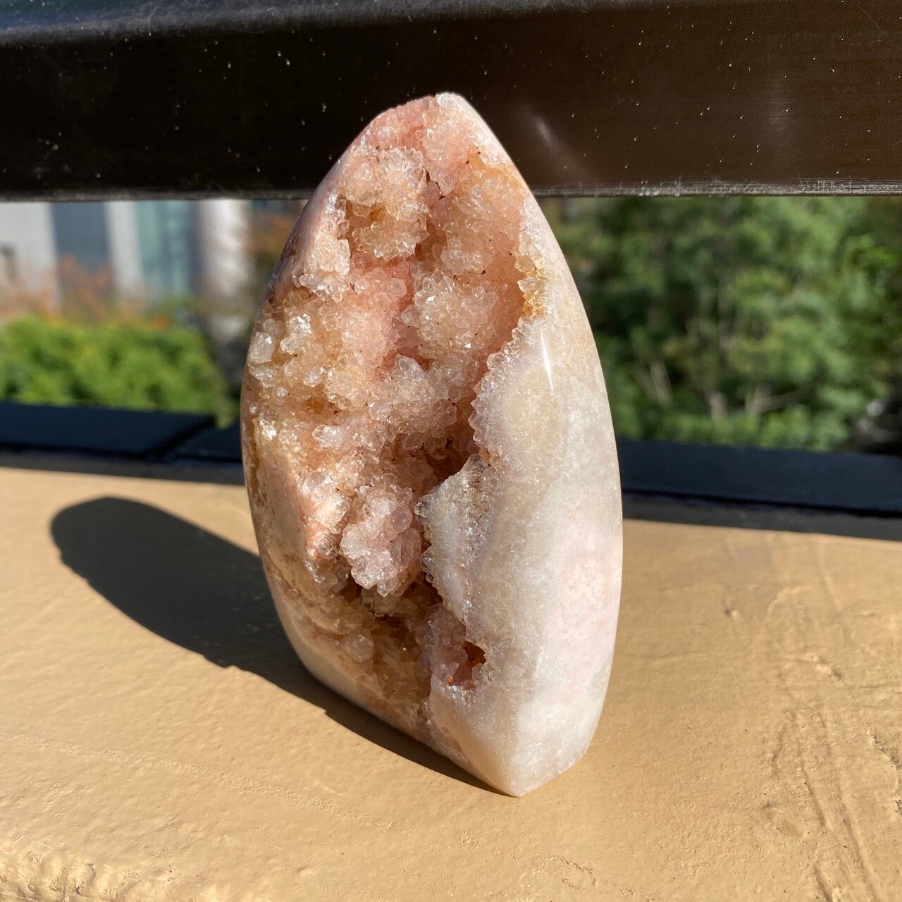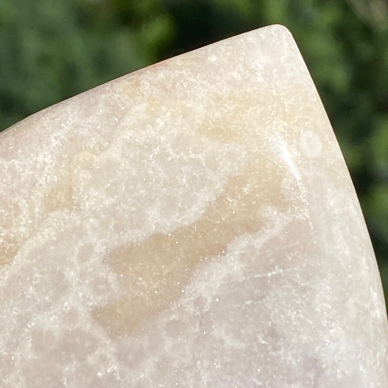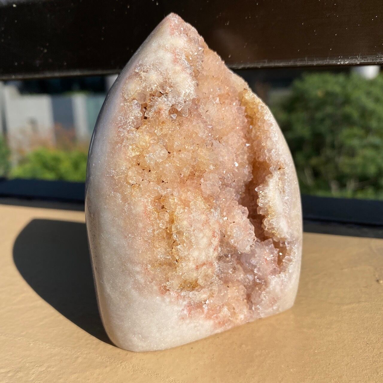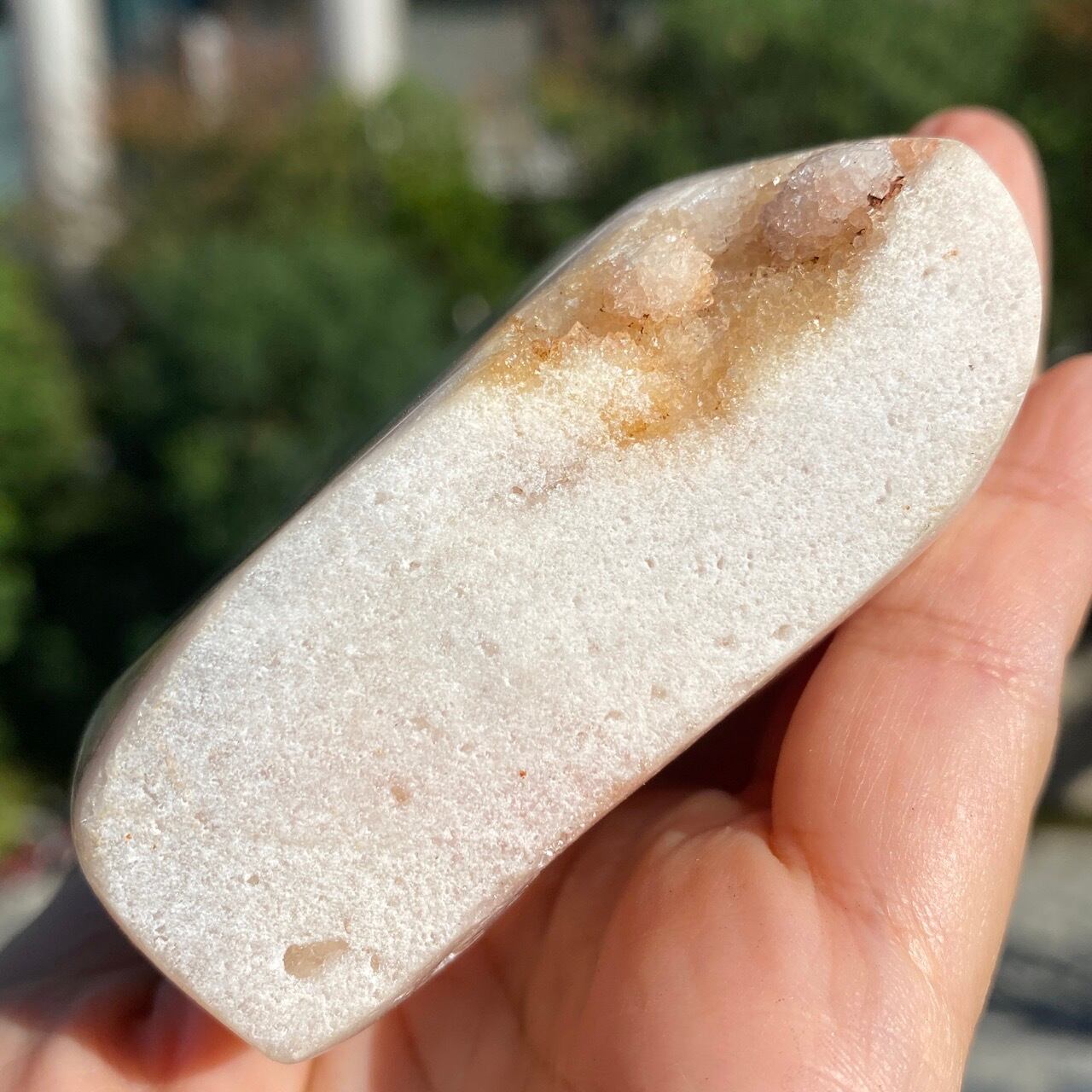 乳白色に近いミルクティー色のベースに、キラキラと輝くもこもこドゥルージーが前面を覆っているフリーフォーム。洗練された色味とゴージャスなドゥルージーが素敵にインテリアを装飾してくれます。屋外で撮影した画像はドライでマットな質感のように見えますが、実際は表面は研磨されていてつるっとしていますし、ドゥルージーはキラキラと眩い光を放っています。