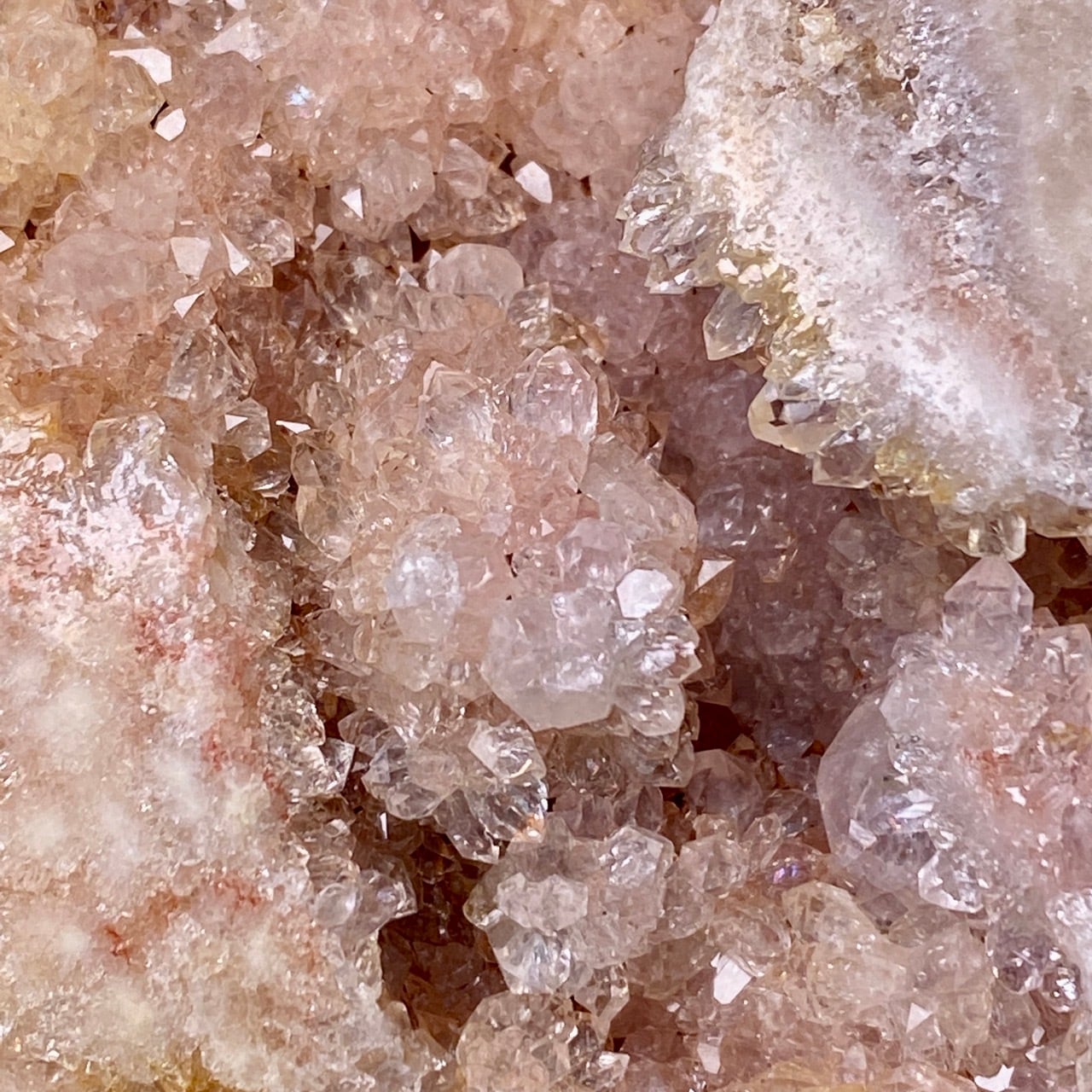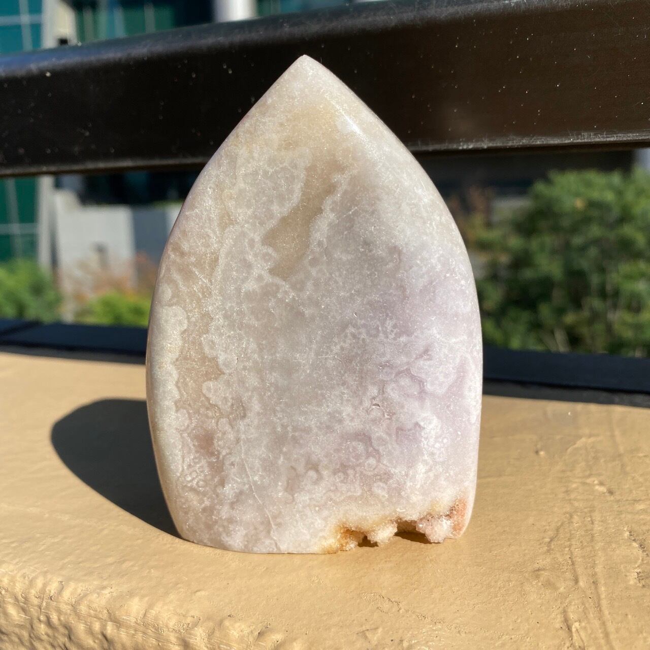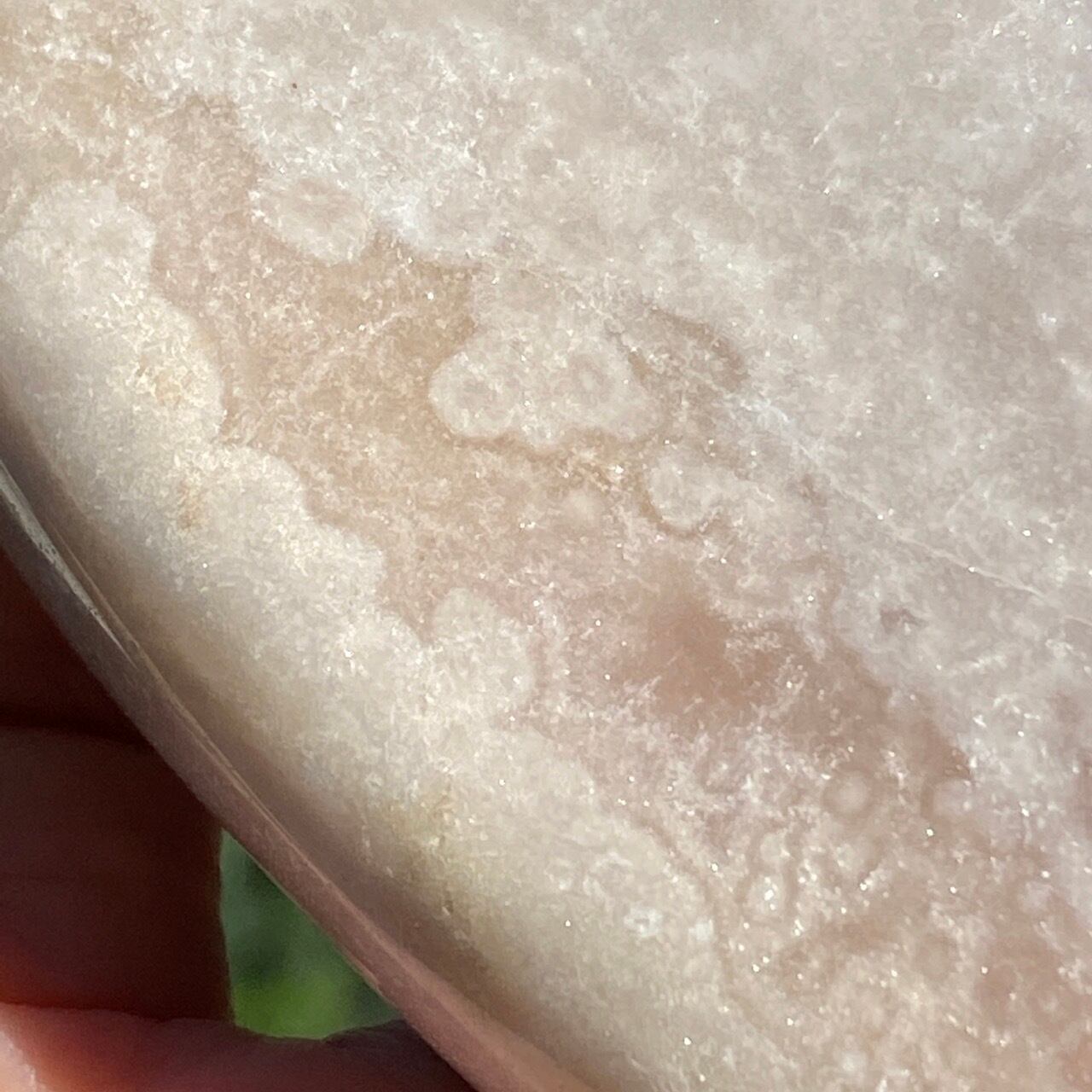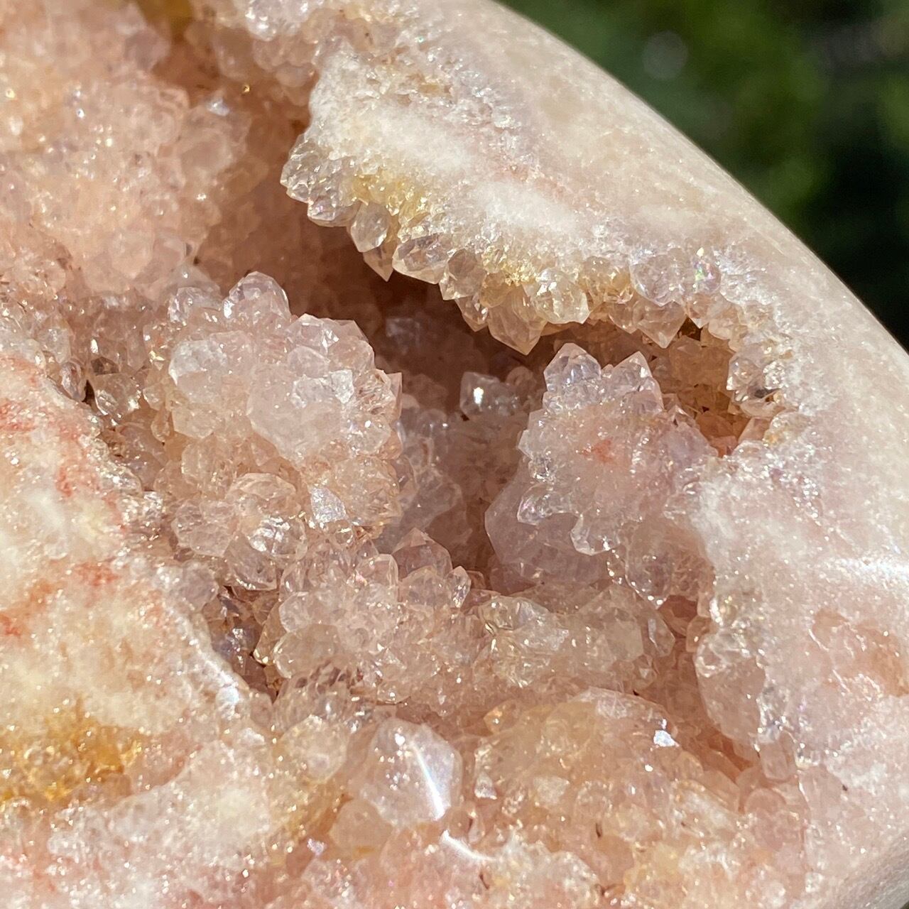 乳白色に近いミルクティー色のベースに、キラキラと輝くもこもこドゥルージーが前面を覆っているフリーフォーム。洗練された色味とゴージャスなドゥルージーが素敵にインテリアを装飾してくれます。屋外で撮影した画像はドライでマットな質感のように見えますが、実際は表面は研磨されていてつるっとしていますし、ドゥルージーはキラキラと眩い光を放っています。
