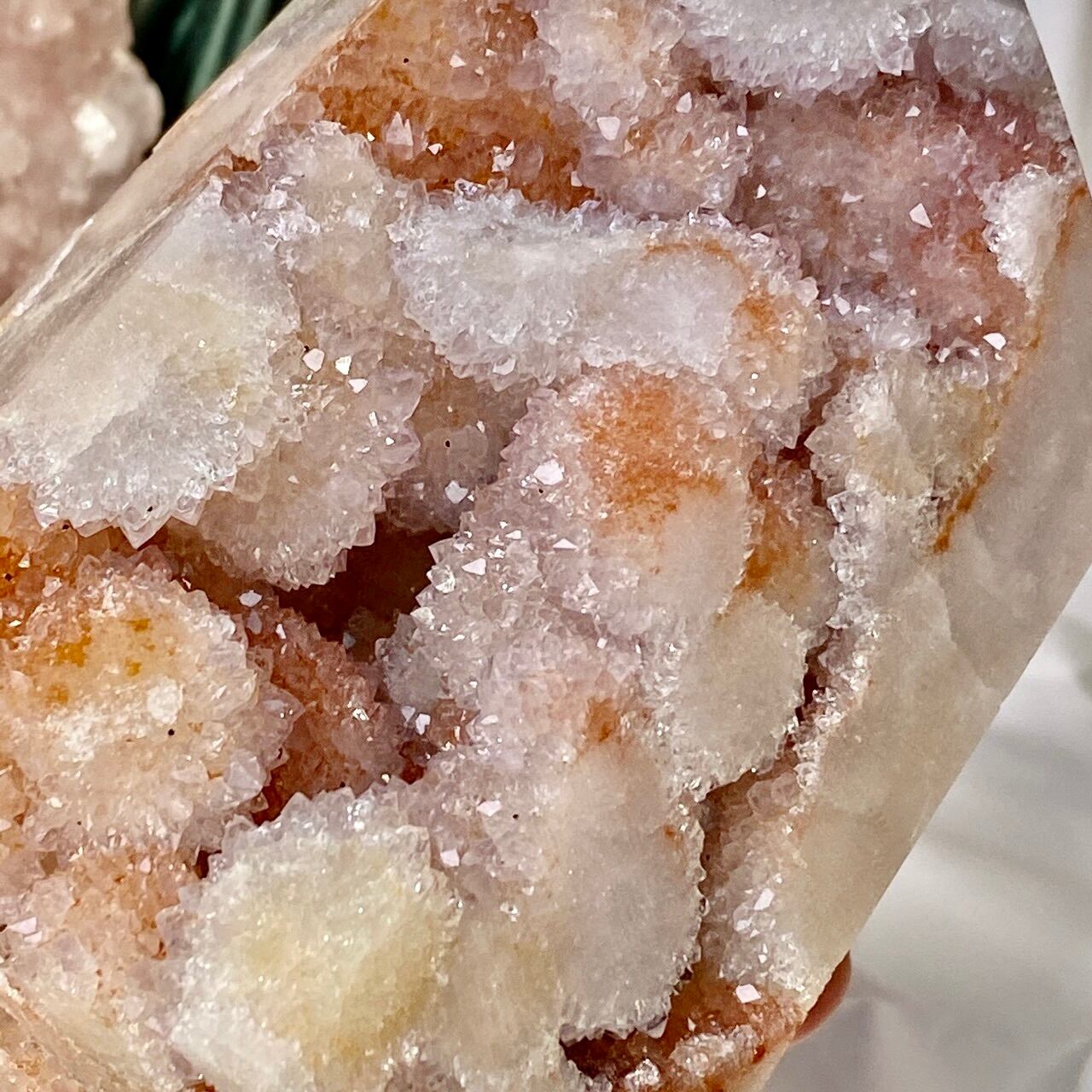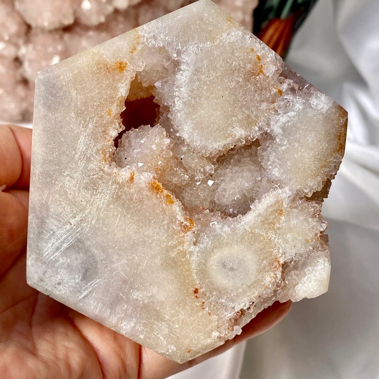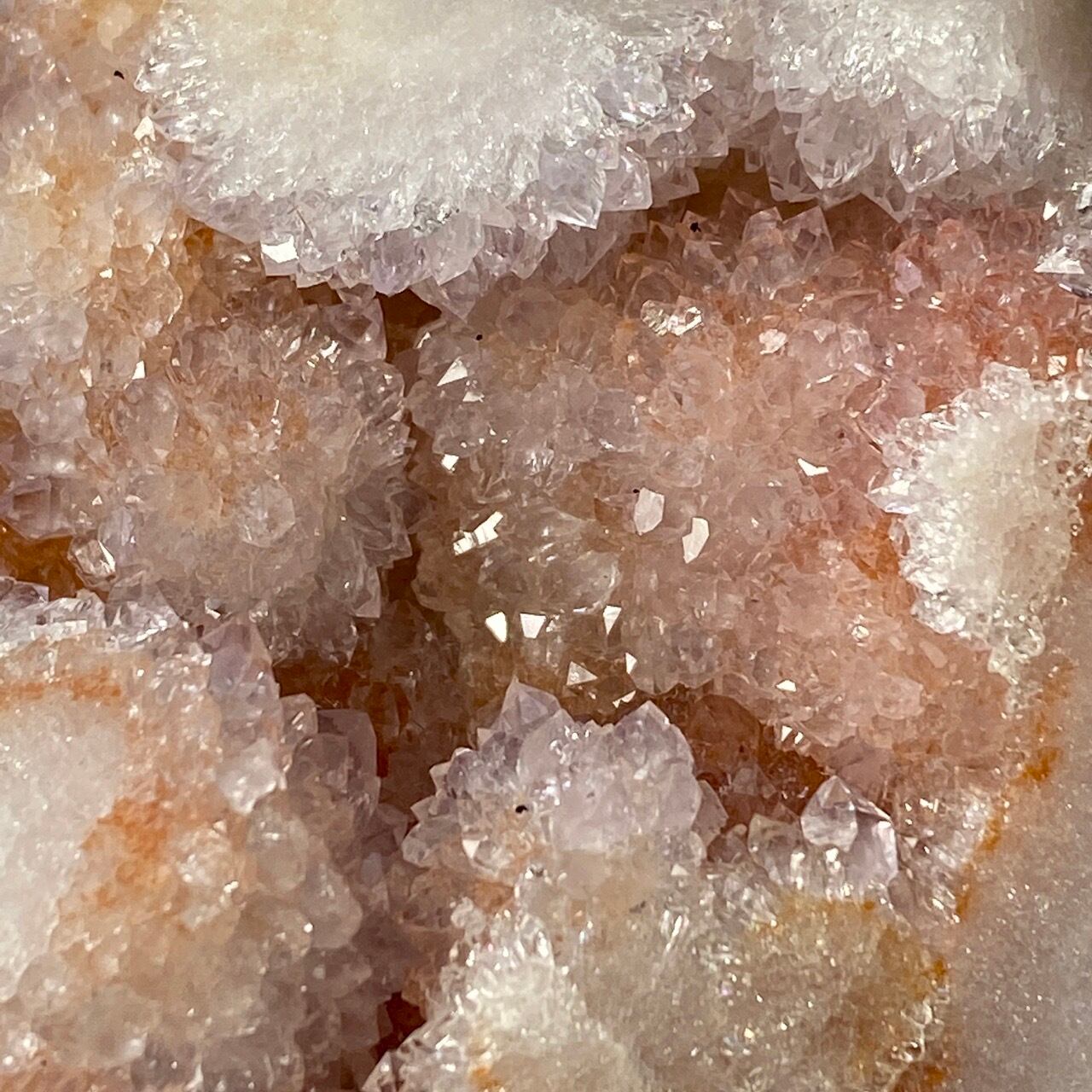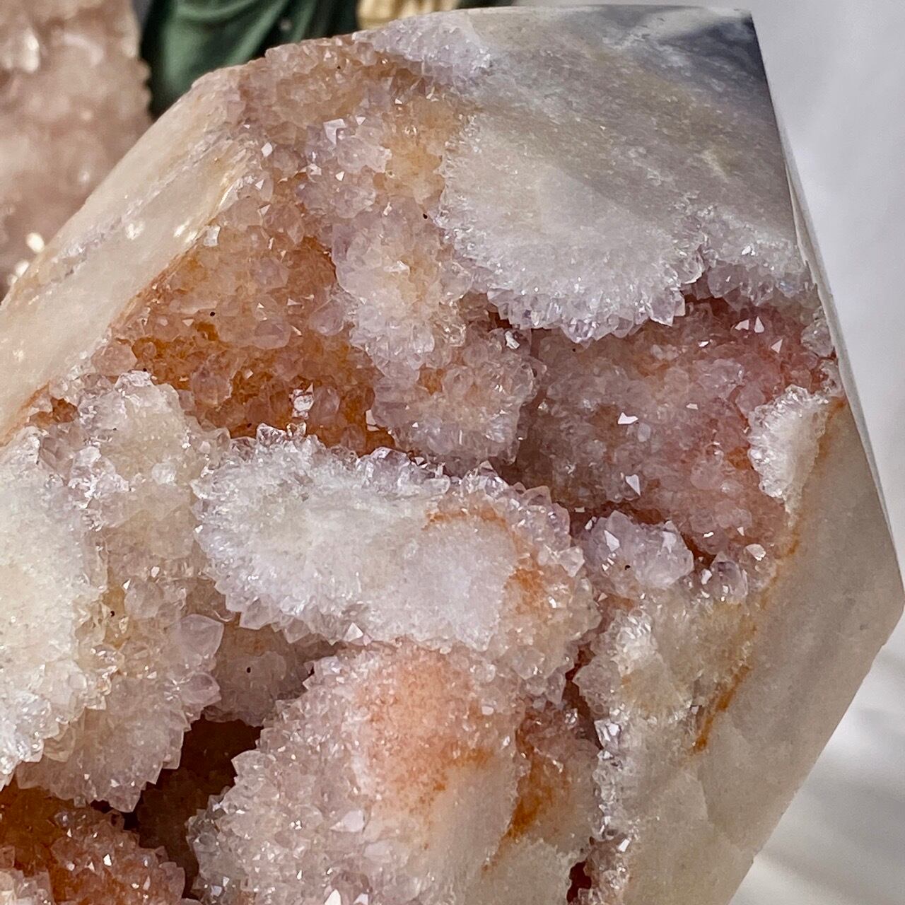 だ、だ、大好きなbotryoidal (ブドウ状の)ドゥルージーが溢れんばかりに所狭しと並んでいるゴージャスな子です。このドゥルージーを眺めていると、昭和に流行ったポンポンのトリムを想起させるのは自分だけでしょうか?眩い光を放つ金平糖の様なドゥルージーが前面より顔を覗かせているだけでなく、他の面や六角形の底面からも顔を出しています。