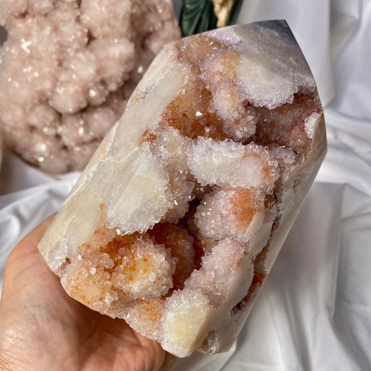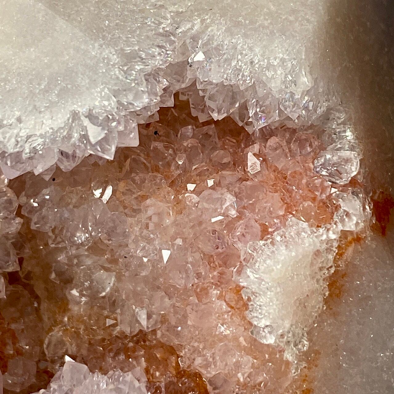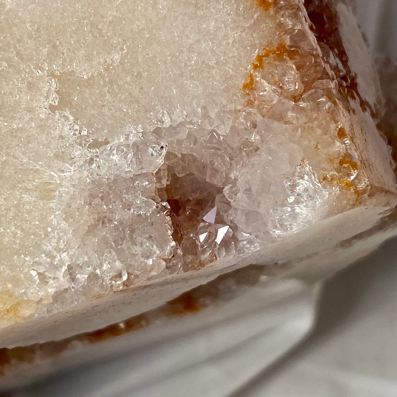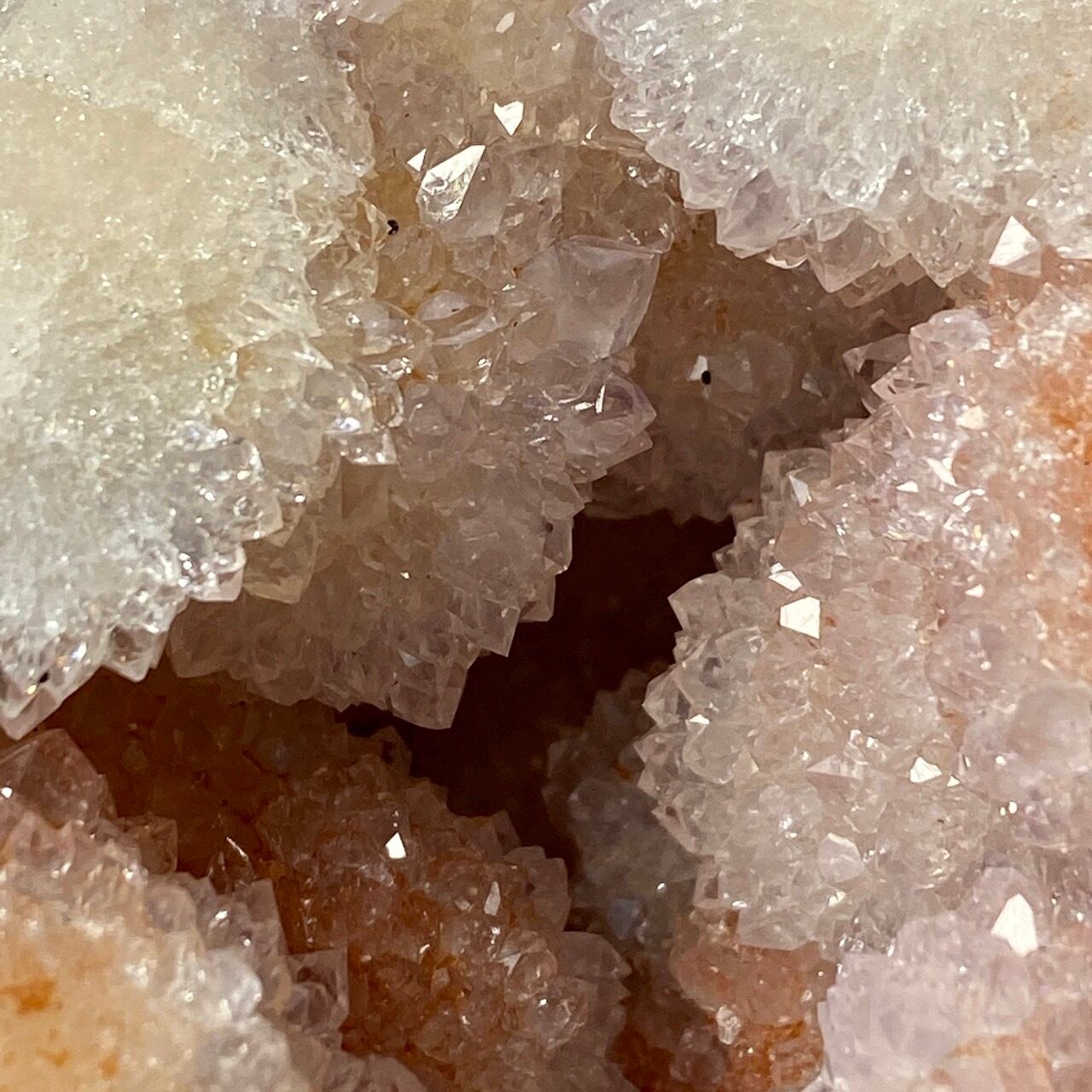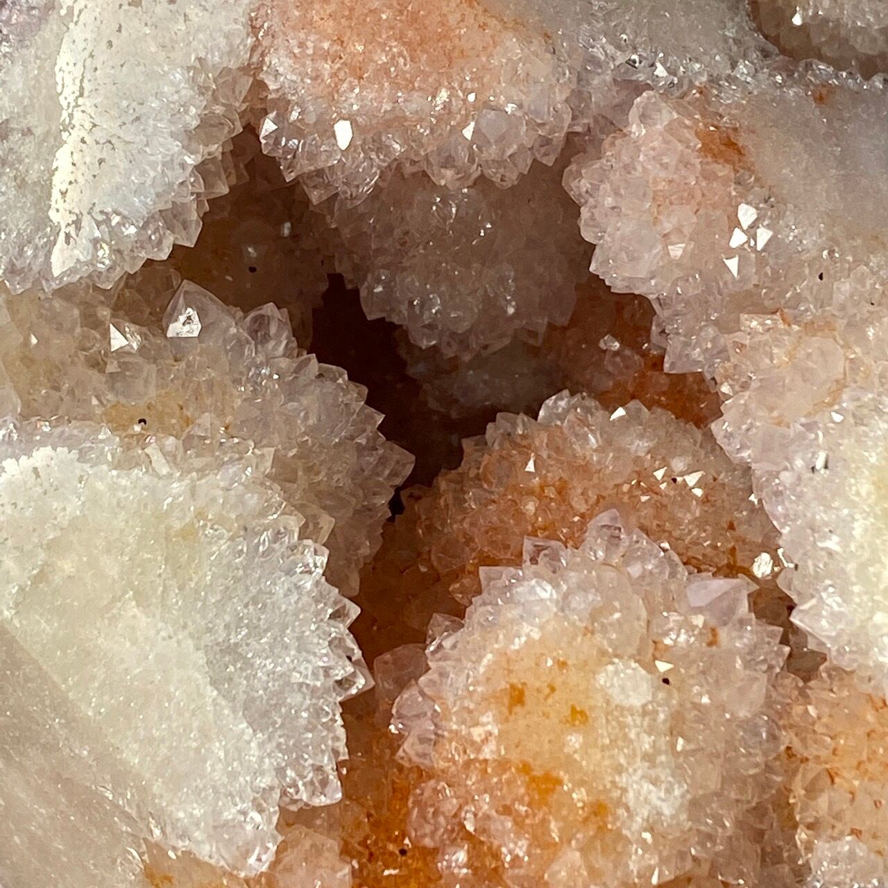 だ、だ、大好きなbotryoidal (ブドウ状の)ドゥルージーが溢れんばかりに所狭しと並んでいるゴージャスな子です。このドゥルージーを眺めていると、昭和に流行ったポンポンのトリムを想起させるのは自分だけでしょうか?眩い光を放つ金平糖の様なドゥルージーが前面より顔を覗かせているだけでなく、他の面や六角形の底面からも顔を出しています。