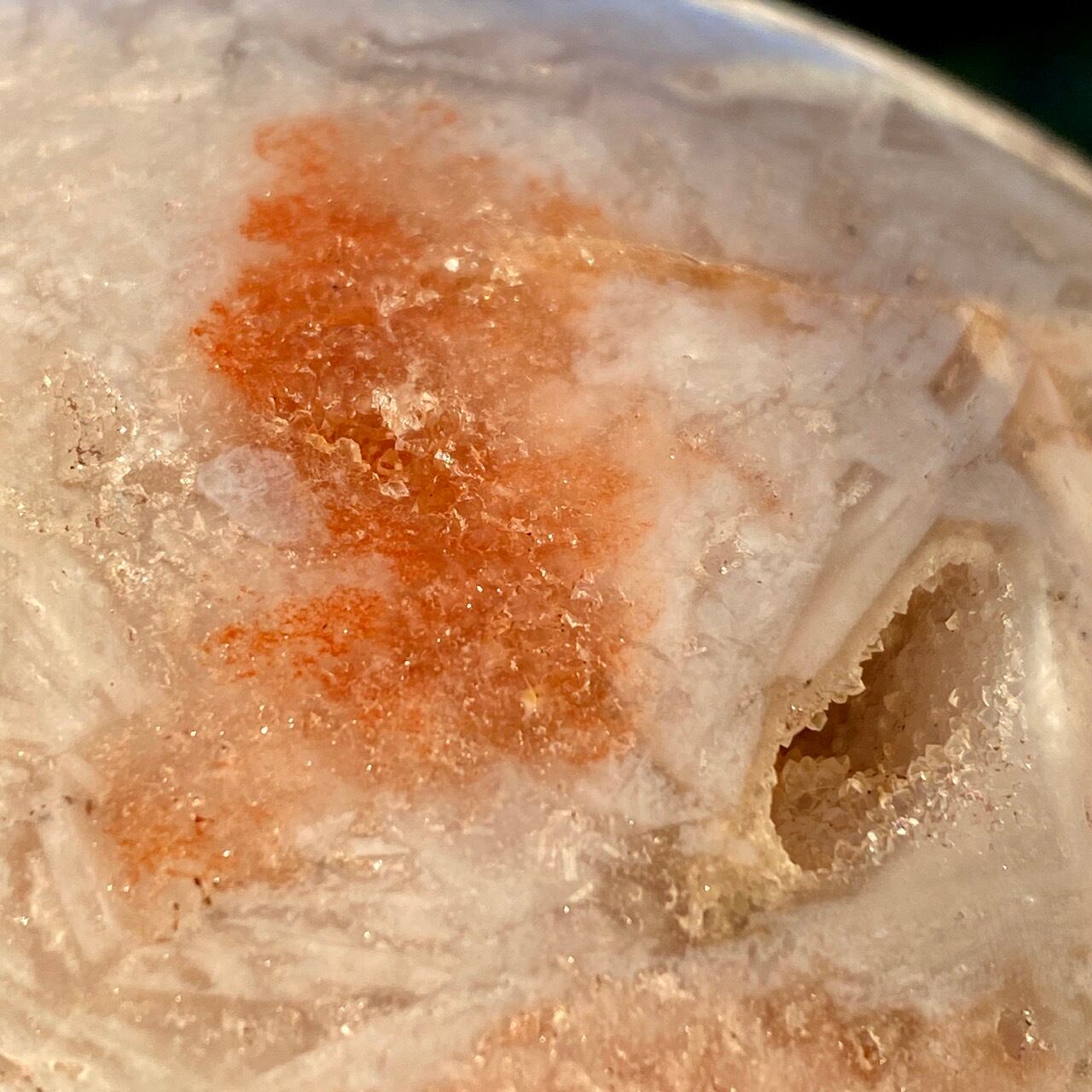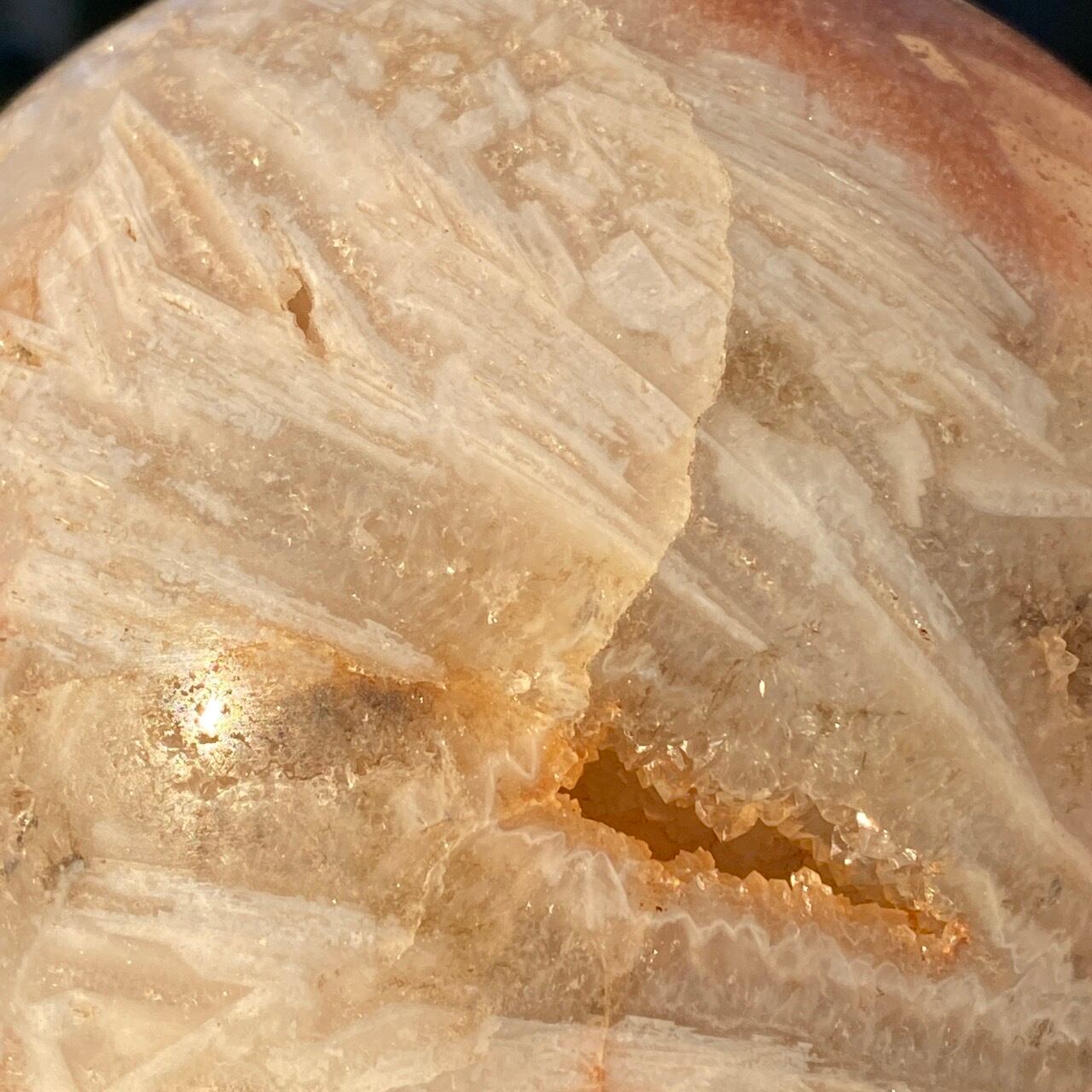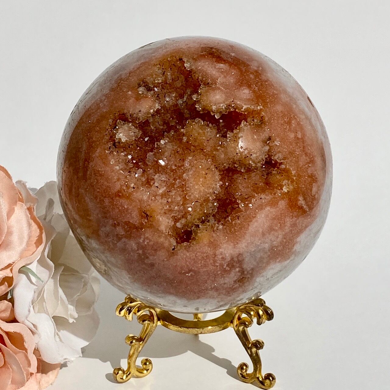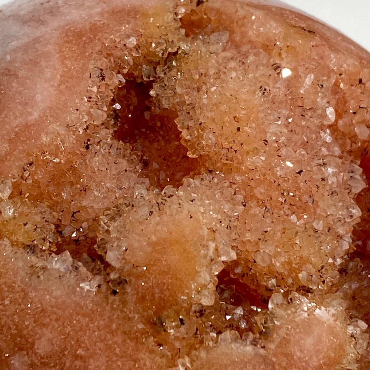 存在感のある、とにかくゴージャスなドゥルージーピンクアメシストのスフィアです。ドゥルージーを取り囲む、今にも溶け出しそうな蜜の様なアプリコット色のシャーベット(喩え)。そしてそこから覗くきらっきらのもこもこドゥルージー。ボディは白とベージュが混ざった様な洗練された色味で、幾何学模様やアプリコット色のパッチ、そしてキャビティからゴールデンカラーのざくざくした結晶が見られます。