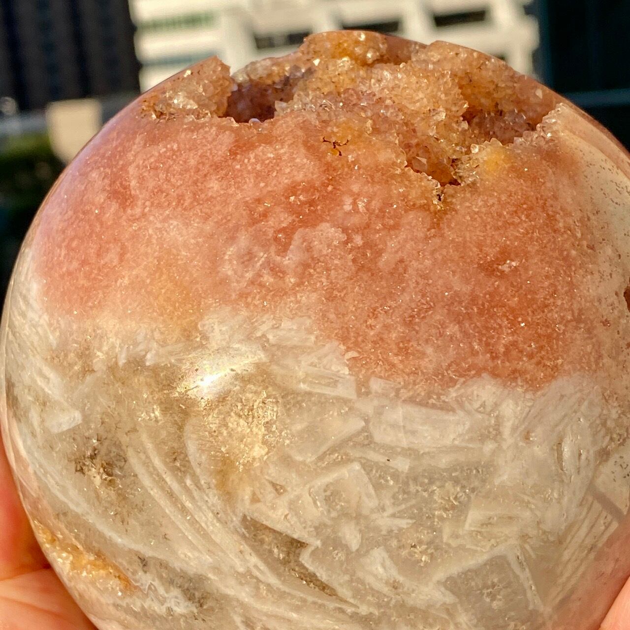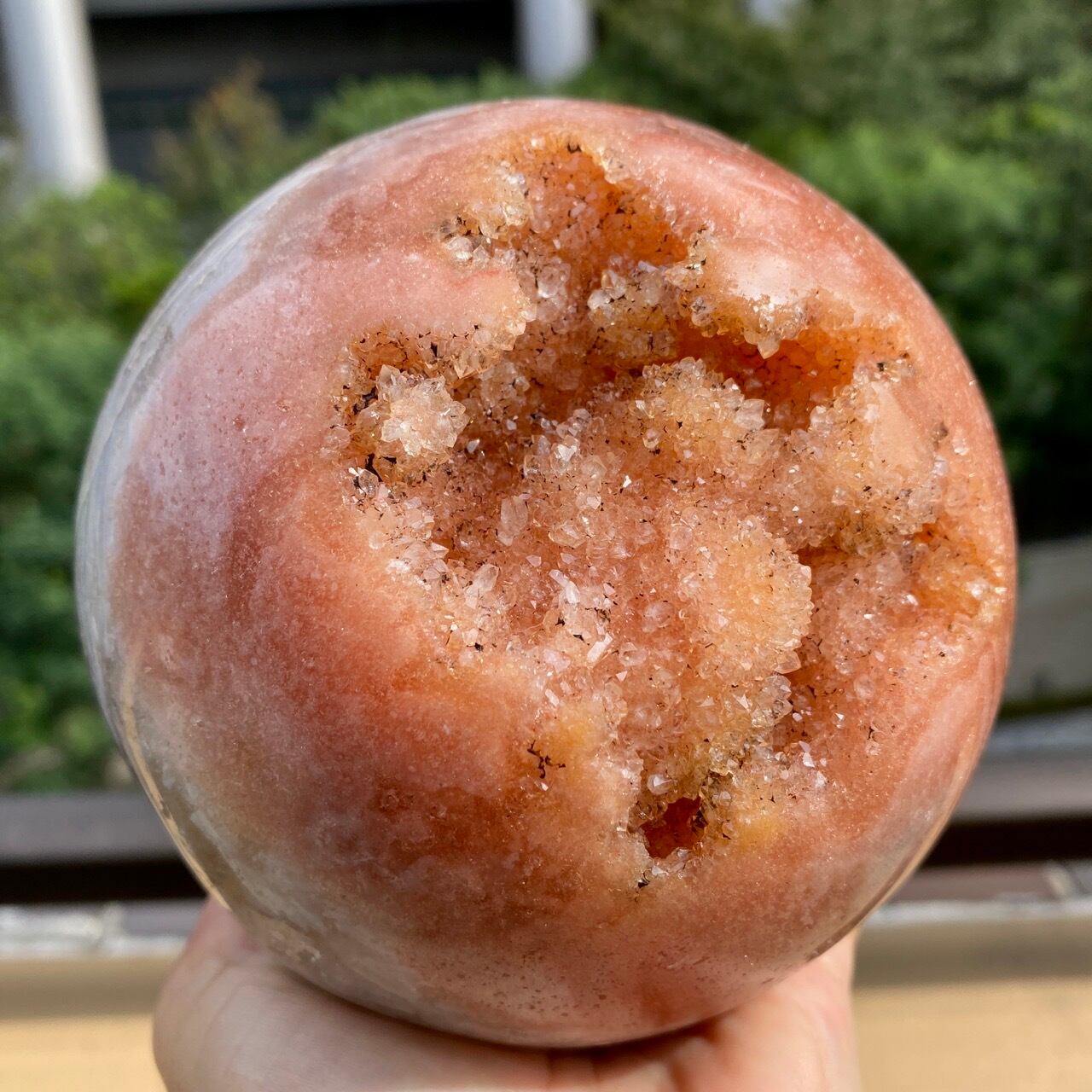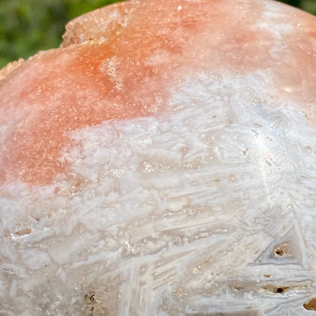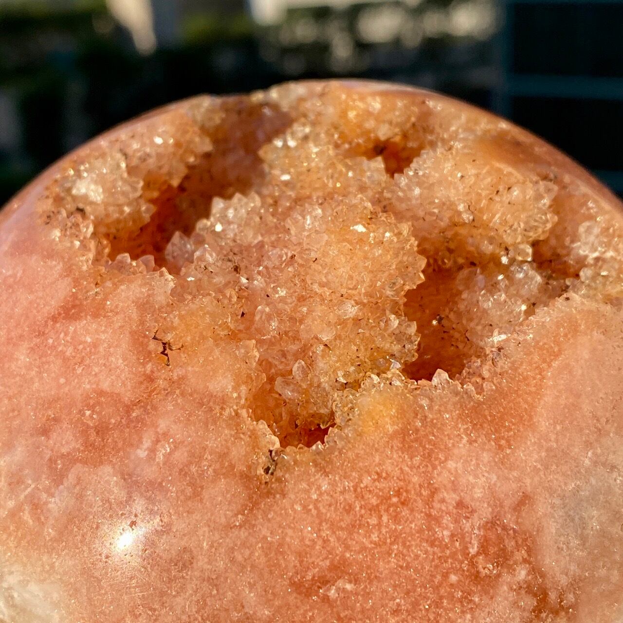 存在感のある、とにかくゴージャスなドゥルージーピンクアメシストのスフィアです。ドゥルージーを取り囲む、今にも溶け出しそうな蜜の様なアプリコット色のシャーベット(喩え)。そしてそこから覗くきらっきらのもこもこドゥルージー。ボディは白とベージュが混ざった様な洗練された色味で、幾何学模様やアプリコット色のパッチ、そしてキャビティからゴールデンカラーのざくざくした結晶が見られます。
