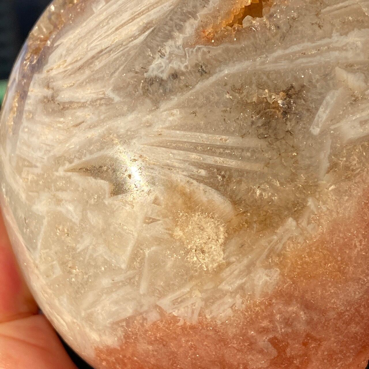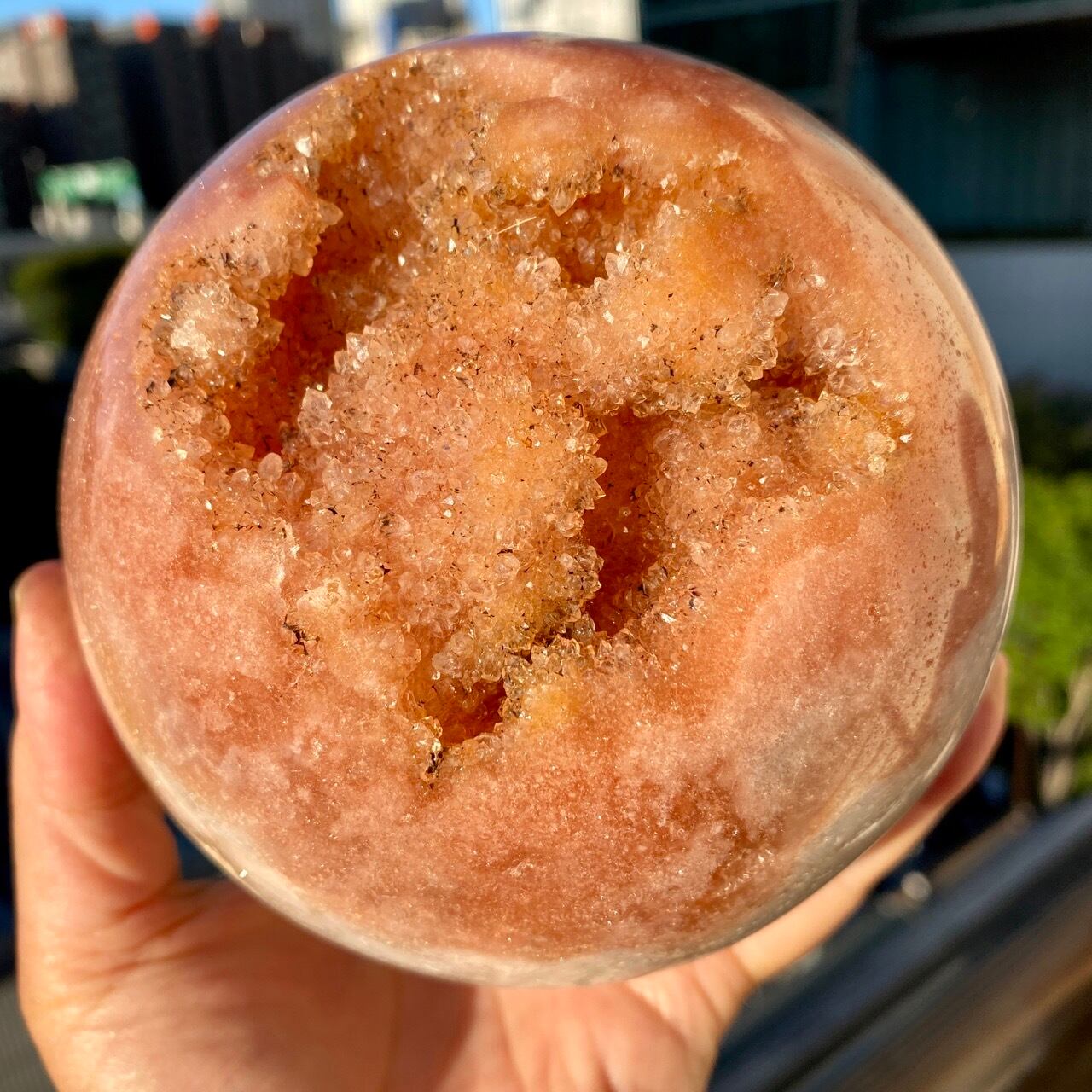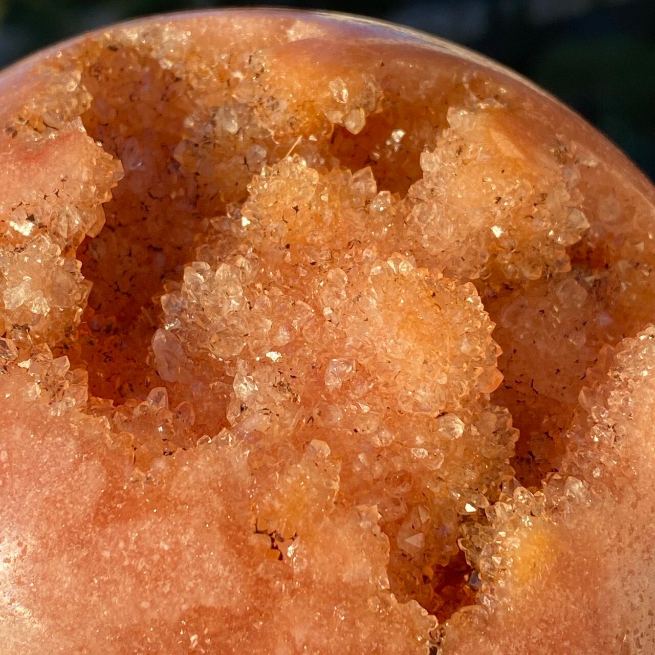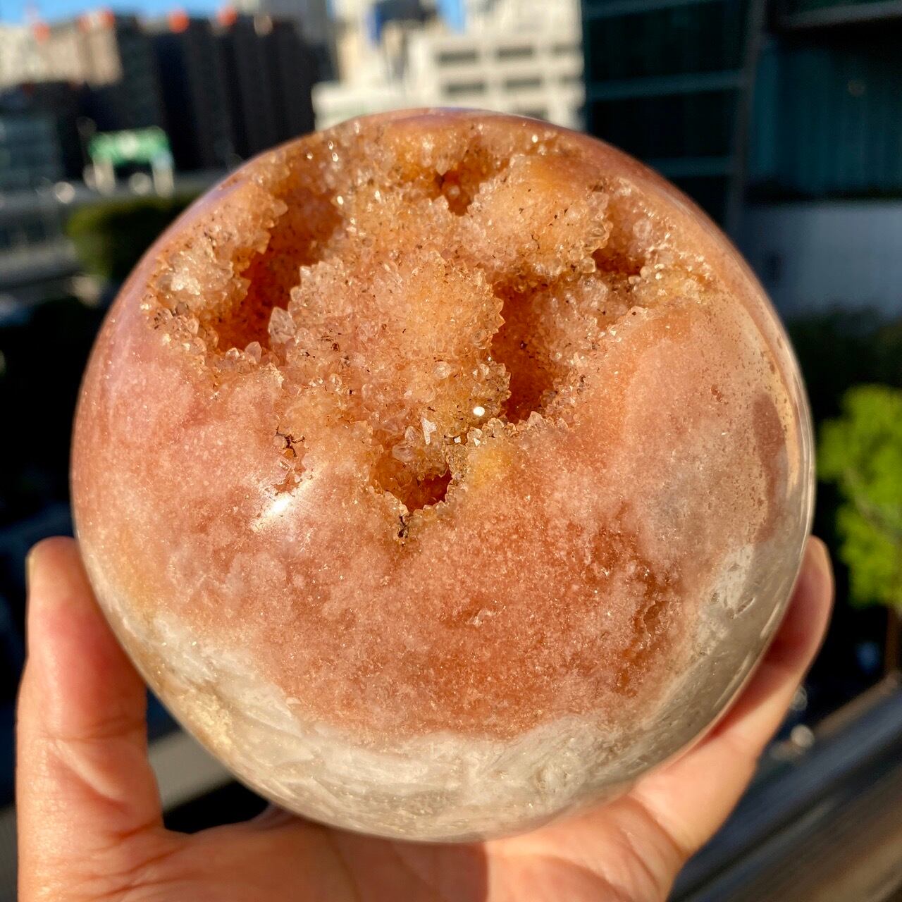 存在感のある、とにかくゴージャスなドゥルージーピンクアメシストのスフィアです。ドゥルージーを取り囲む、今にも溶け出しそうな蜜の様なアプリコット色のシャーベット(喩え)。そしてそこから覗くきらっきらのもこもこドゥルージー。ボディは白とベージュが混ざった様な洗練された色味で、幾何学模様やアプリコット色のパッチ、そしてキャビティからゴールデンカラーのざくざくした結晶が見られます。
