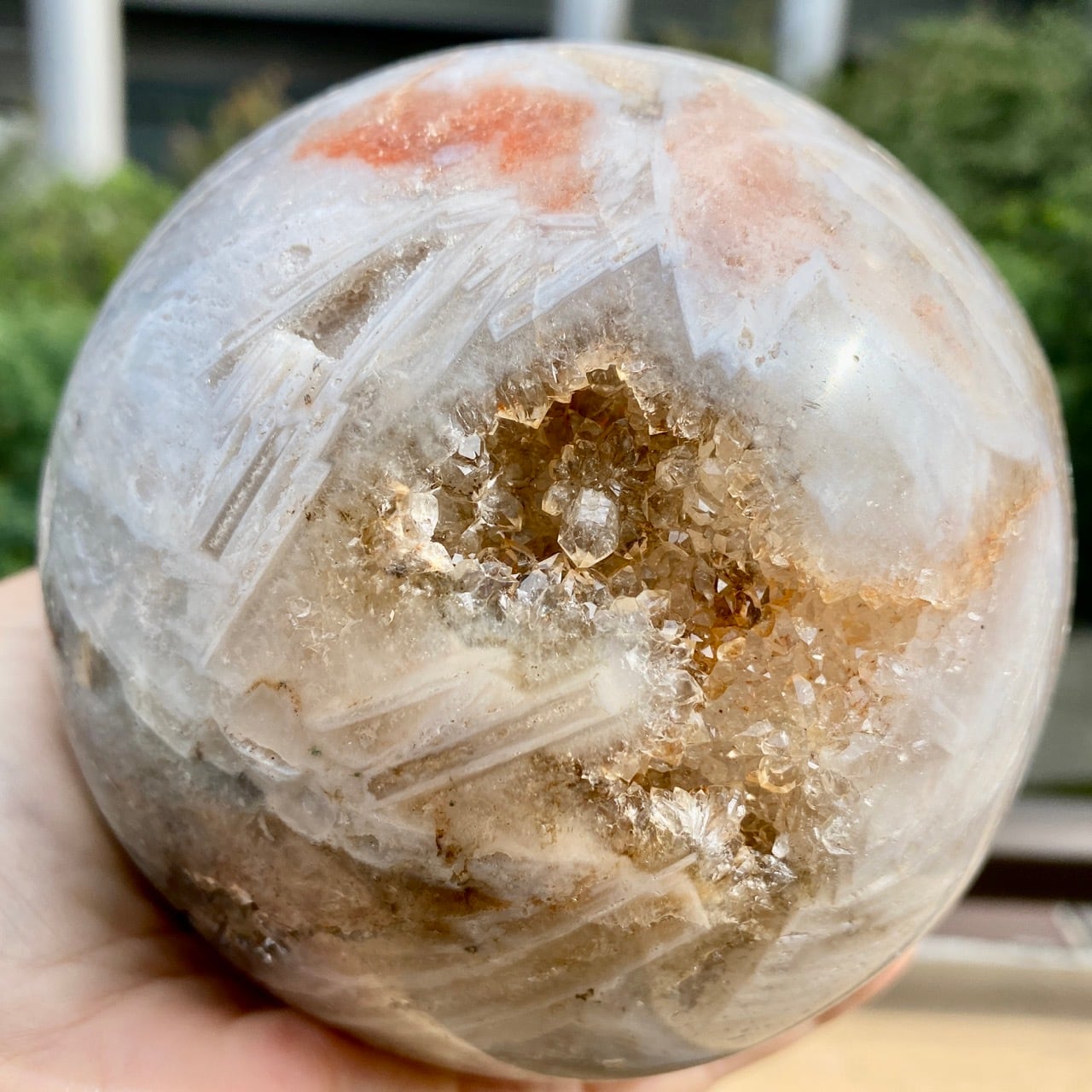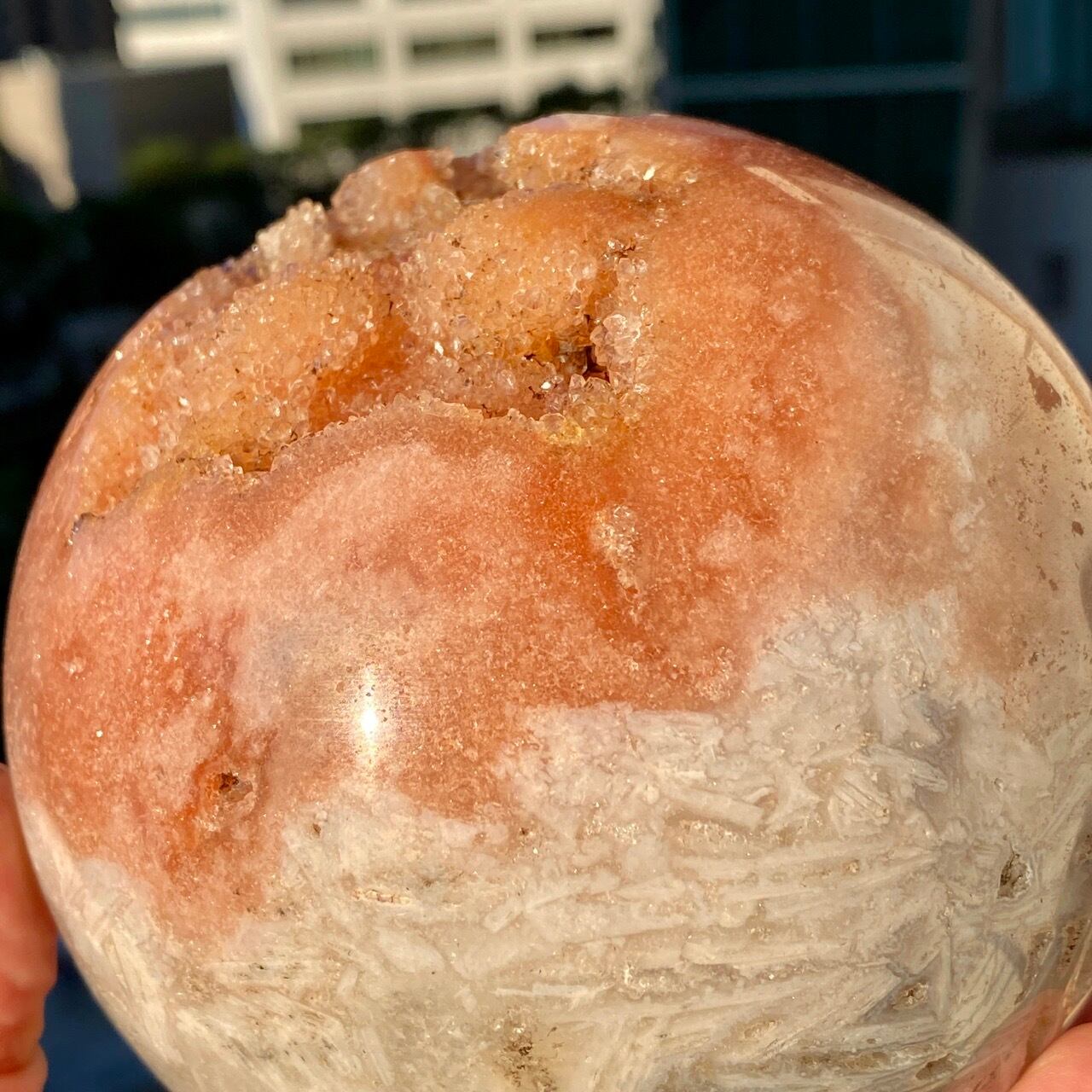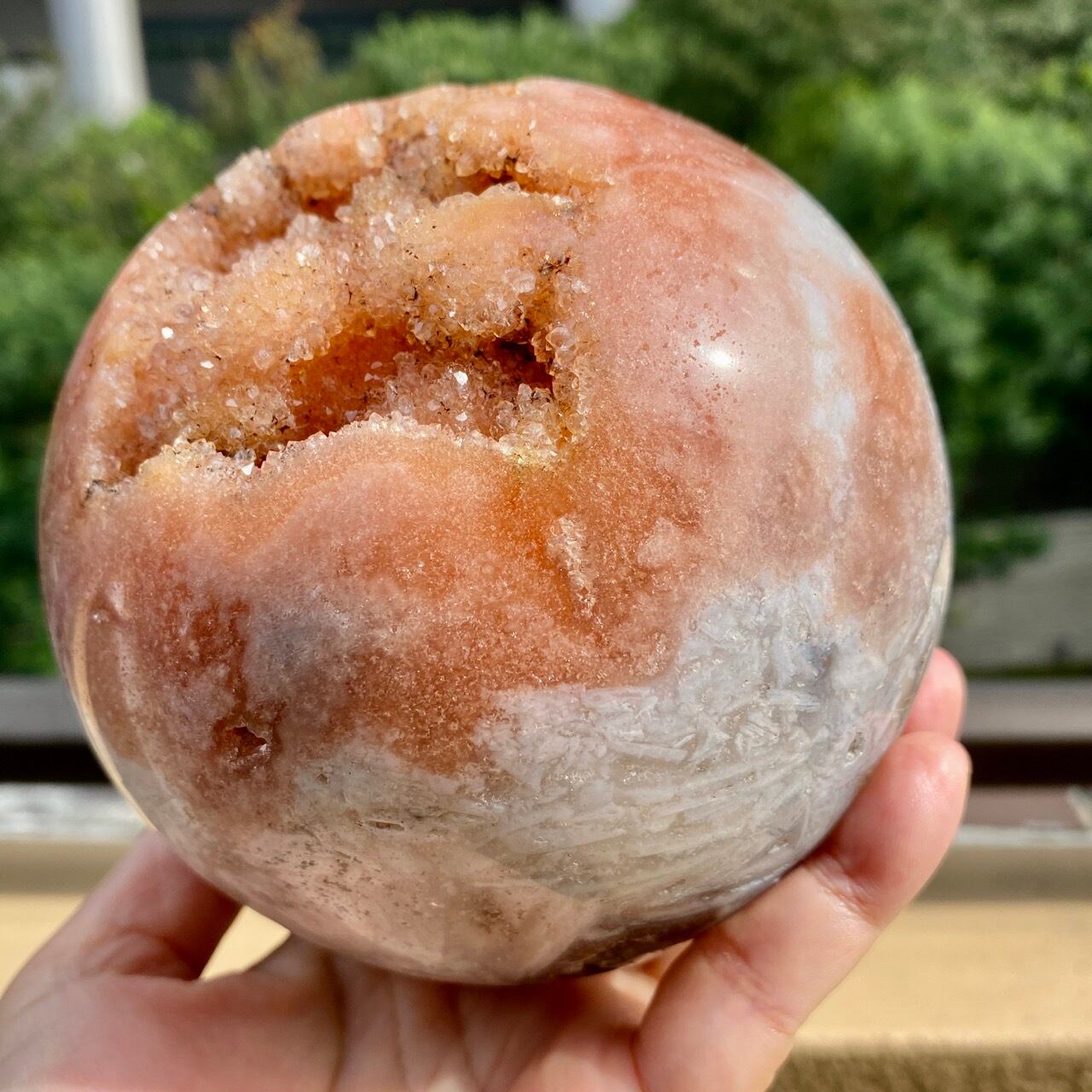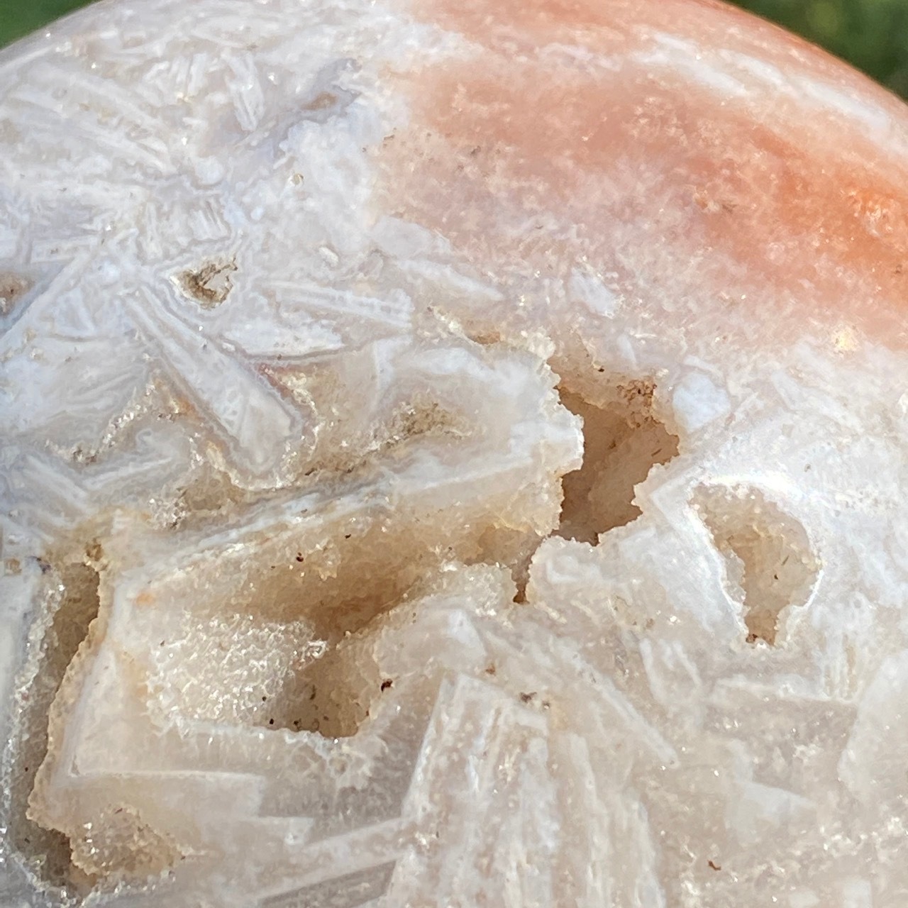 存在感のある、とにかくゴージャスなドゥルージーピンクアメシストのスフィアです。ドゥルージーを取り囲む、今にも溶け出しそうな蜜の様なアプリコット色のシャーベット(喩え)。そしてそこから覗くきらっきらのもこもこドゥルージー。ボディは白とベージュが混ざった様な洗練された色味で、幾何学模様やアプリコット色のパッチ、そしてキャビティからゴールデンカラーのざくざくした結晶が見られます。