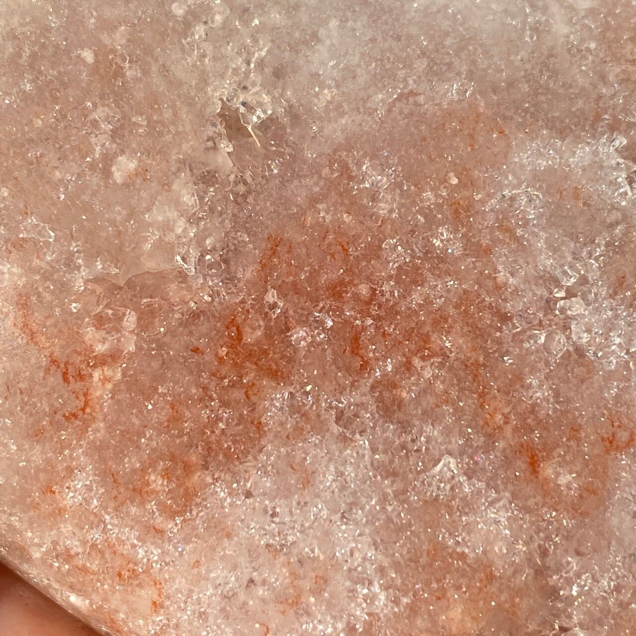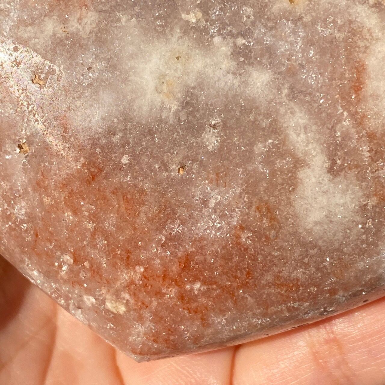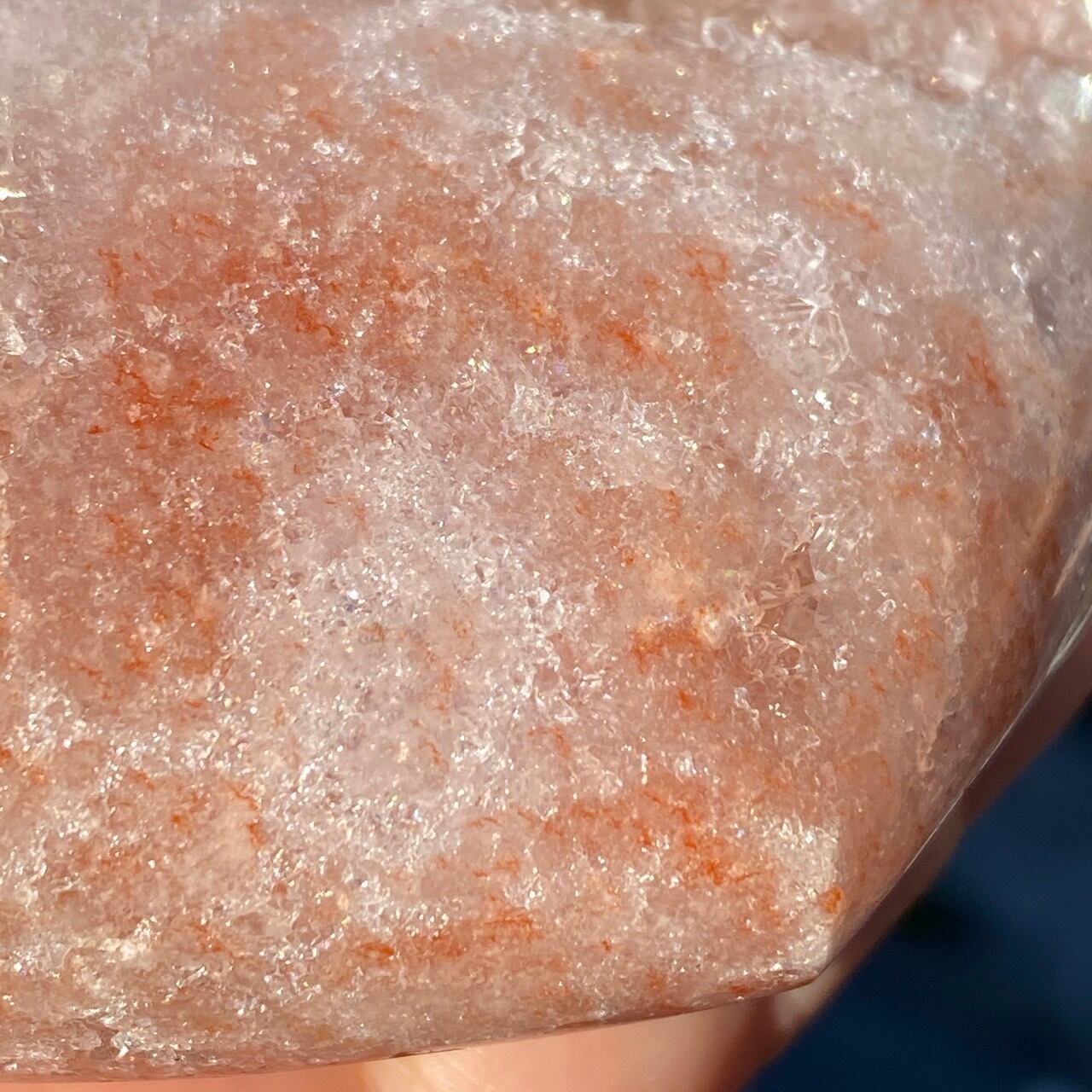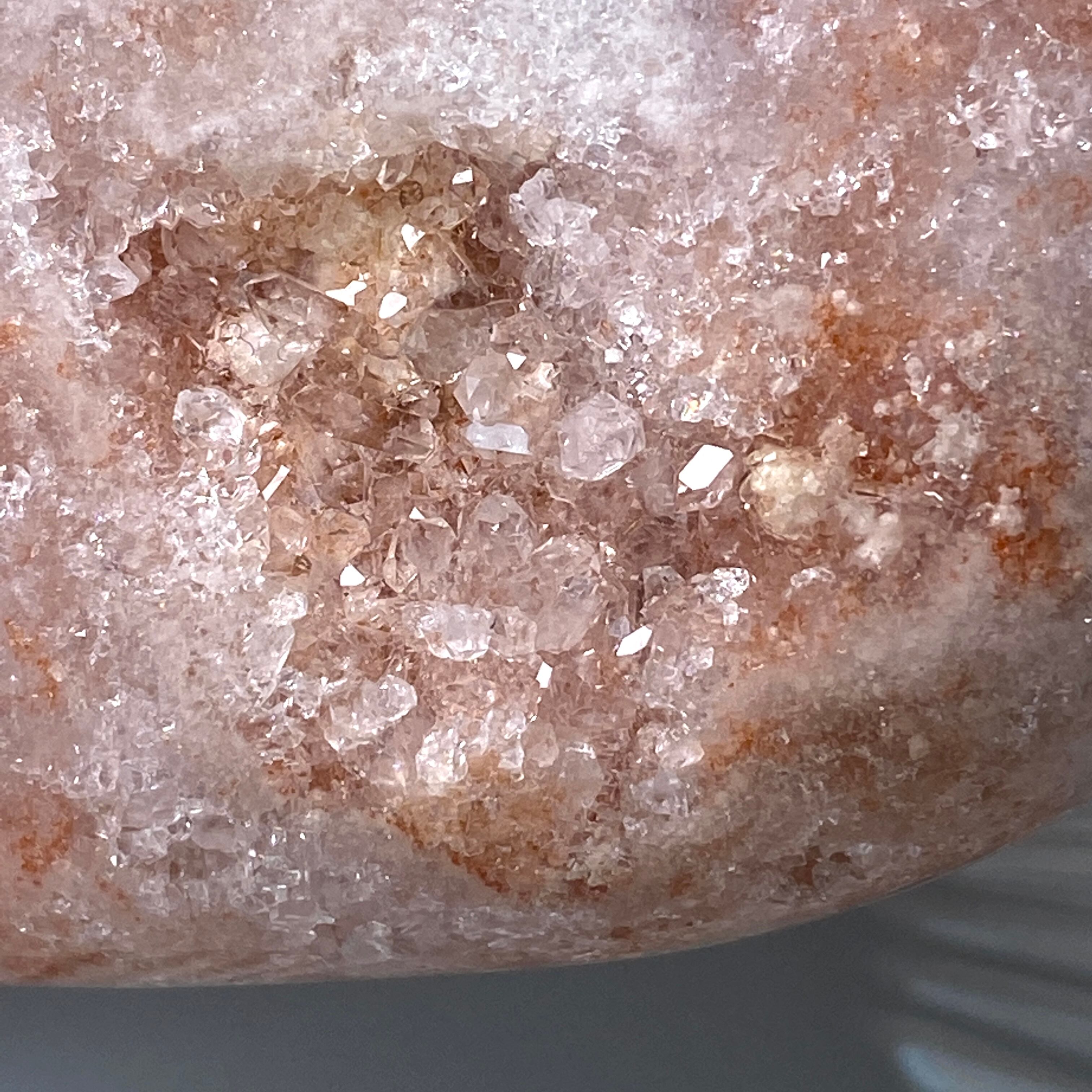 宝石のようなドゥルージーは勿論のこと、全体的にクォーツの結晶がちりばめられていて、きらっきらのとても可憐な子です。表面から見てとれるアプリコットのシャーベットの様な色味と乳白色、そしてクォーツのコンビネーションの調和に、『なんてラブリー♡』と自然に声をあげてしまうようなそんな子です。ぷっくりとした厚みと重量感が癒し系で、優しい色味に自然に自分のハートも広がってしまう感じになります(個人の感想です)。