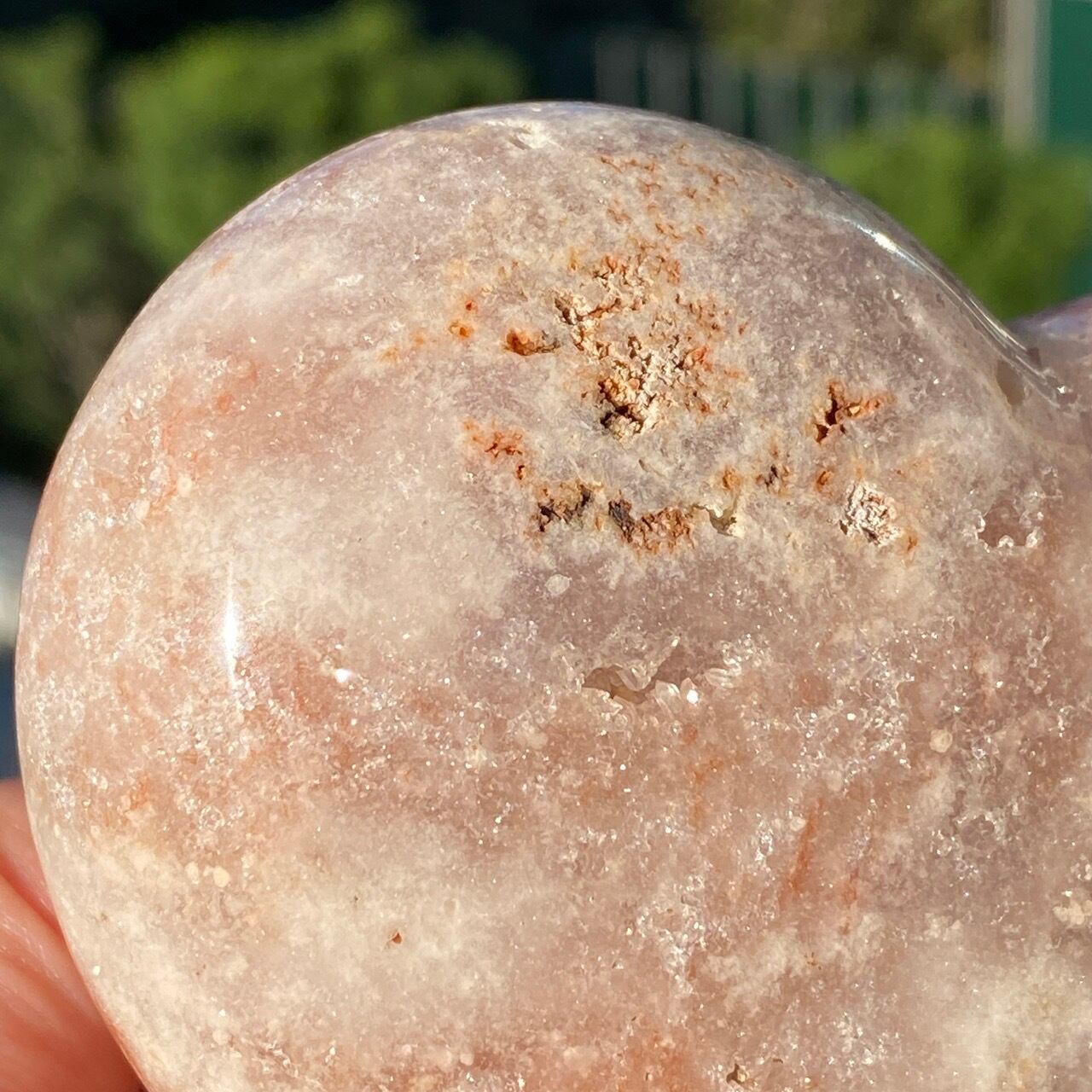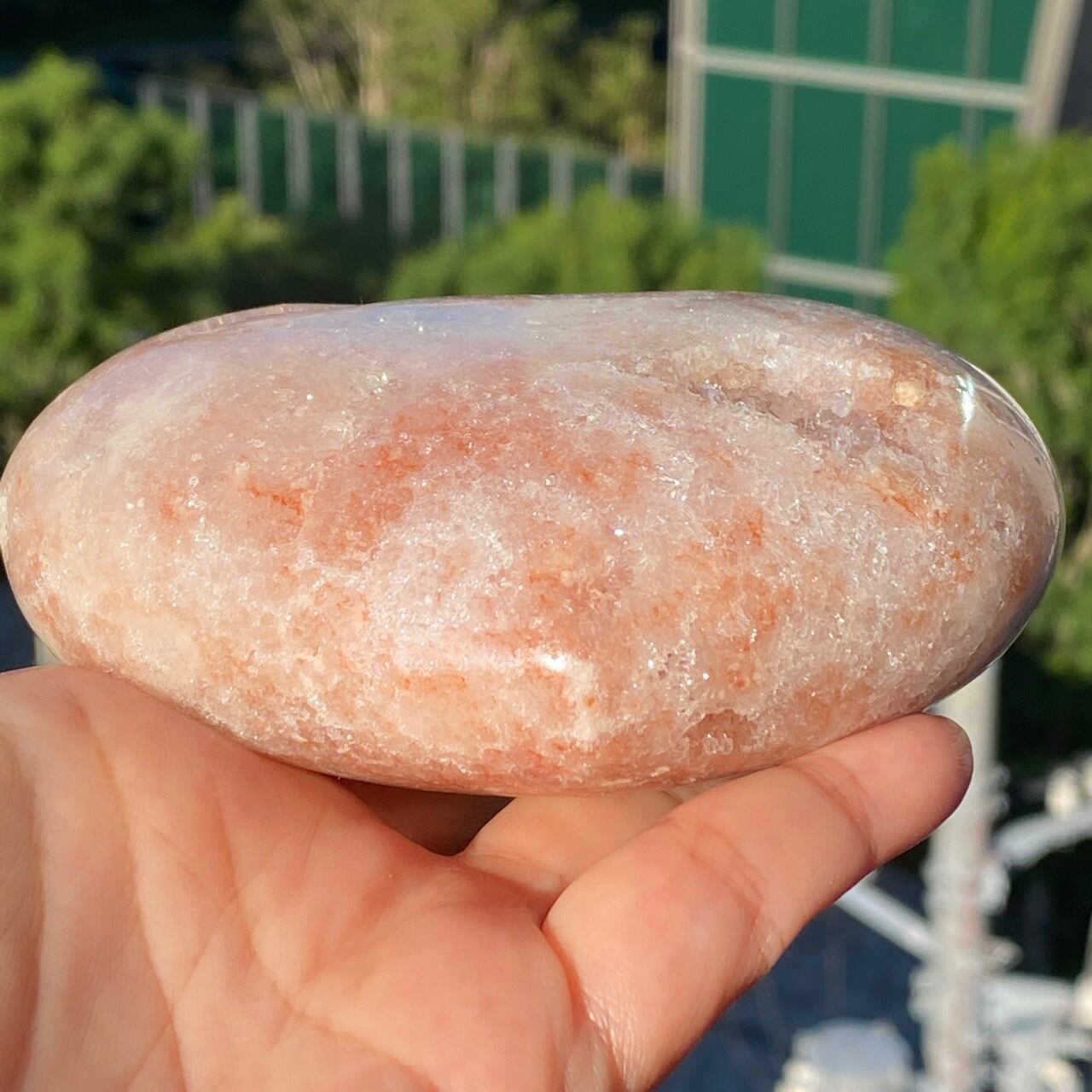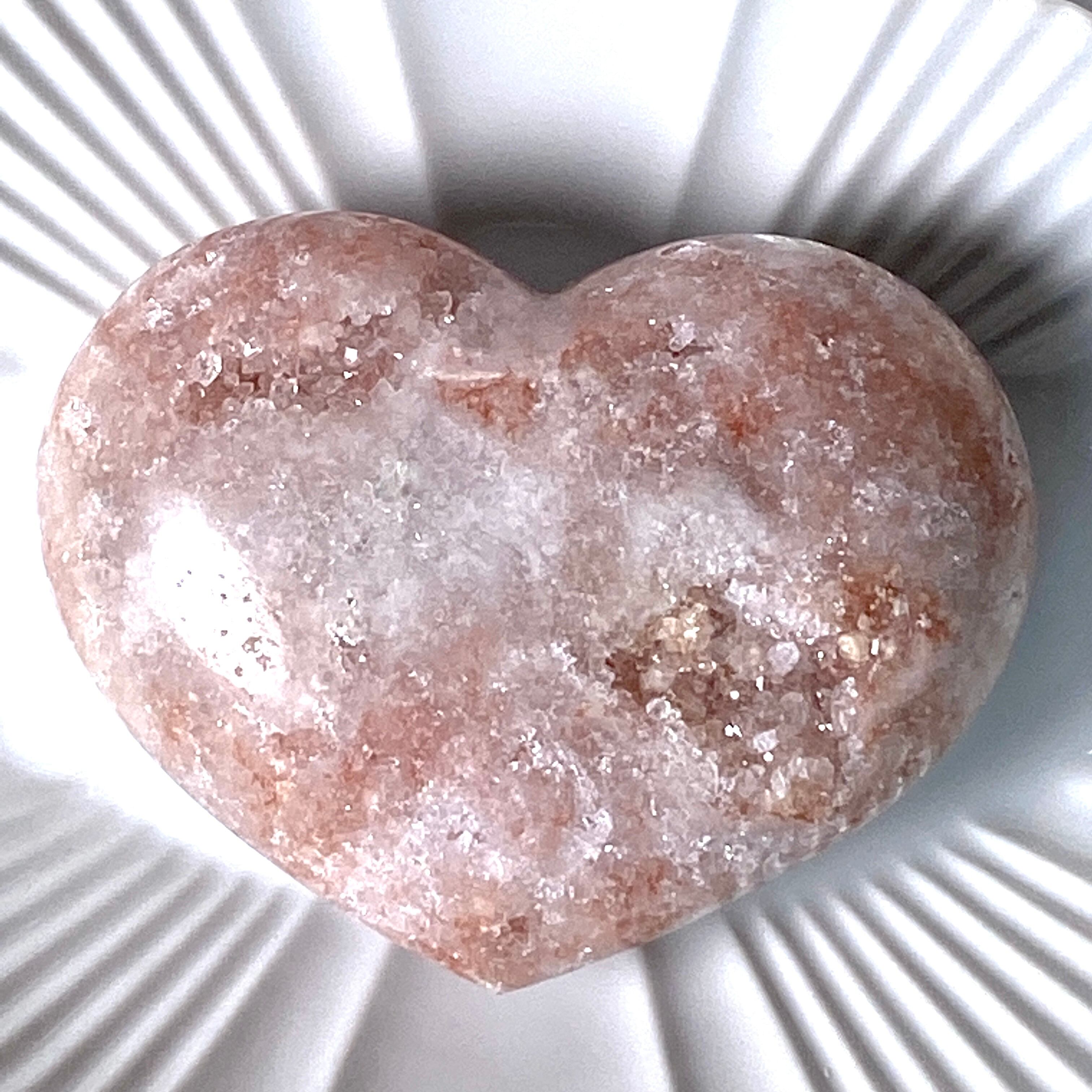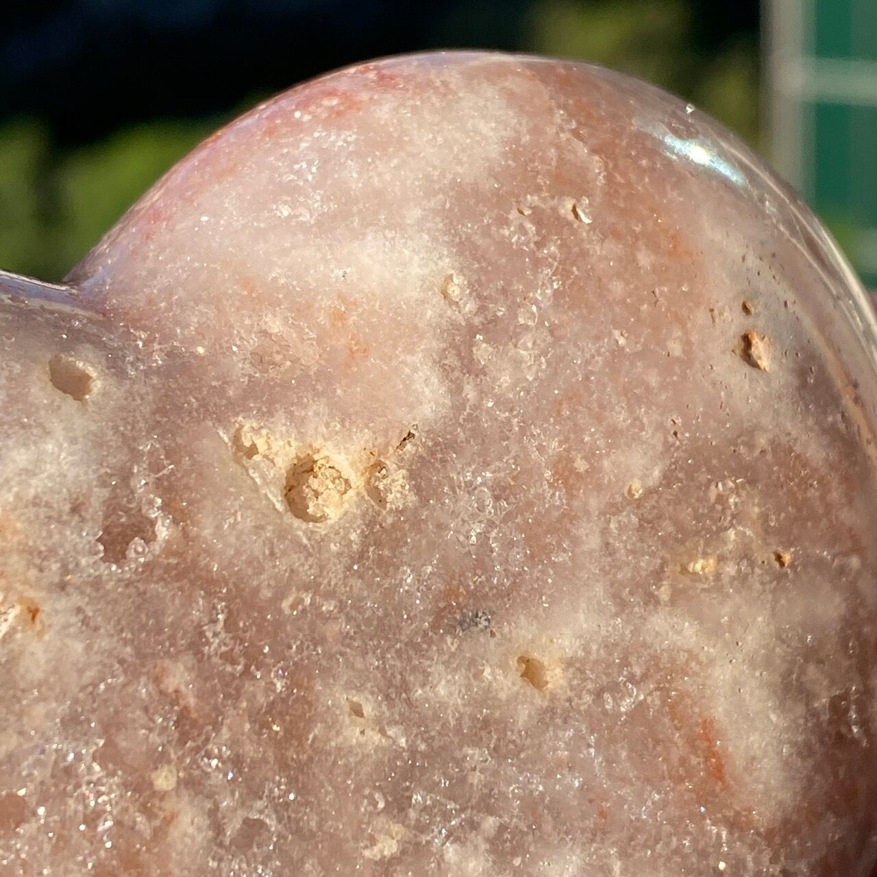 宝石のようなドゥルージーは勿論のこと、全体的にクォーツの結晶がちりばめられていて、きらっきらのとても可憐な子です。表面から見てとれるアプリコットのシャーベットの様な色味と乳白色、そしてクォーツのコンビネーションの調和に、『なんてラブリー♡』と自然に声をあげてしまうようなそんな子です。ぷっくりとした厚みと重量感が癒し系で、優しい色味に自然に自分のハートも広がってしまう感じになります(個人の感想です)。