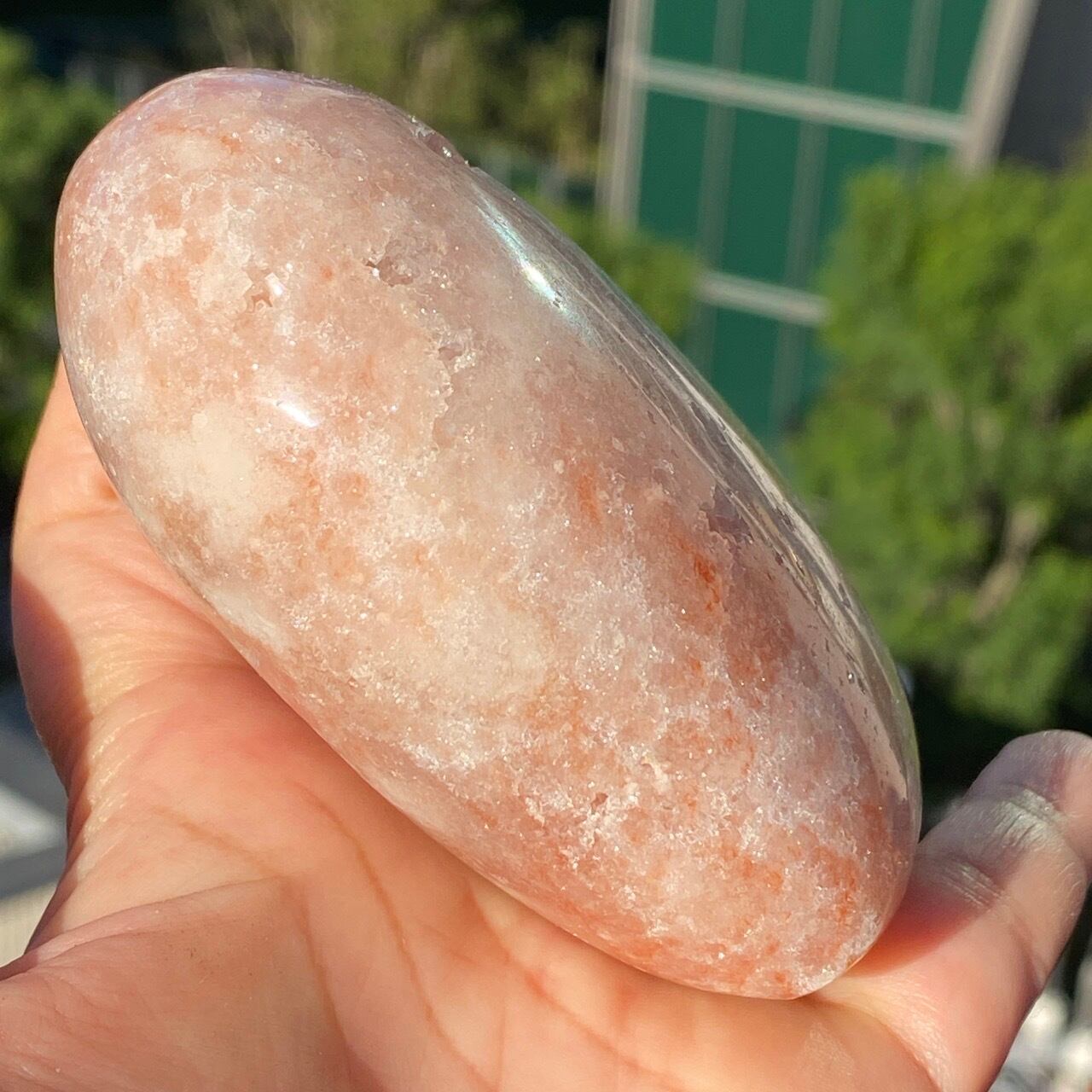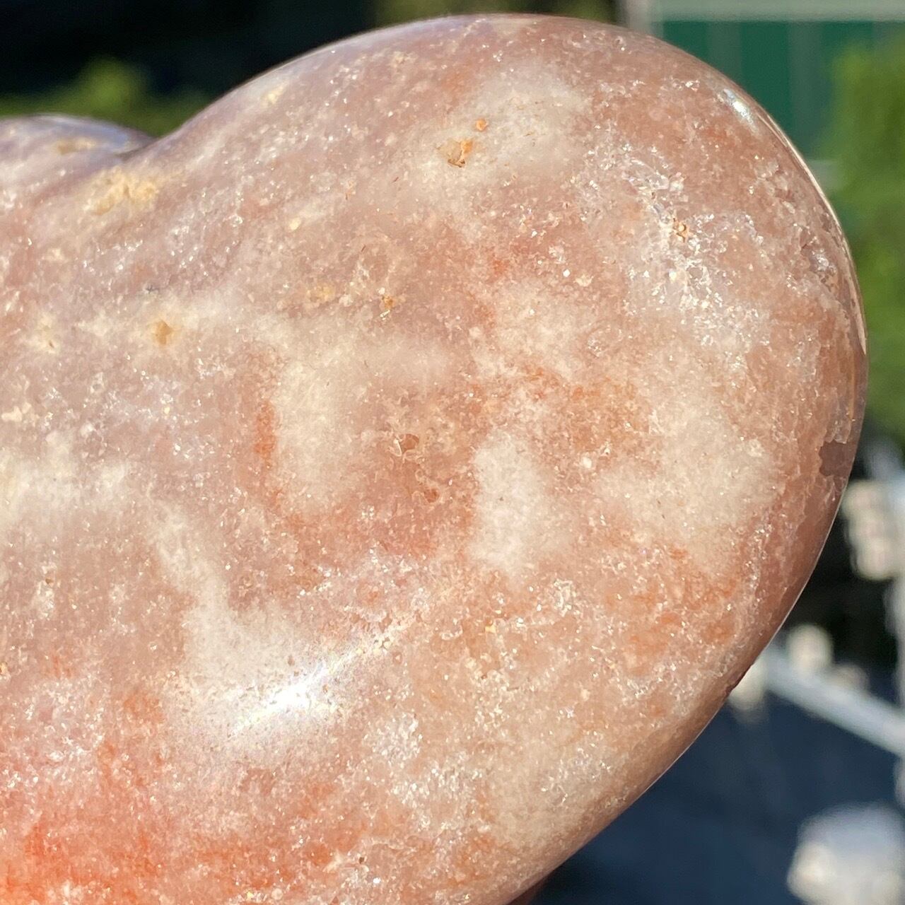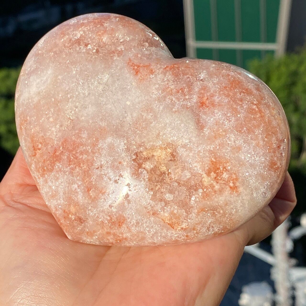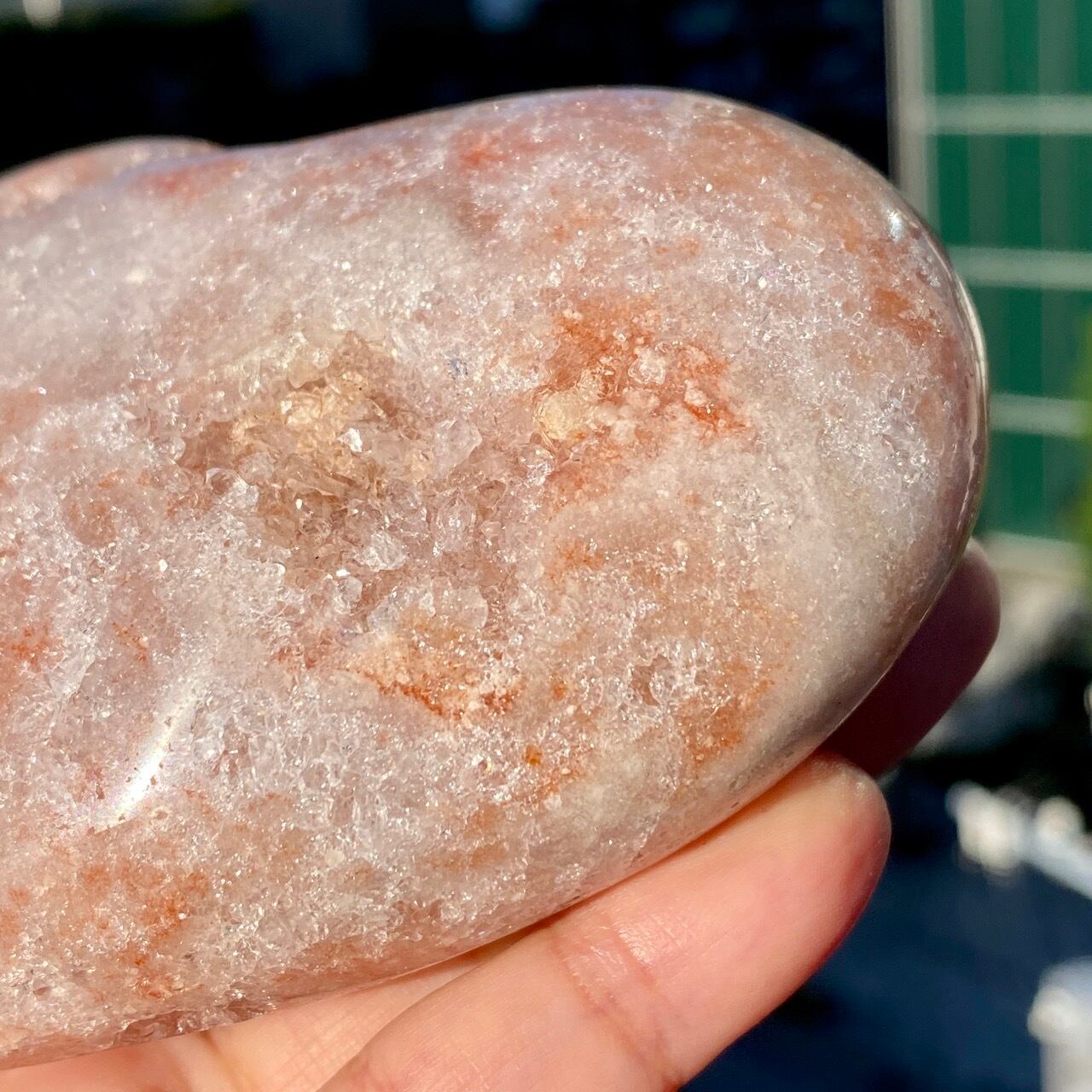 宝石のようなドゥルージーは勿論のこと、全体的にクォーツの結晶がちりばめられていて、きらっきらのとても可憐な子です。表面から見てとれるアプリコットのシャーベットの様な色味と乳白色、そしてクォーツのコンビネーションの調和に、『なんてラブリー♡』と自然に声をあげてしまうようなそんな子です。ぷっくりとした厚みと重量感が癒し系で、優しい色味に自然に自分のハートも広がってしまう感じになります(個人の感想です)。