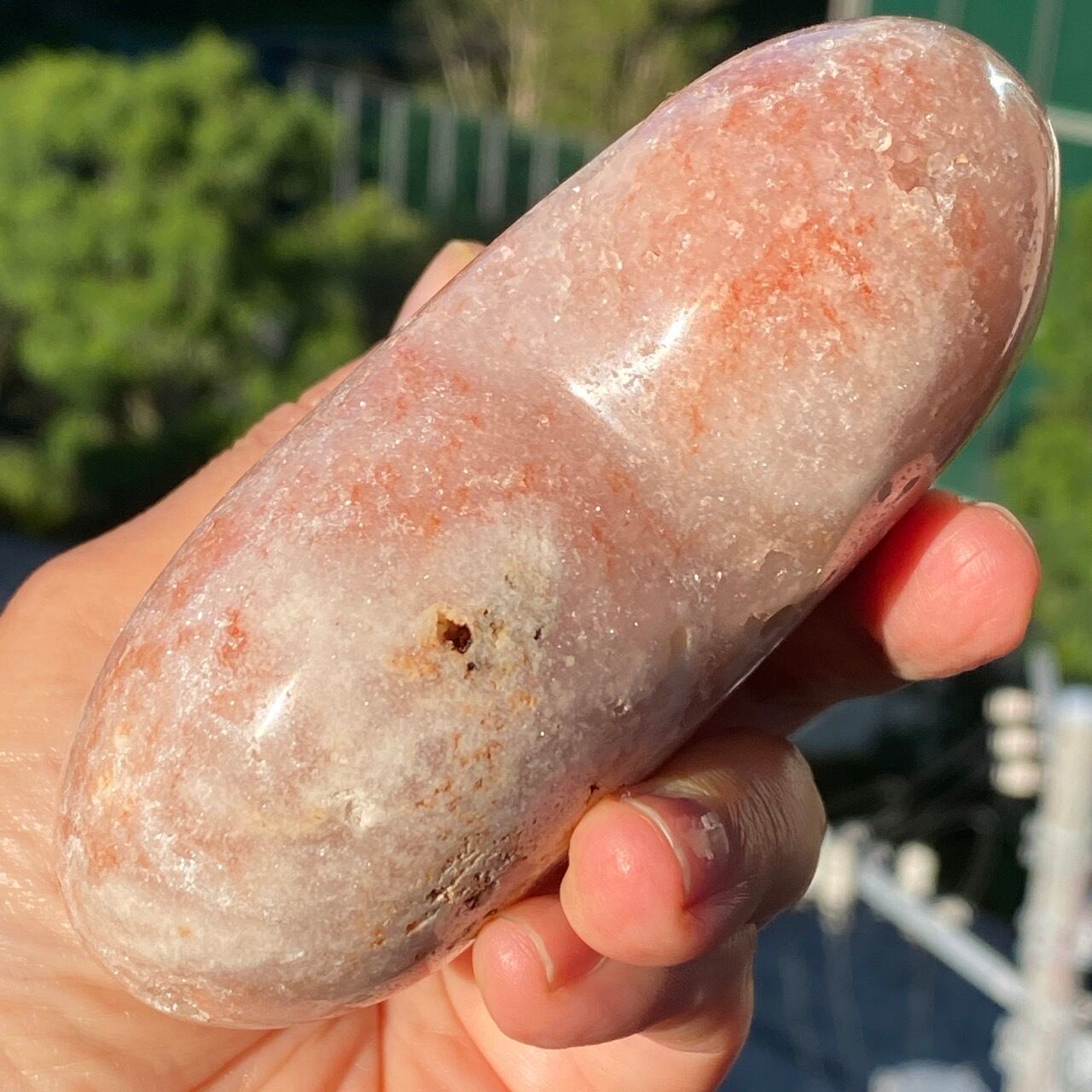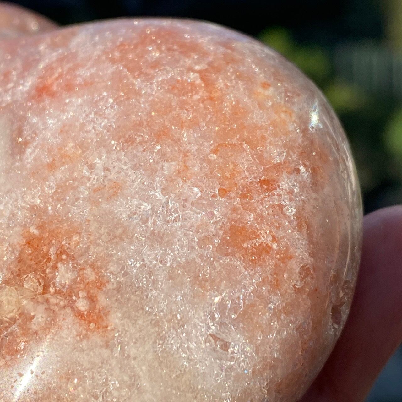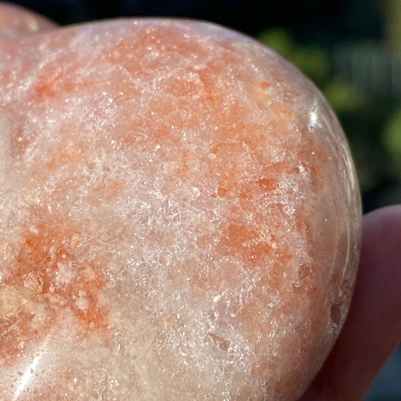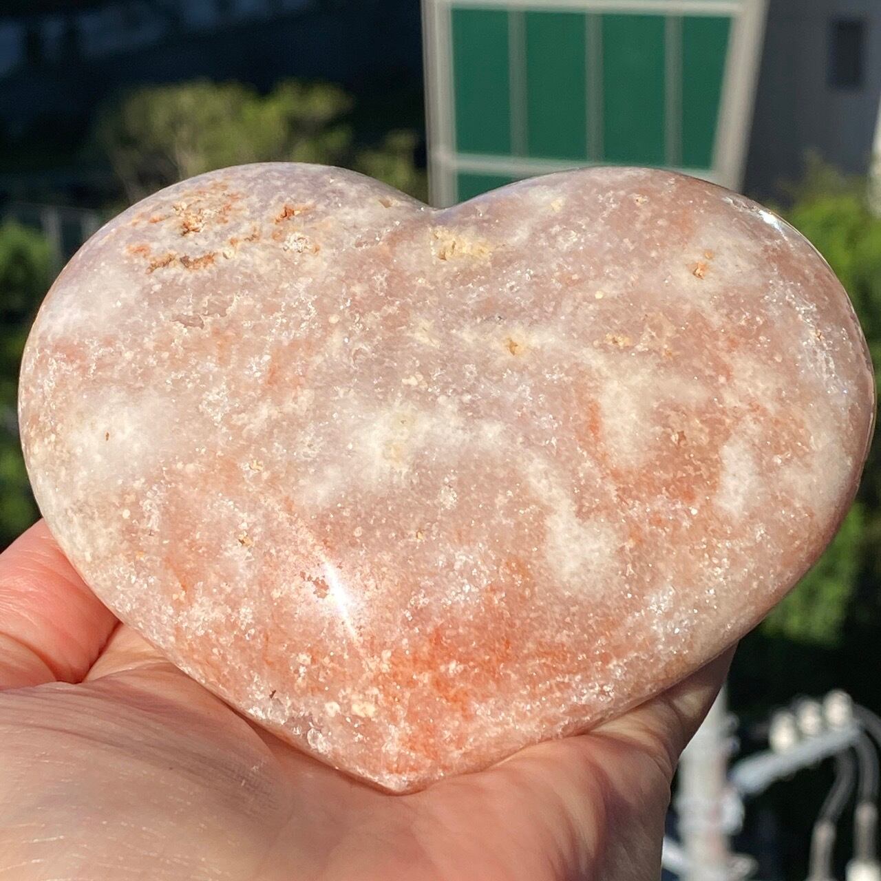 宝石のようなドゥルージーは勿論のこと、全体的にクォーツの結晶がちりばめられていて、きらっきらのとても可憐な子です。表面から見てとれるアプリコットのシャーベットの様な色味と乳白色、そしてクォーツのコンビネーションの調和に、『なんてラブリー♡』と自然に声をあげてしまうようなそんな子です。ぷっくりとした厚みと重量感が癒し系で、優しい色味に自然に自分のハートも広がってしまう感じになります(個人の感想です)。