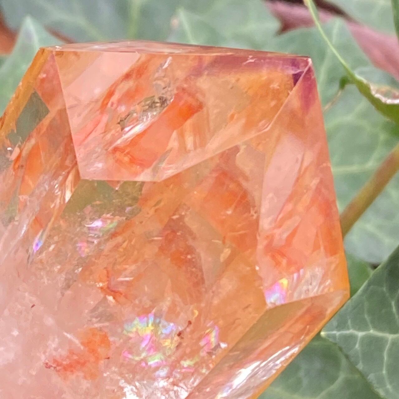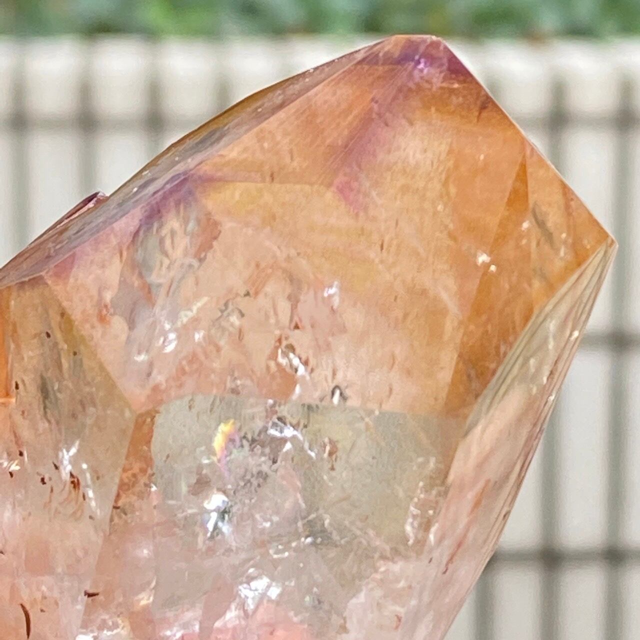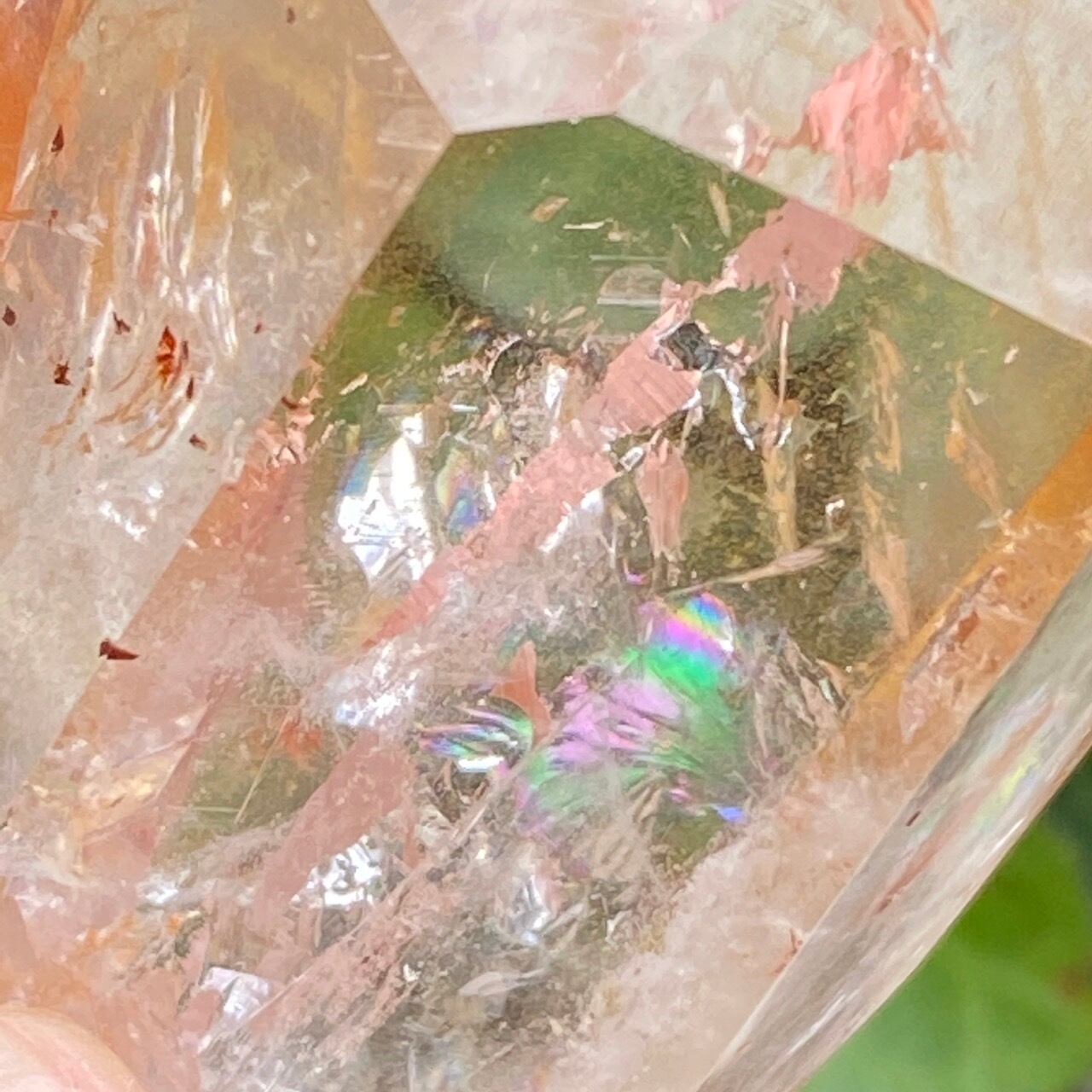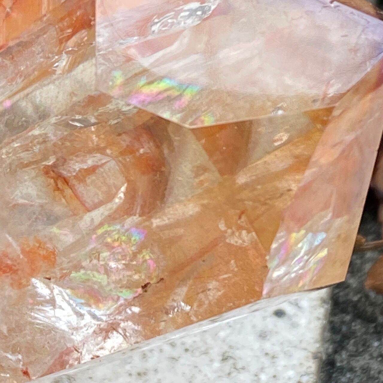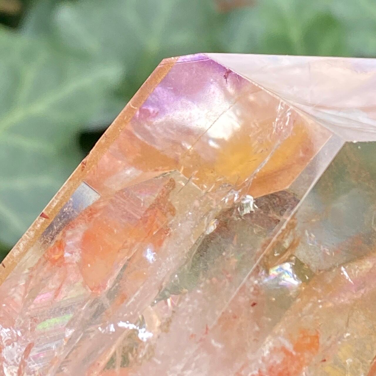 画像では上手く写せていませんが、透過性のあるクォーツとにかく強烈な虹が複数見られます。コーティングは、小さなポイントの上部以外は非常に控えめな色づきで、薄らとオレンジや紫が配されています。見る角度によって、水晶内部に反射して視覚効果があります。