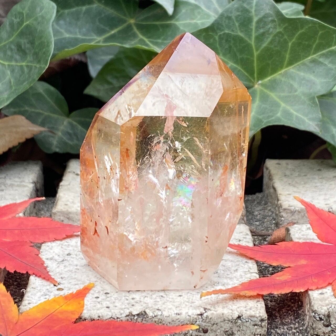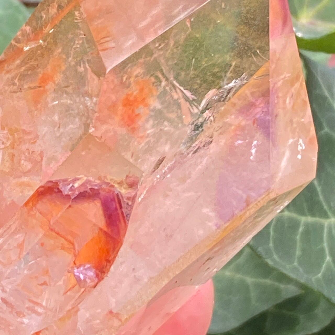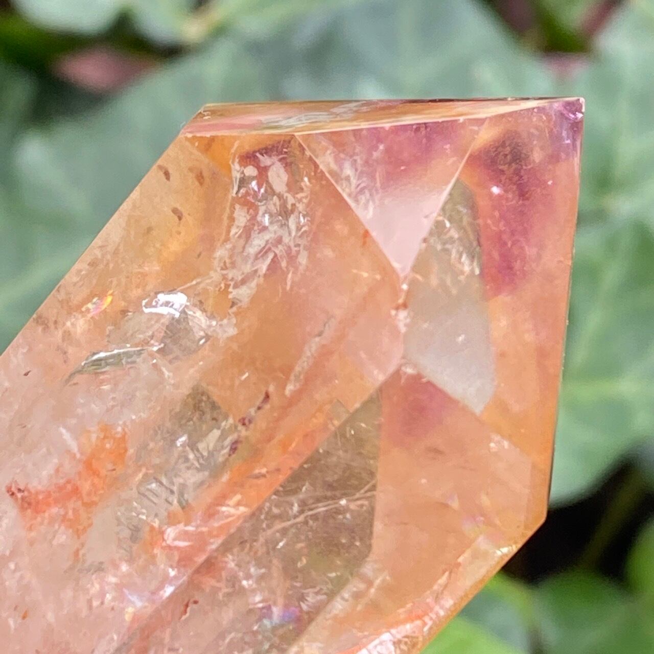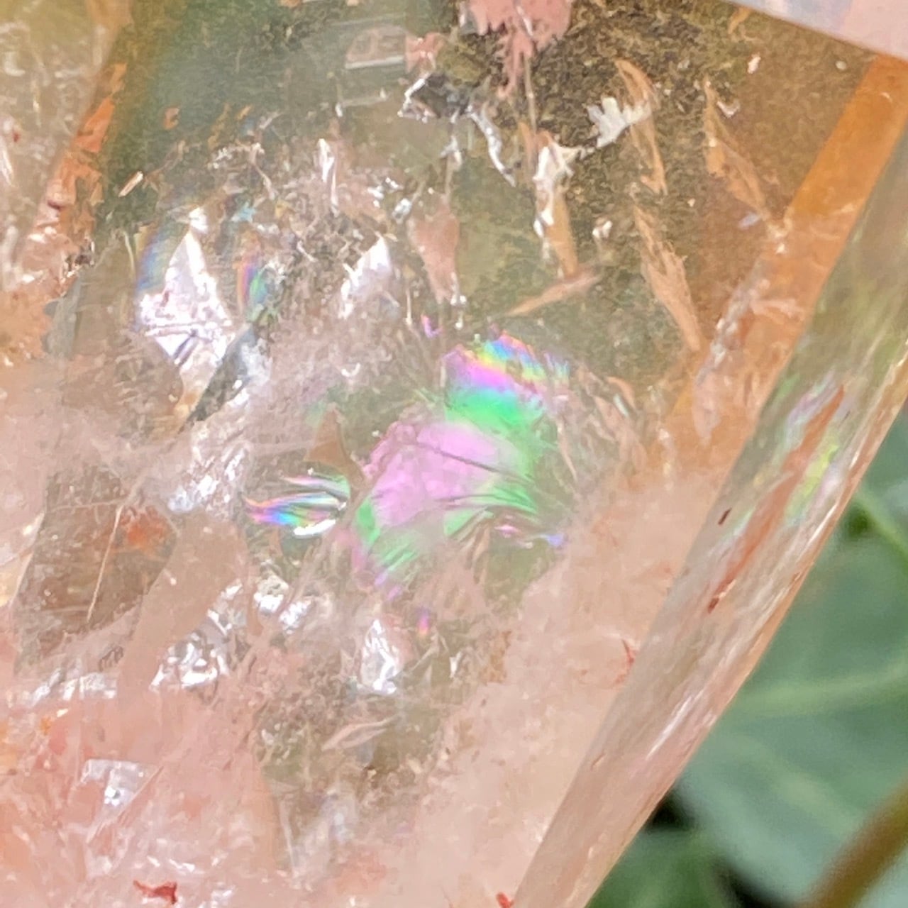 画像では上手く写せていませんが、透過性のあるクォーツとにかく強烈な虹が複数見られます。コーティングは、小さなポイントの上部以外は非常に控えめな色づきで、薄らとオレンジや紫が配されています。見る角度によって、水晶内部に反射して視覚効果があります。