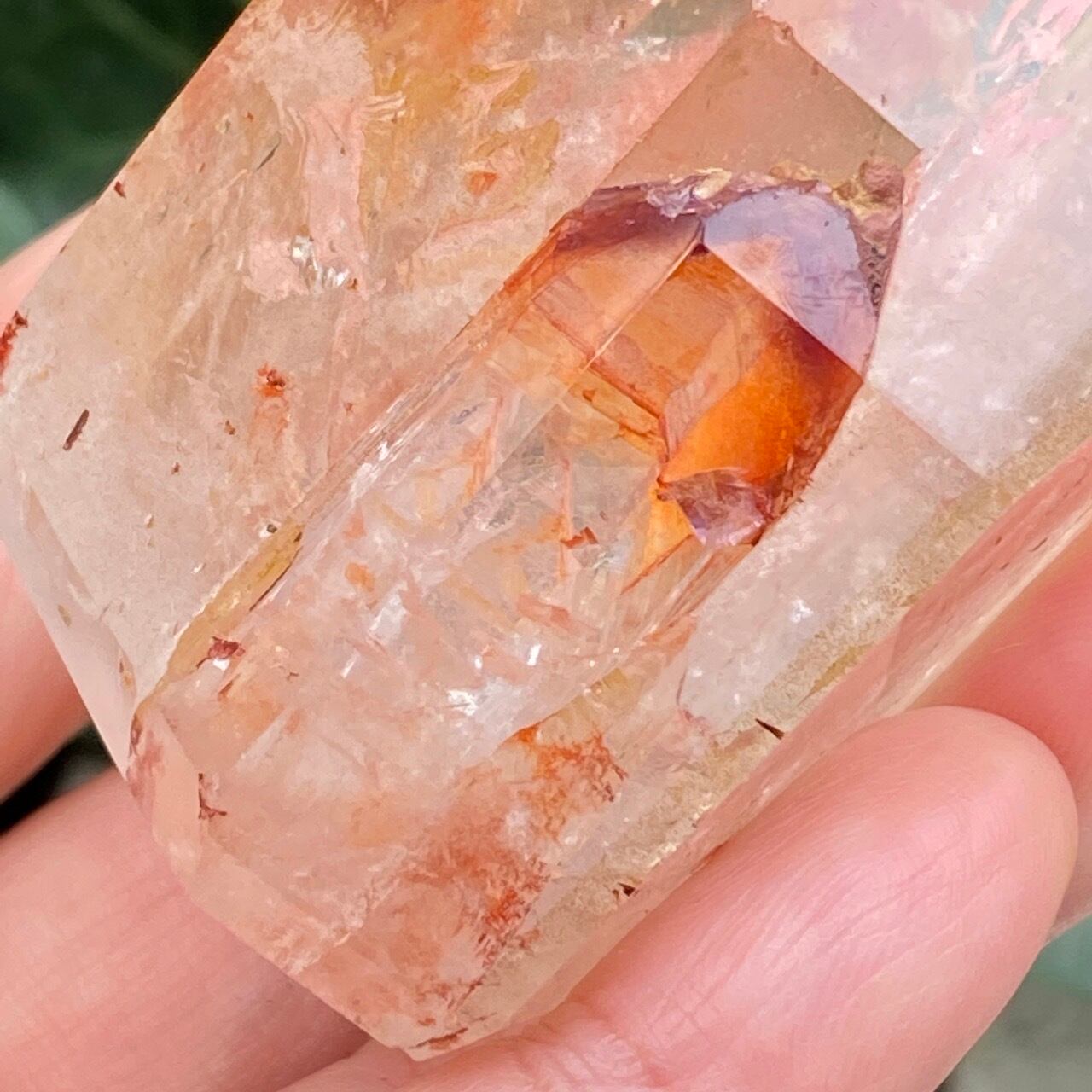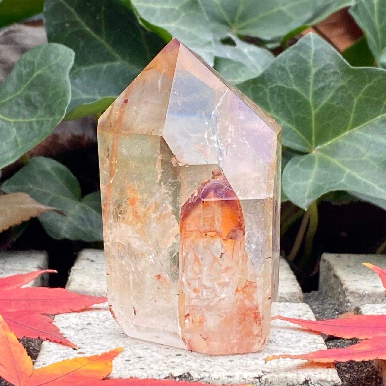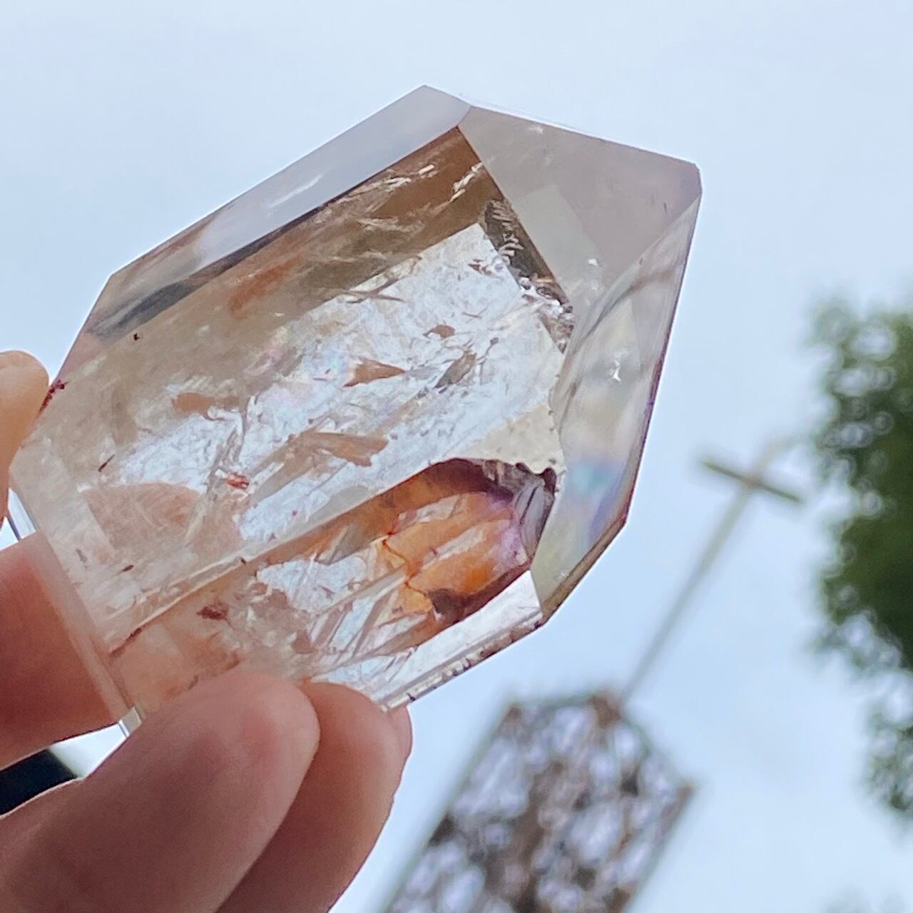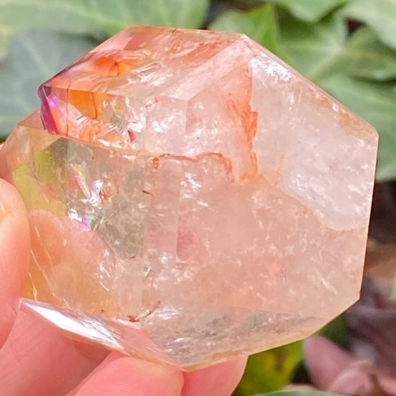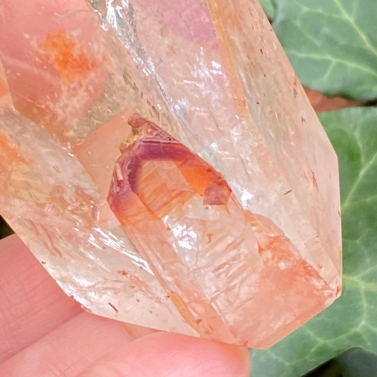 画像では上手く写せていませんが、透過性のあるクォーツとにかく強烈な虹が複数見られます。コーティングは、小さなポイントの上部以外は非常に控えめな色づきで、薄らとオレンジや紫が配されています。見る角度によって、水晶内部に反射して視覚効果があります。