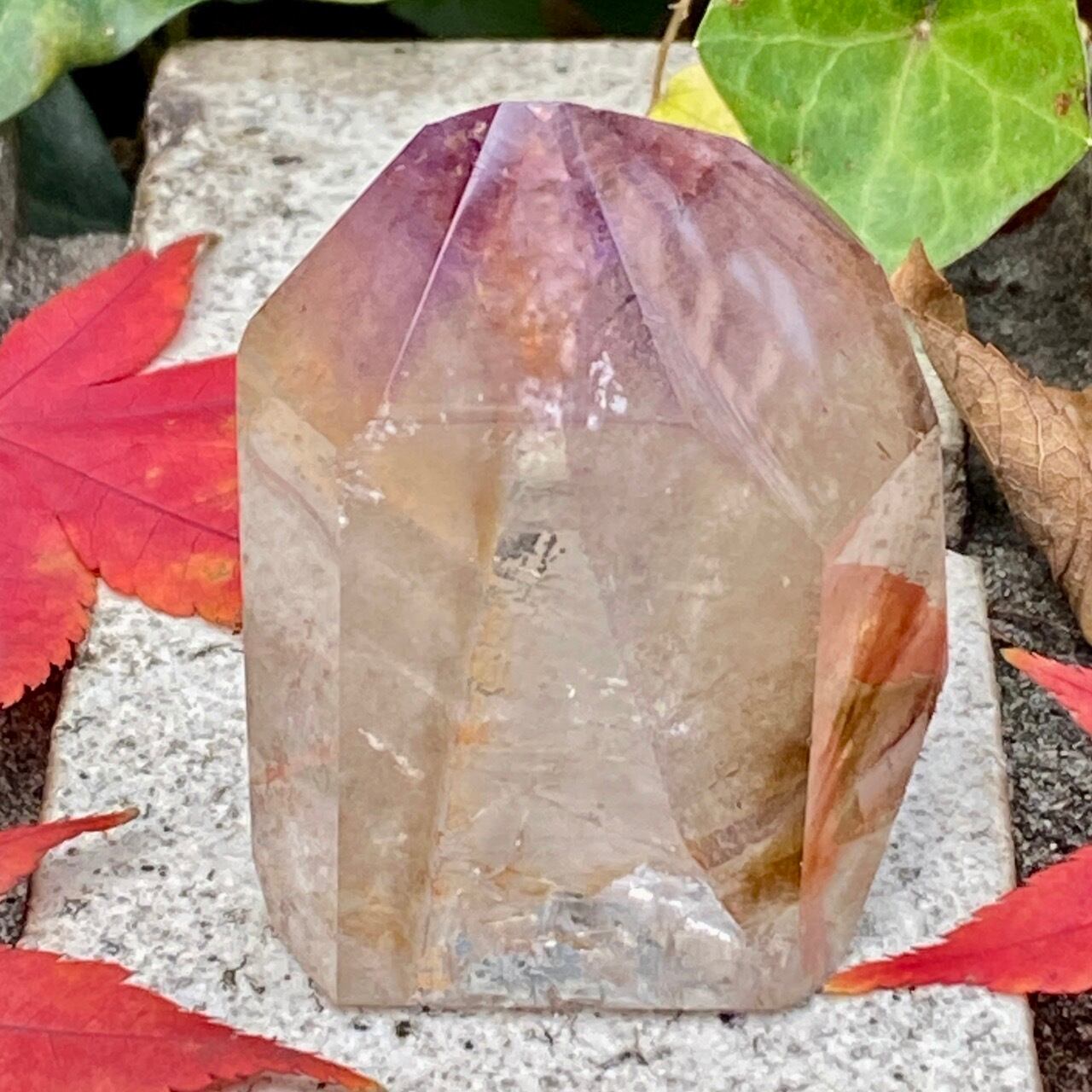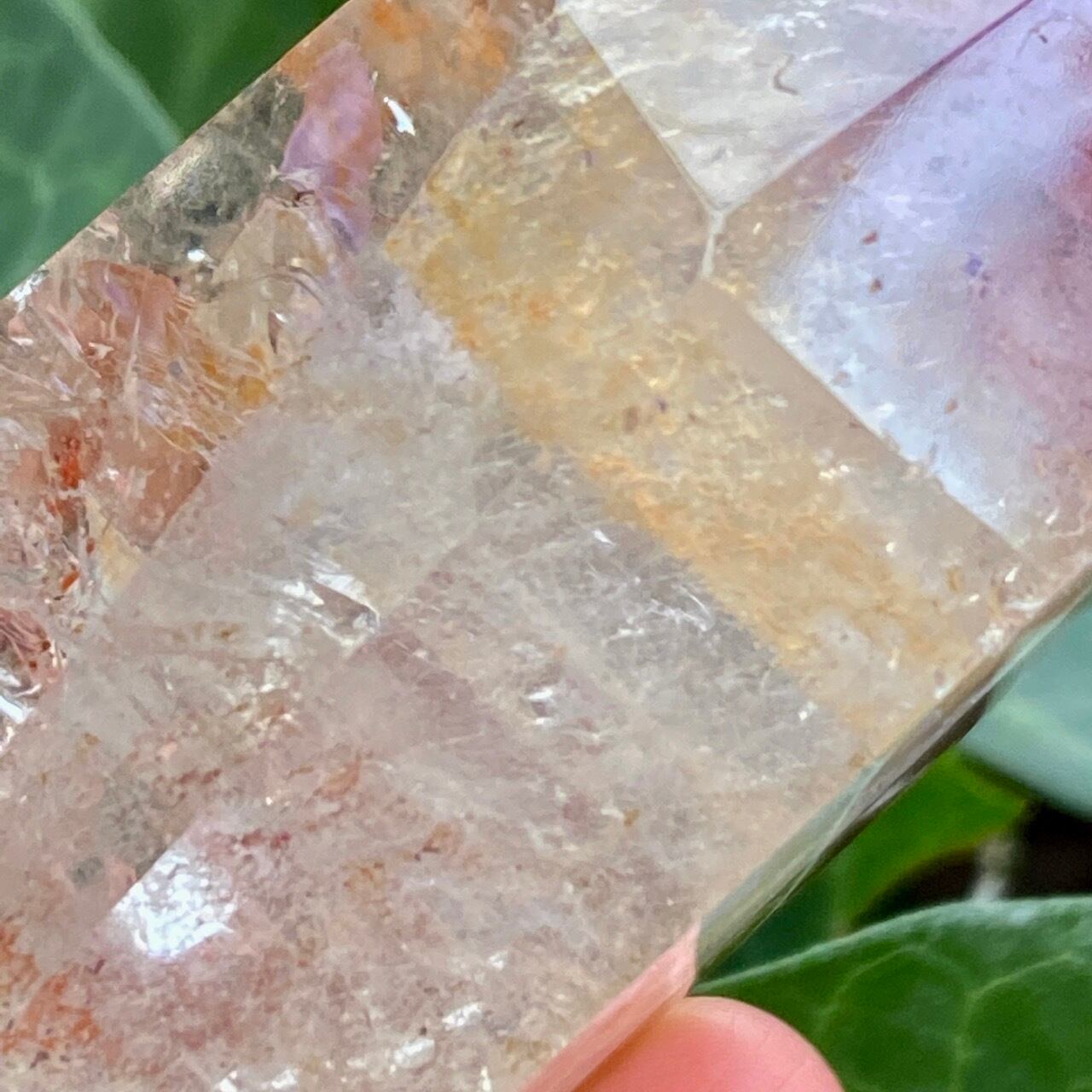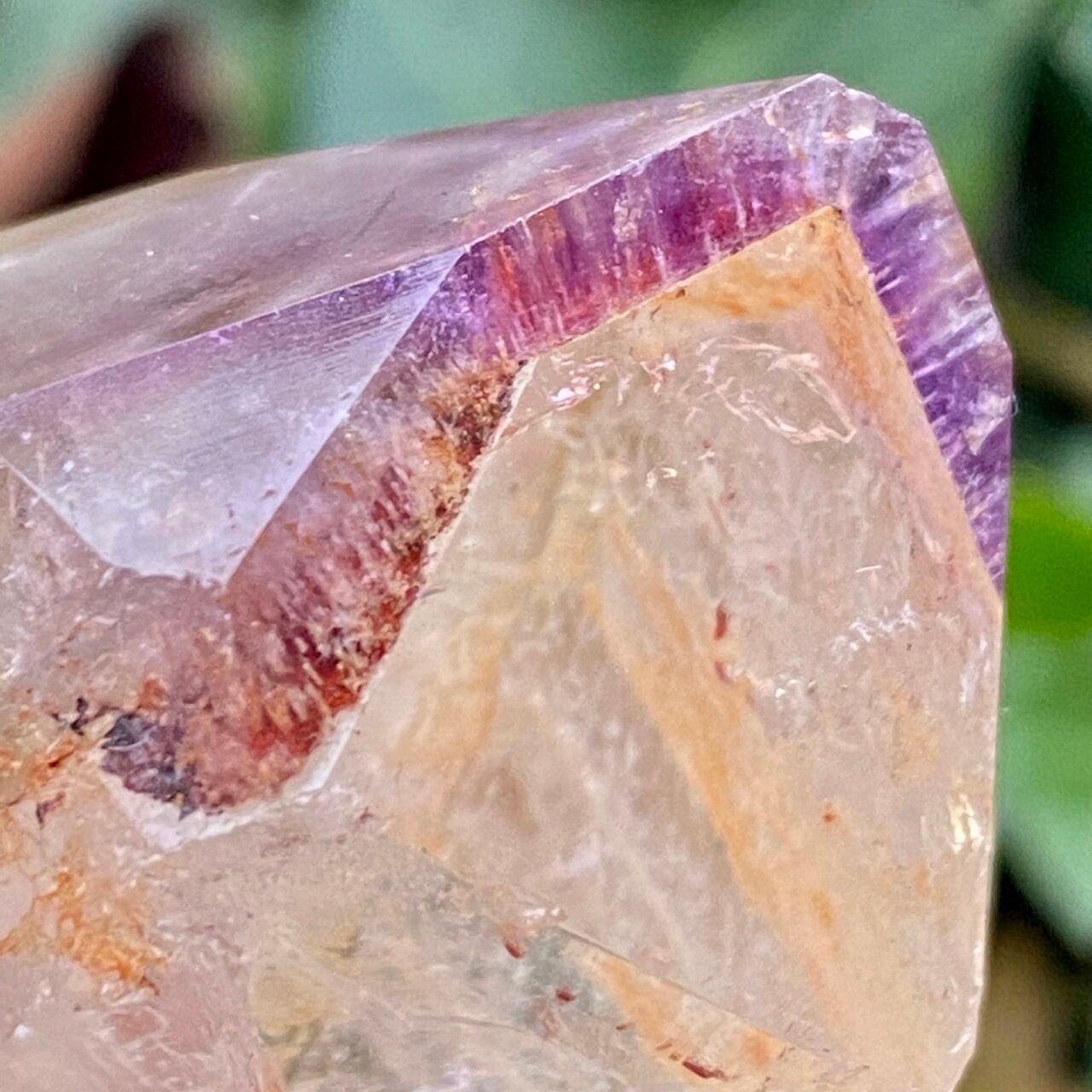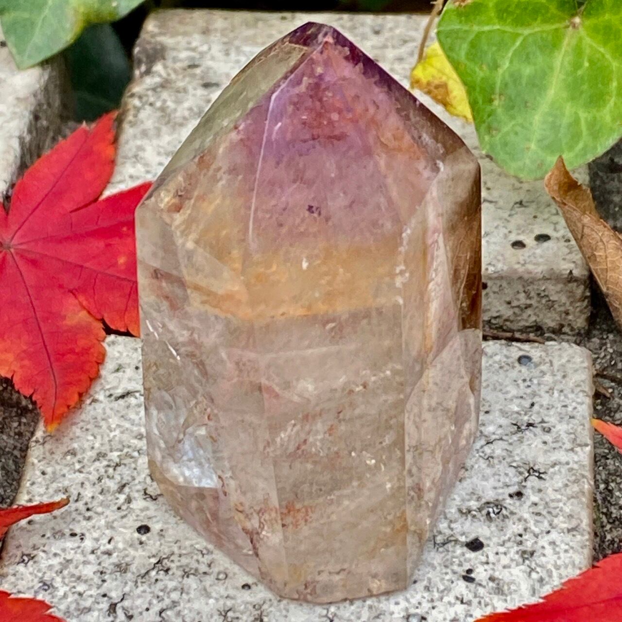 コーティングにはアメジストの色味(紫)にところどころスモーキーの様なインクルージョンと鮮やかなオレンジが配されています。裏側から底面にかけてのコアのクォーツ部分は透過性が高く、虹も確認できます。そこにはコーティングの断面図が見られ、一部研磨されていない箇所があり、ラフな質感の部分が露出している為、ナチュラル感があります。