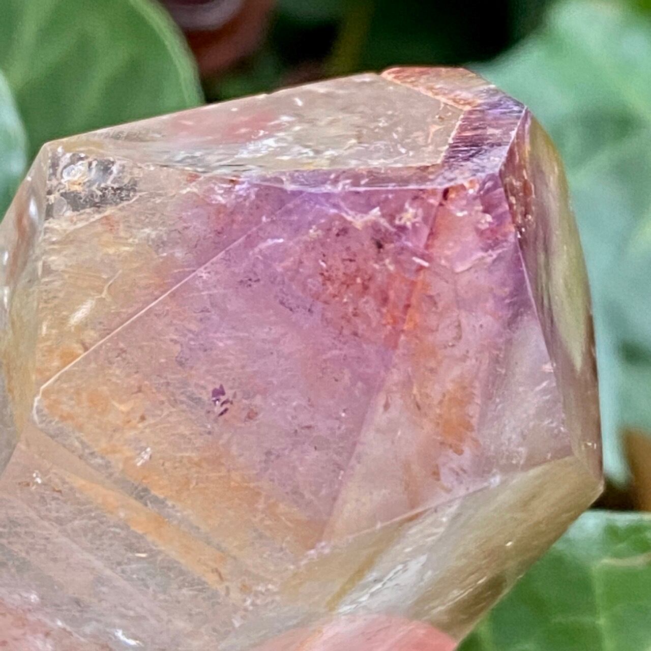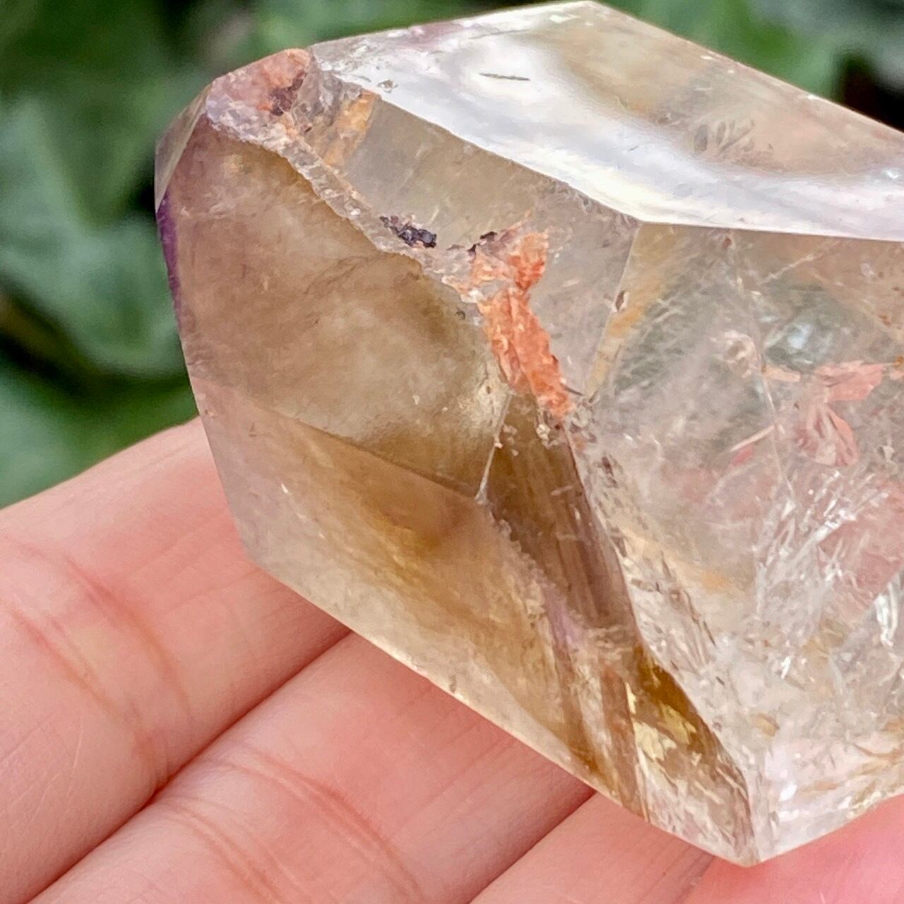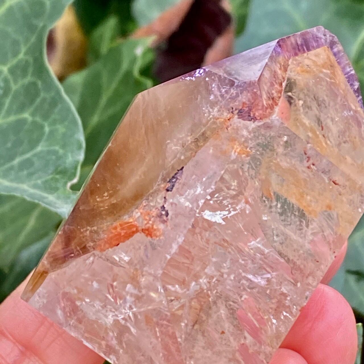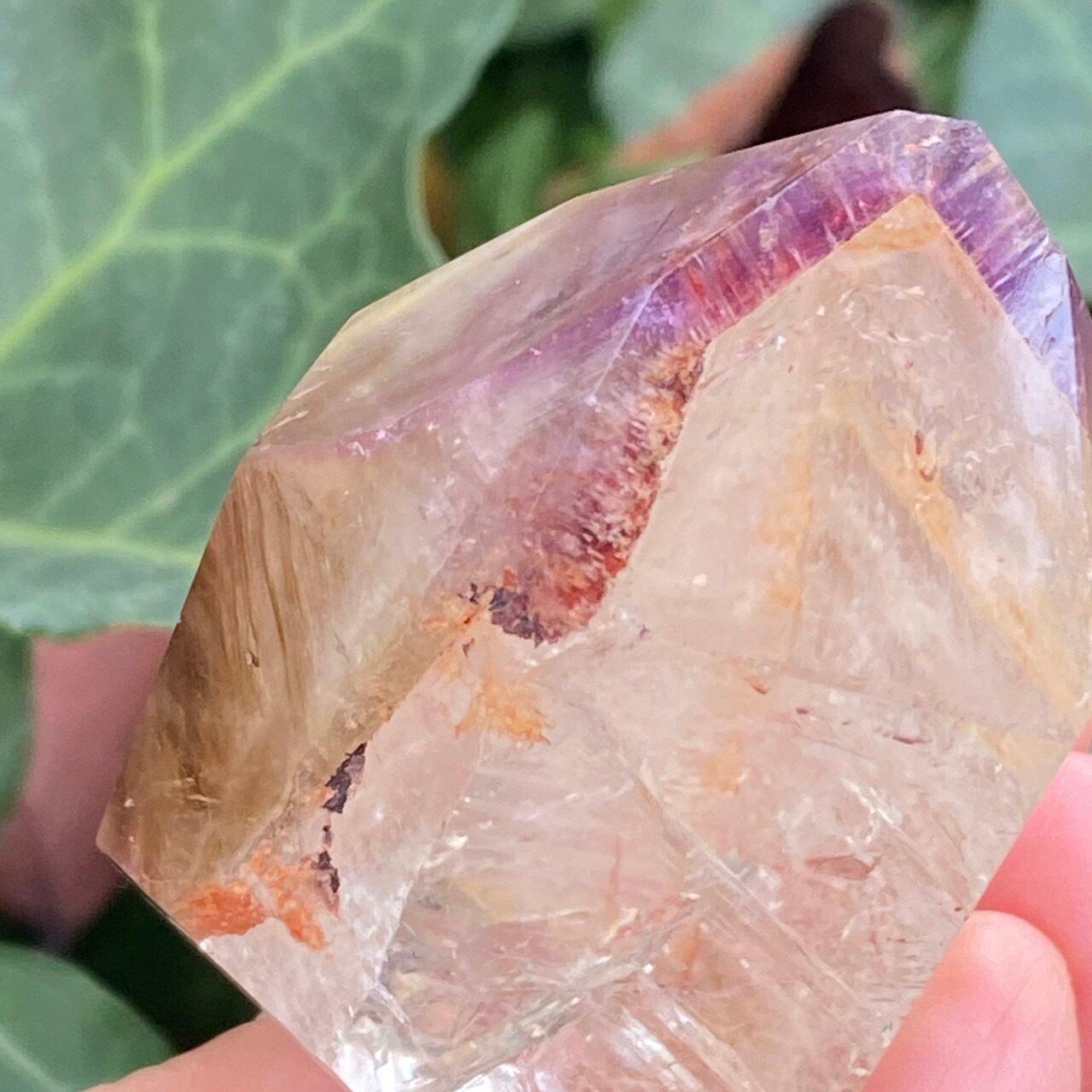 コーティングにはアメジストの色味(紫)にところどころスモーキーの様なインクルージョンと鮮やかなオレンジが配されています。裏側から底面にかけてのコアのクォーツ部分は透過性が高く、虹も確認できます。そこにはコーティングの断面図が見られ、一部研磨されていない箇所があり、ラフな質感の部分が露出している為、ナチュラル感があります。