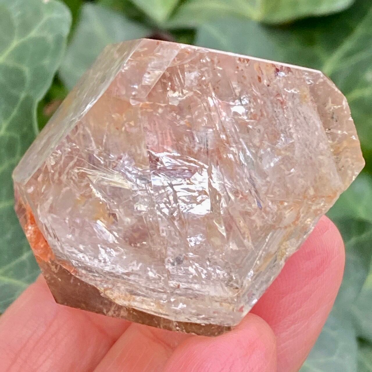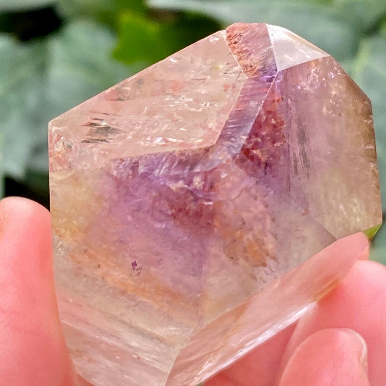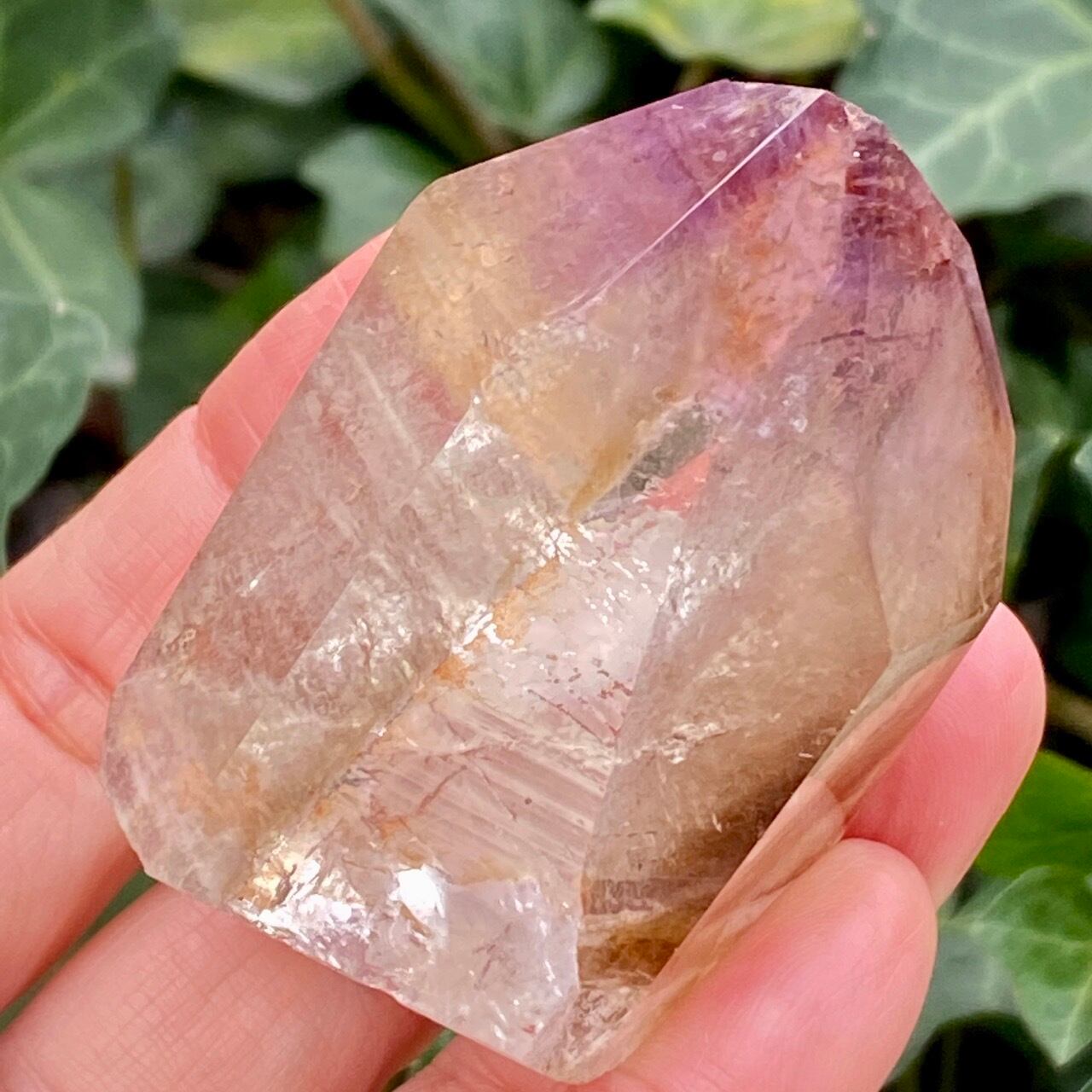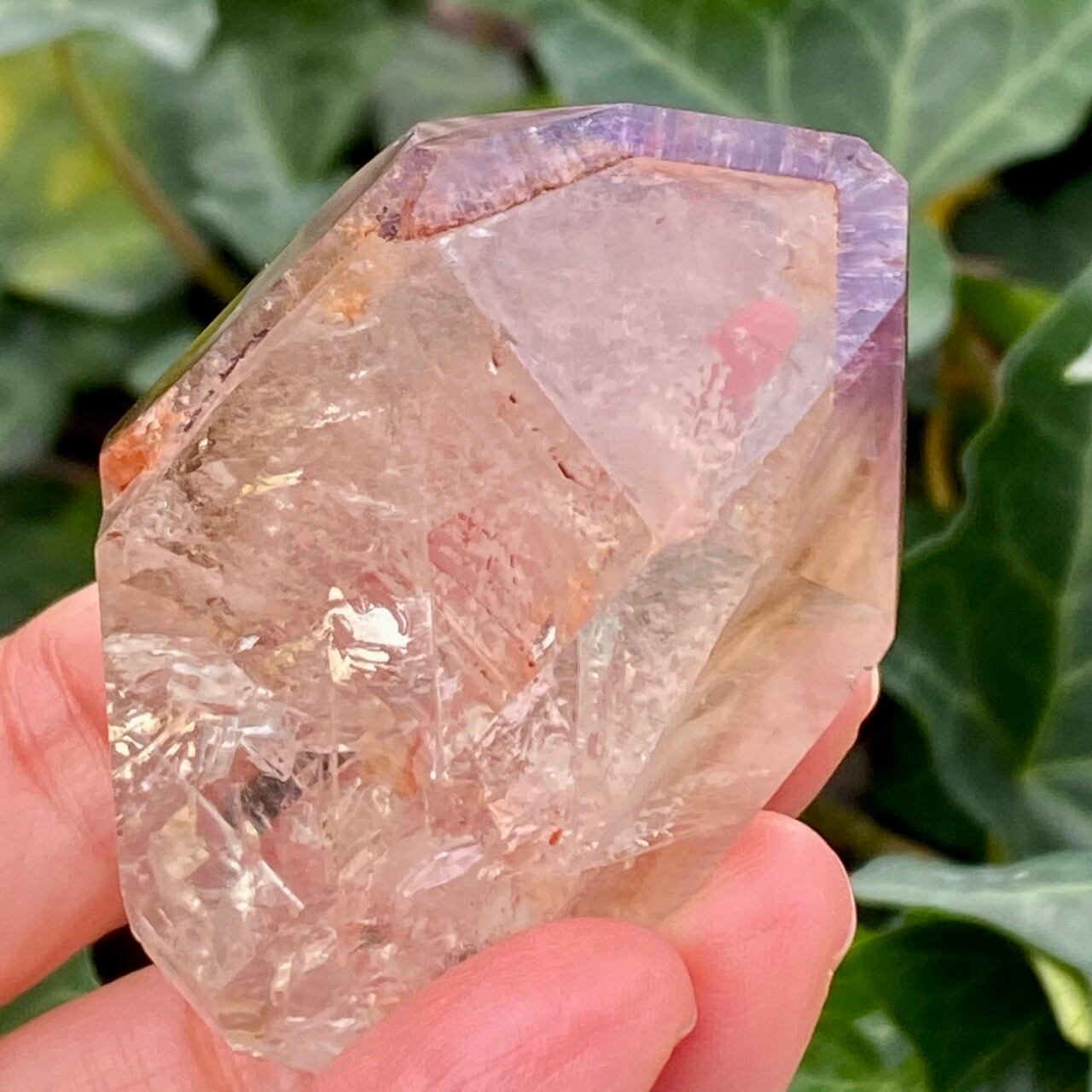 コーティングにはアメジストの色味(紫)にところどころスモーキーの様なインクルージョンと鮮やかなオレンジが配されています。裏側から底面にかけてのコアのクォーツ部分は透過性が高く、虹も確認できます。そこにはコーティングの断面図が見られ、一部研磨されていない箇所があり、ラフな質感の部分が露出している為、ナチュラル感があります。