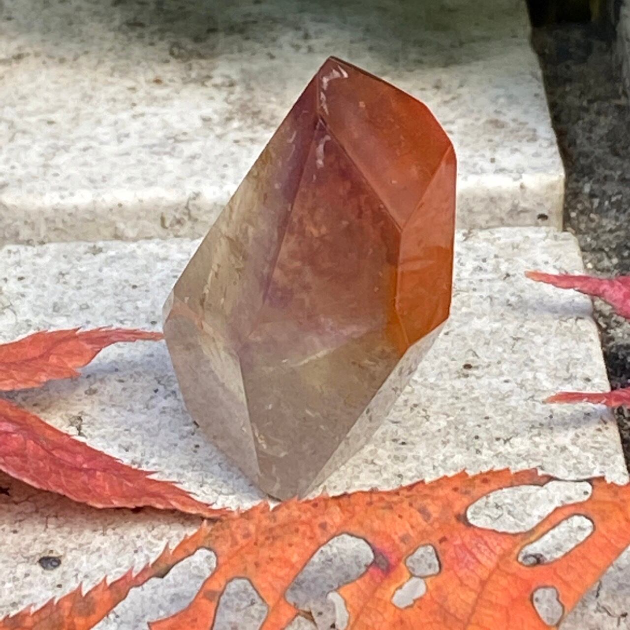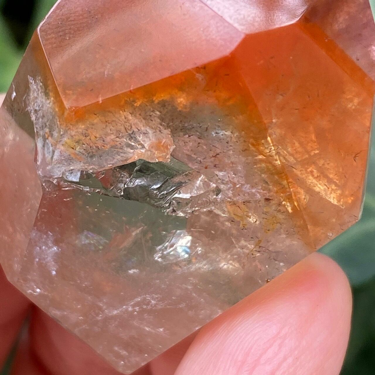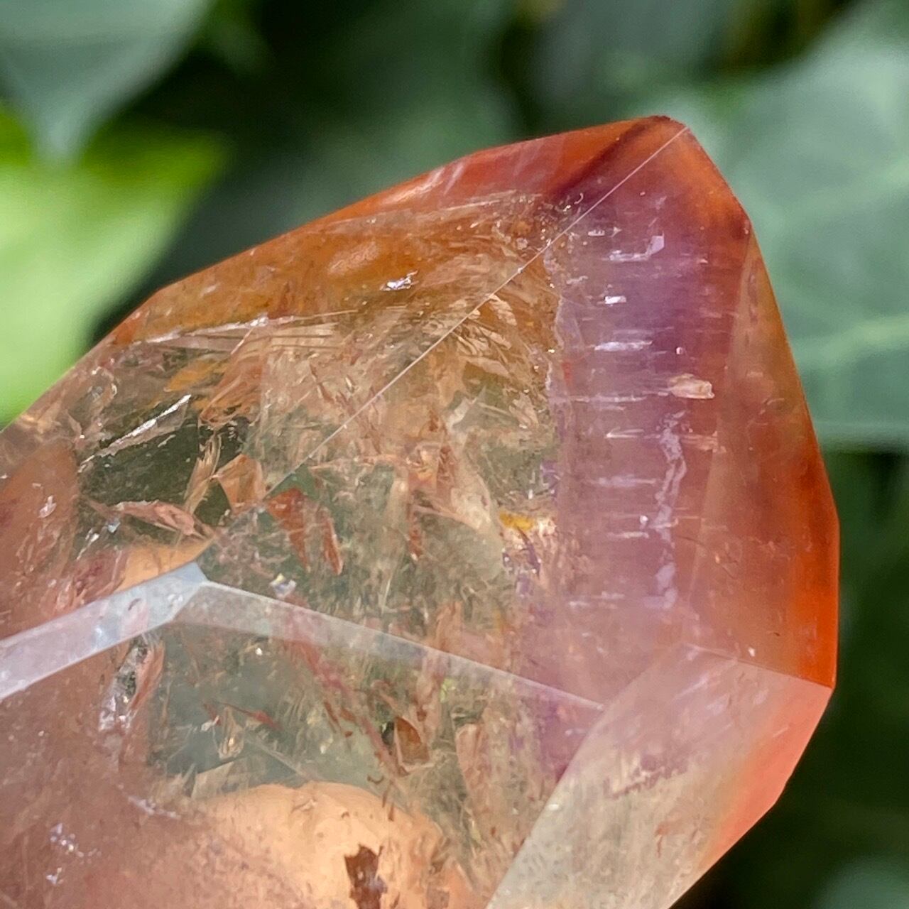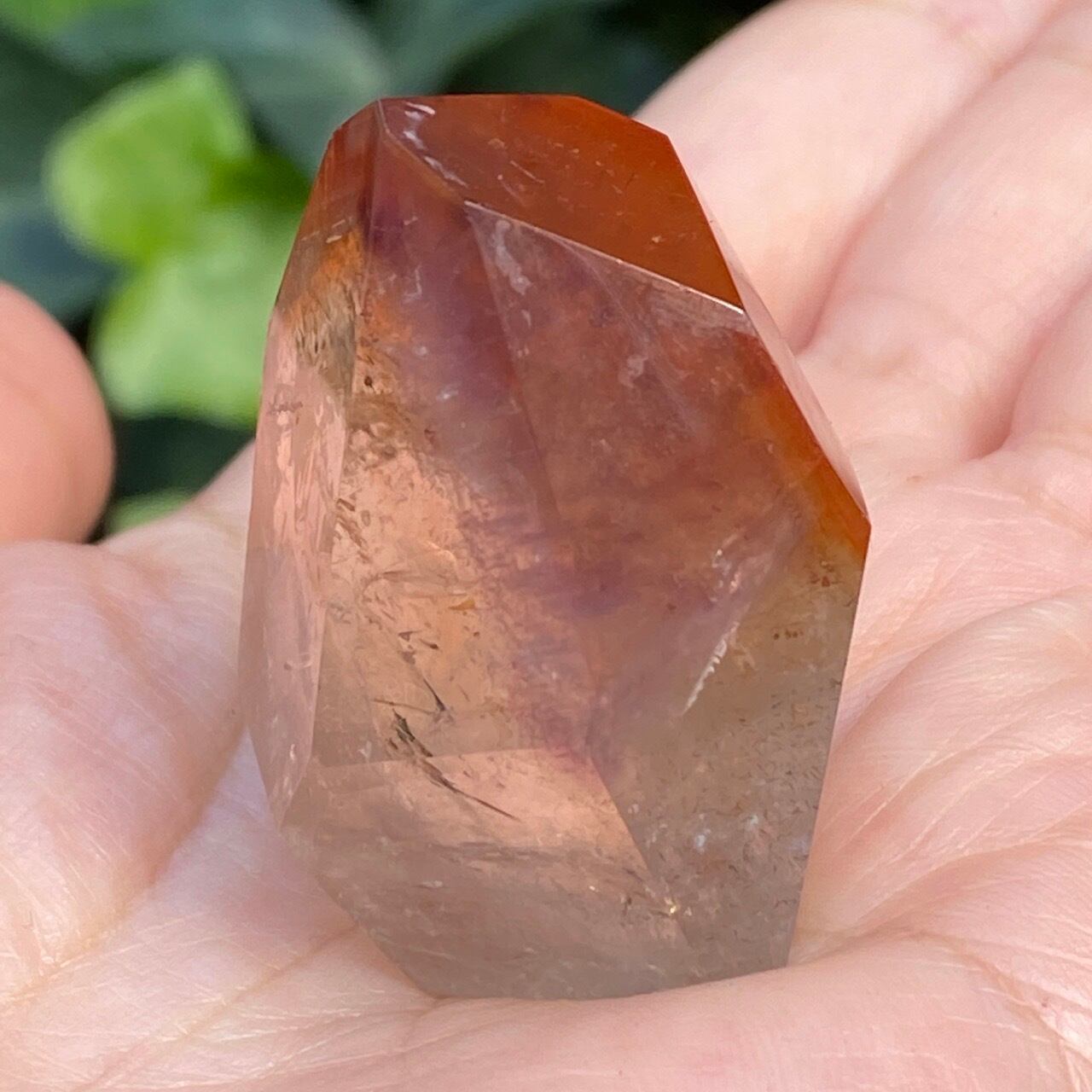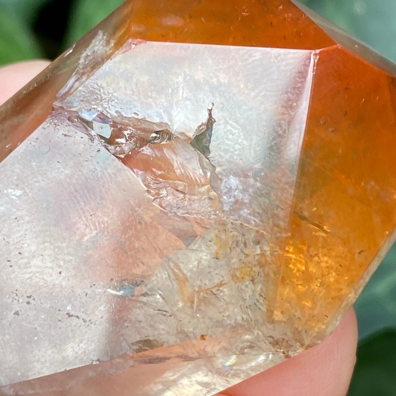 ポイントの上部に屋根の様なコーティングに濃厚なオレンジのインクルージョンを有する、ミニサイズの子です。ポイント内部のクラックに、このオレンジ色が反射し、またコアのクリアクォーツがTeatreeオイルのような檸檬色に見えるのも、このオレンジのコーティングのおかげかもしれません。斜めな形状に加え、剥離痕も愛らしい子です。