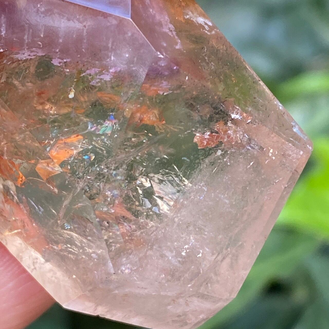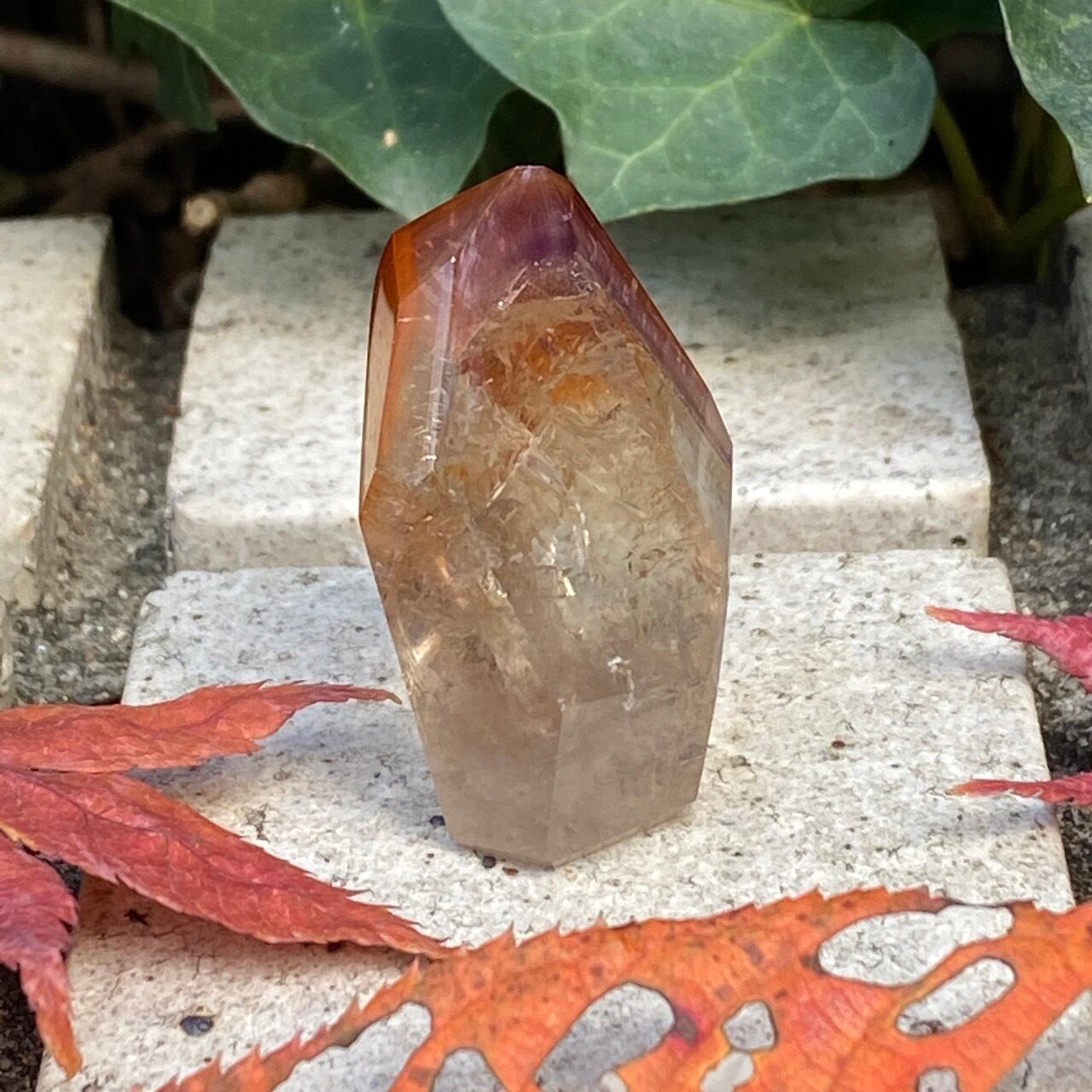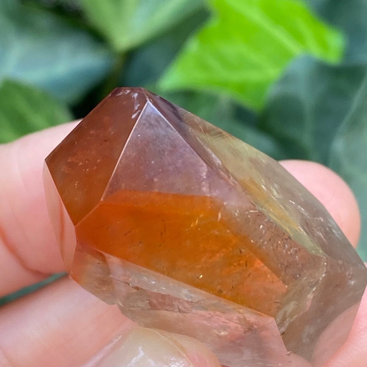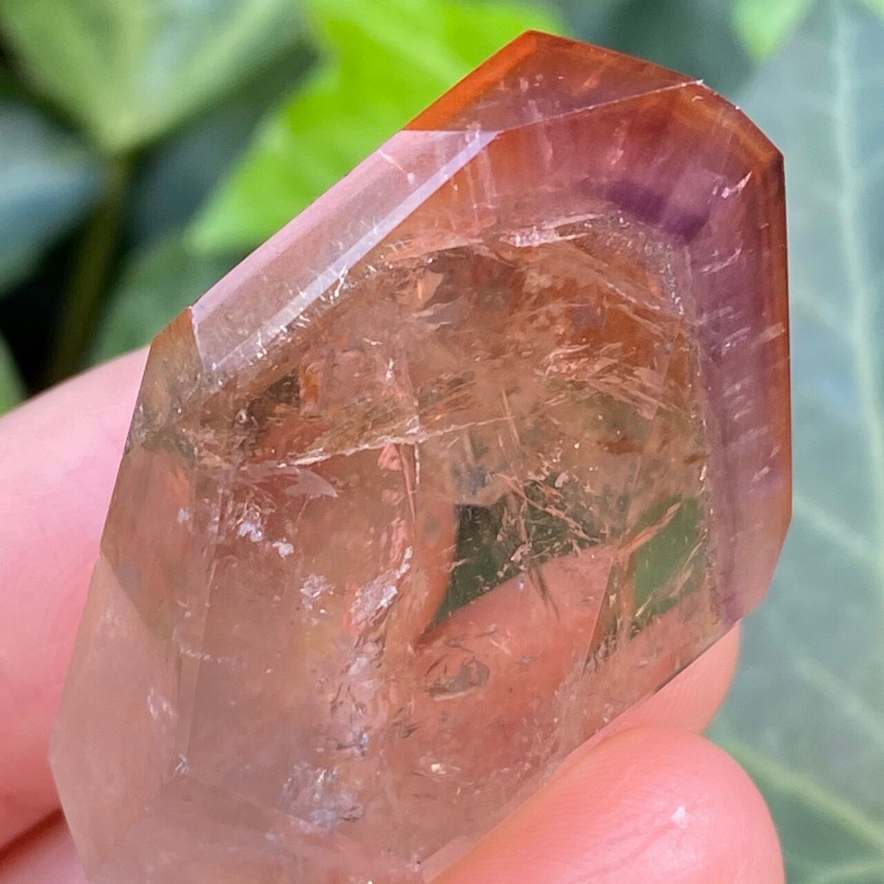ポイントの上部に屋根の様なコーティングに濃厚なオレンジのインクルージョンを有する、ミニサイズの子です。ポイント内部のクラックに、このオレンジ色が反射し、またコアのクリアクォーツがTeatreeオイルのような檸檬色に見えるのも、このオレンジのコーティングのおかげかもしれません。斜めな形状に加え、剥離痕も愛らしい子です。