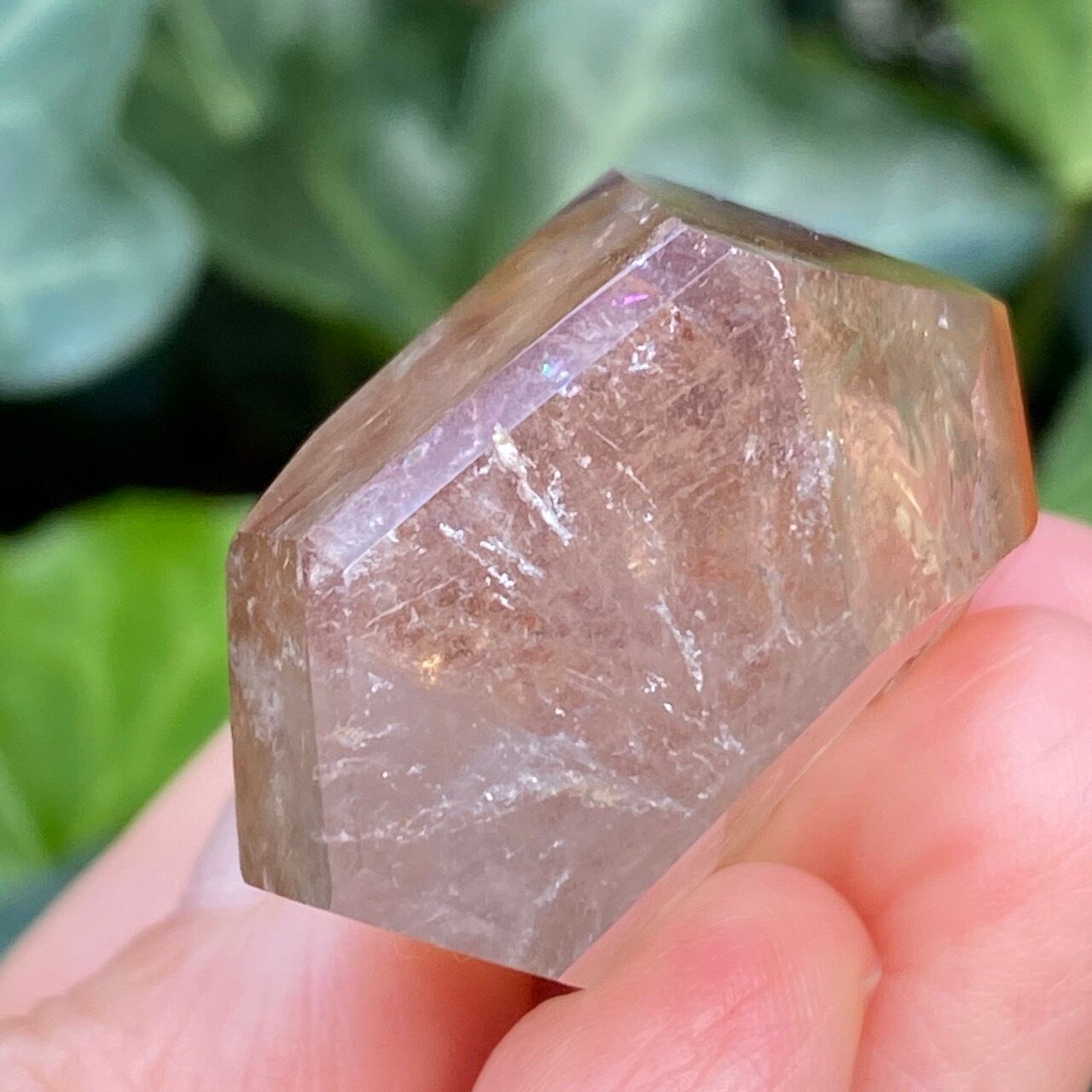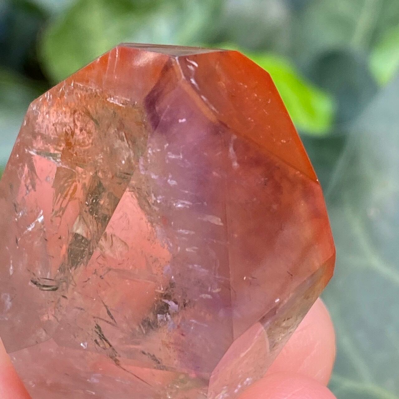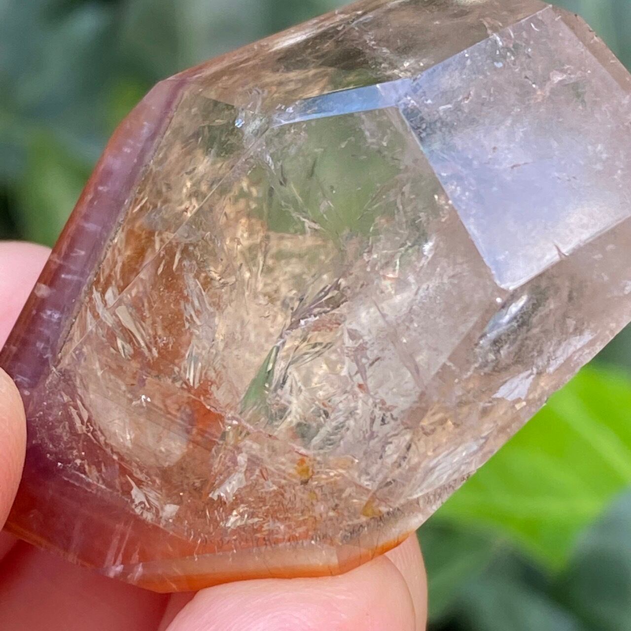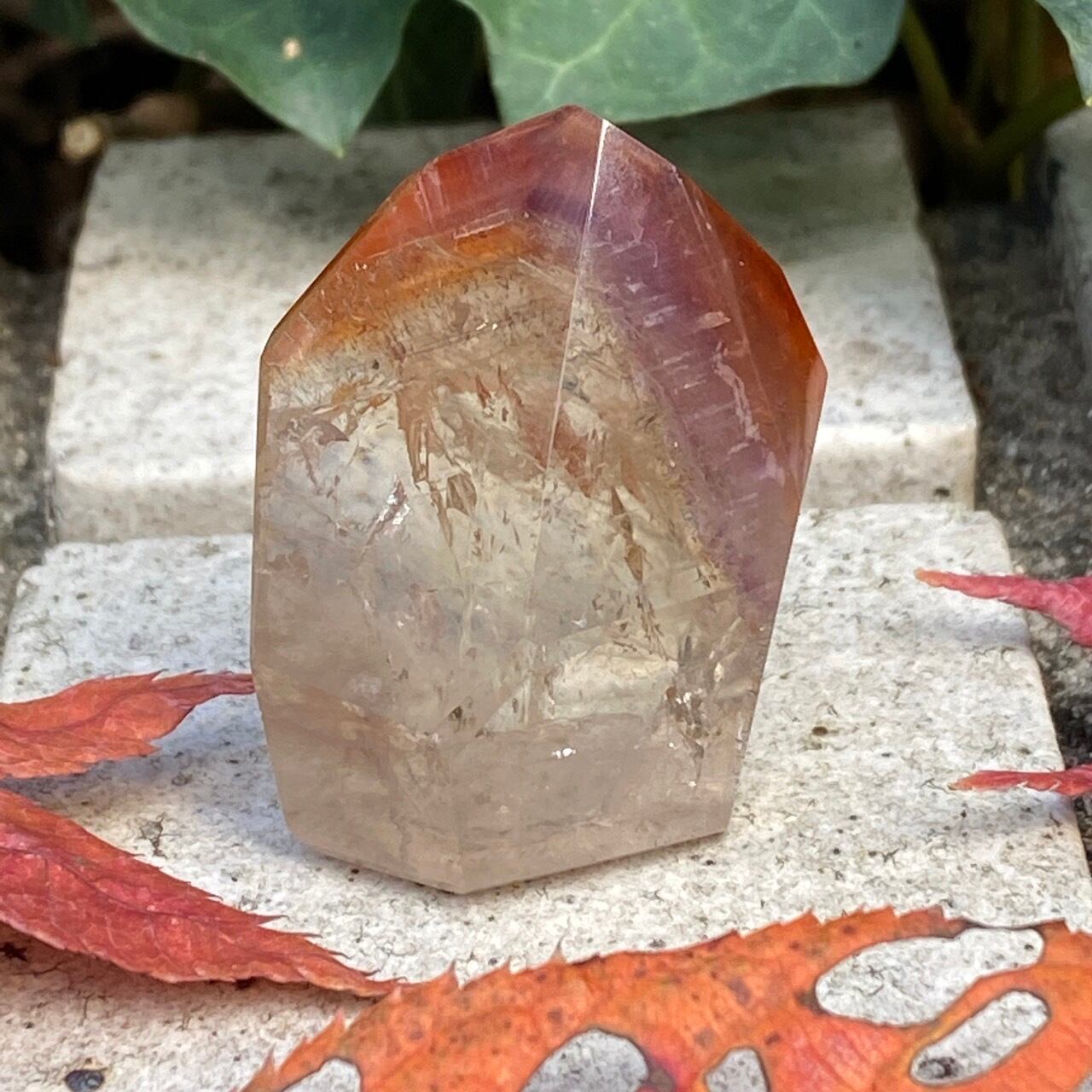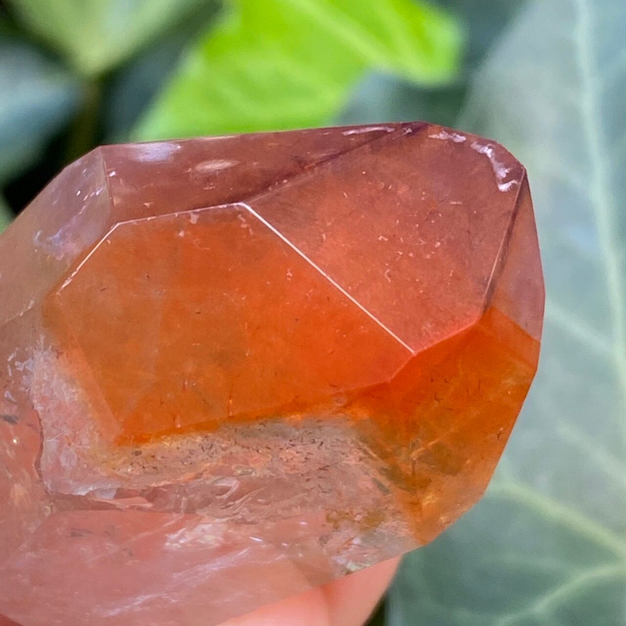 ポイントの上部に屋根の様なコーティングに濃厚なオレンジのインクルージョンを有する、ミニサイズの子です。ポイント内部のクラックに、このオレンジ色が反射し、またコアのクリアクォーツがTeatreeオイルのような檸檬色に見えるのも、このオレンジのコーティングのおかげかもしれません。斜めな形状に加え、剥離痕も愛らしい子です。