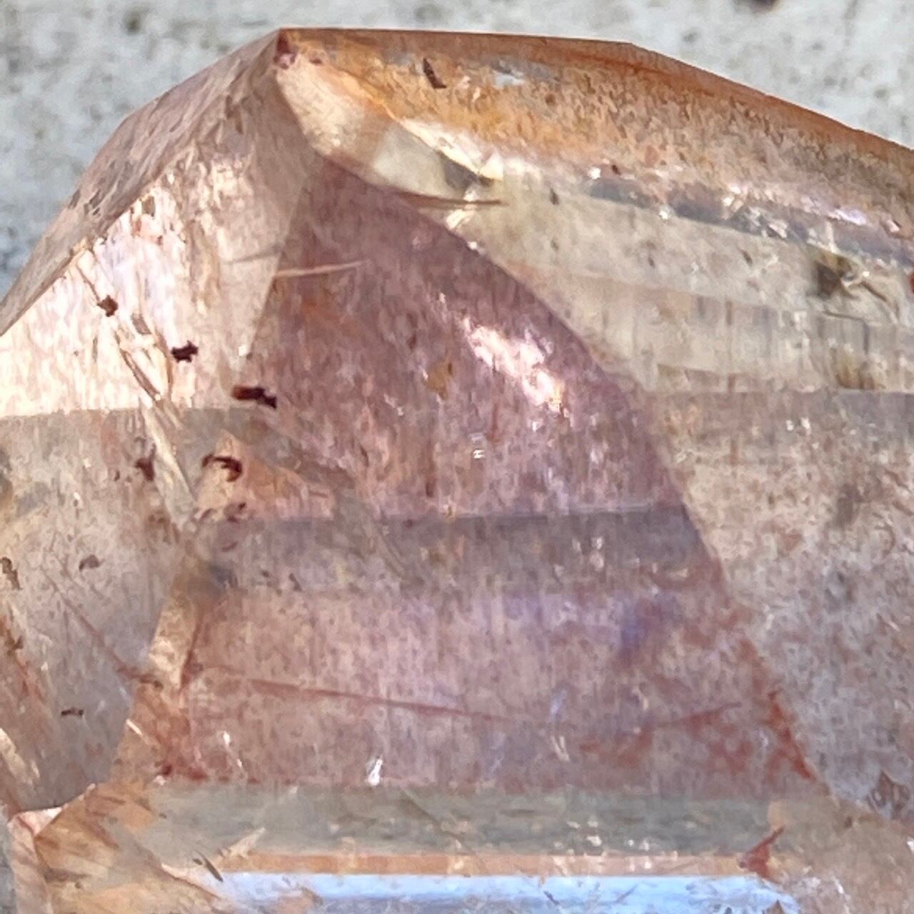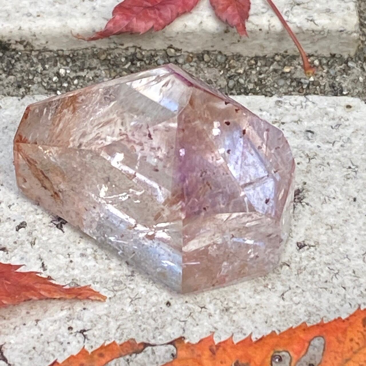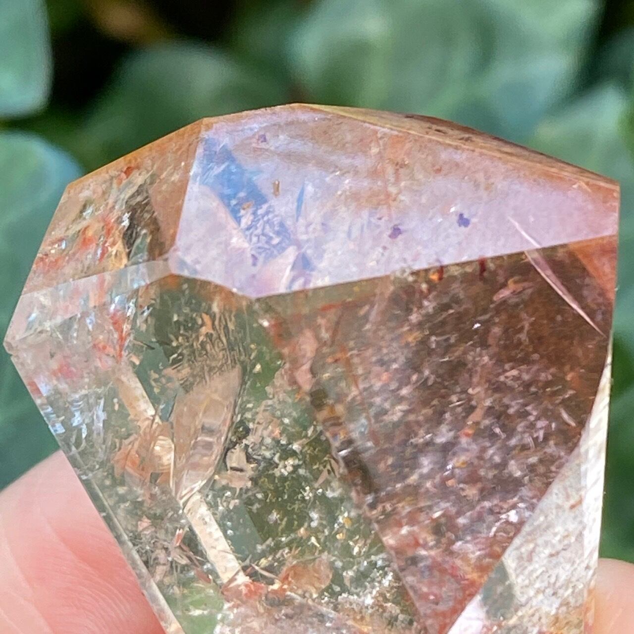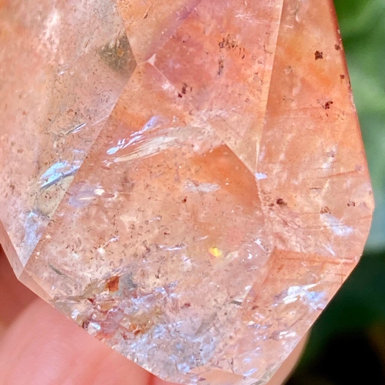 ポイント上部のコーティングは、極小のインクルージョンから構成された、非常に薄らとしたアメジストの色味(紫)にオレンジ色が混ざった色味となっています(底面から見るとわかり易いです)。画像では、紫やオレンジが鮮明に写っていますが、非常に控えめで、水晶にほんのり色が付いている感じです。コアのクリアクォーツ部分は非常に透過性が高く、点の様なインクルージョンが至る所に見られます。また虹も確認できます。