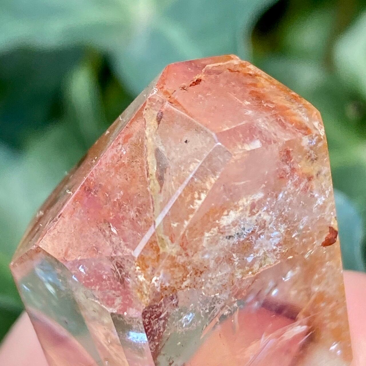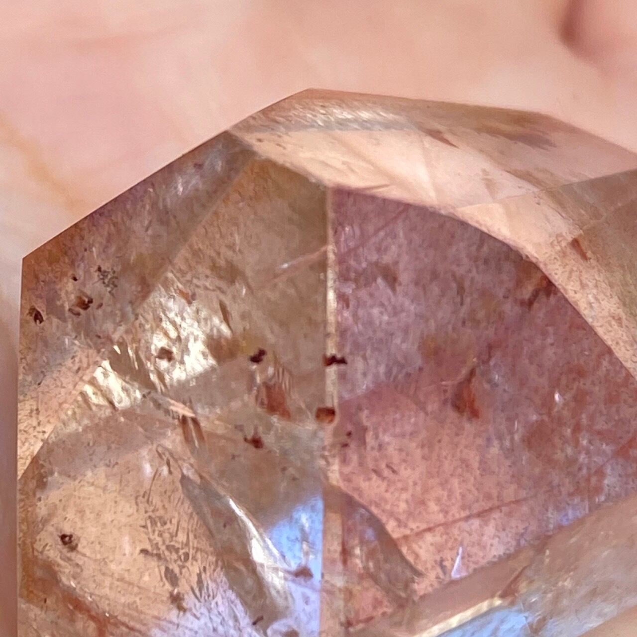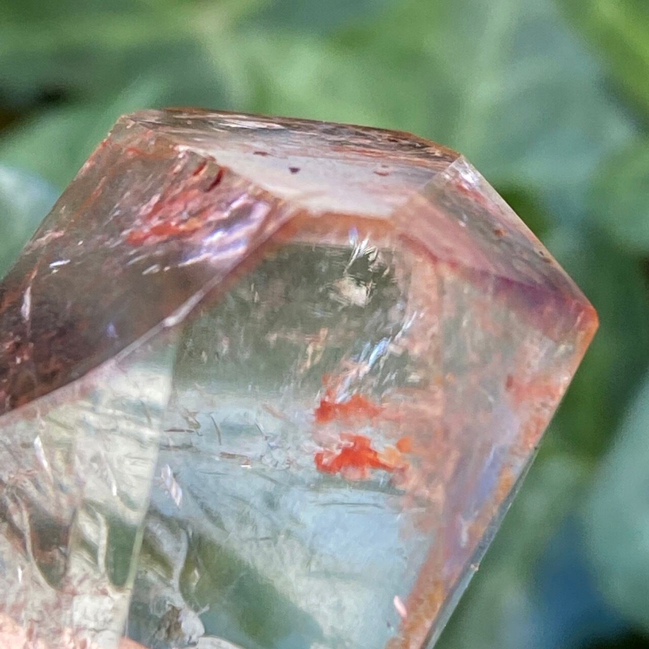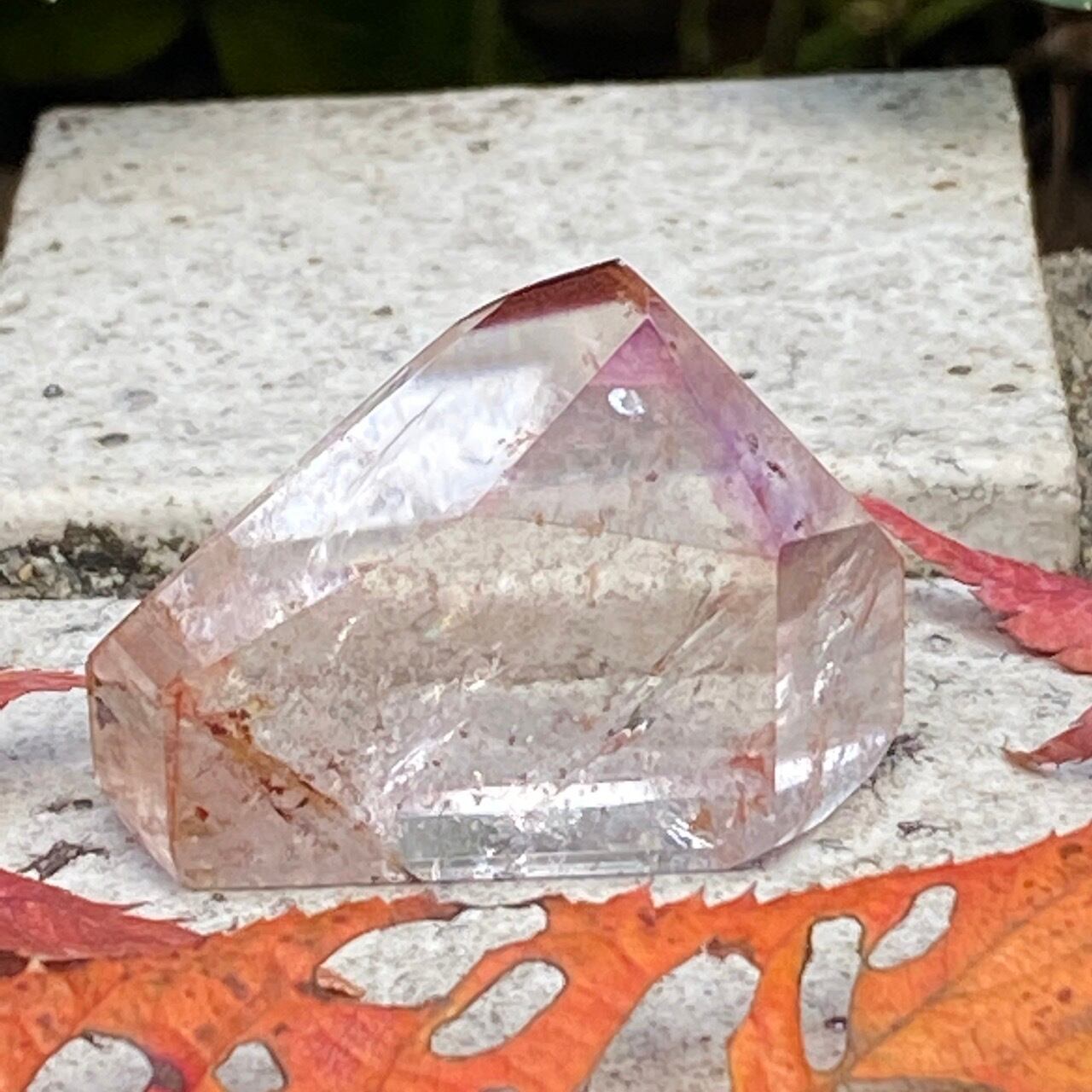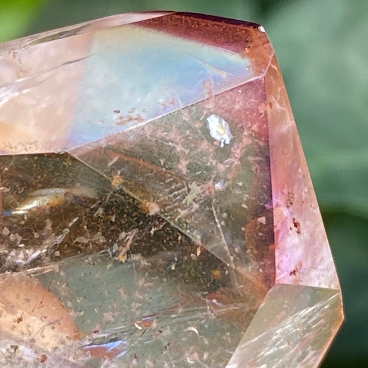 ポイント上部のコーティングは、極小のインクルージョンから構成された、非常に薄らとしたアメジストの色味(紫)にオレンジ色が混ざった色味となっています(底面から見るとわかり易いです)。画像では、紫やオレンジが鮮明に写っていますが、非常に控えめで、水晶にほんのり色が付いている感じです。コアのクリアクォーツ部分は非常に透過性が高く、点の様なインクルージョンが至る所に見られます。また虹も確認できます。