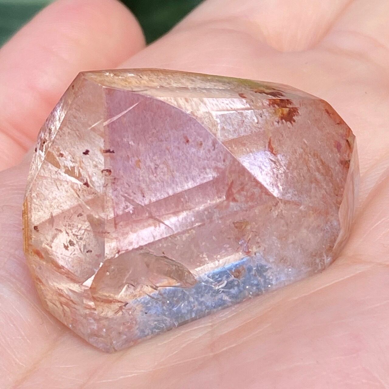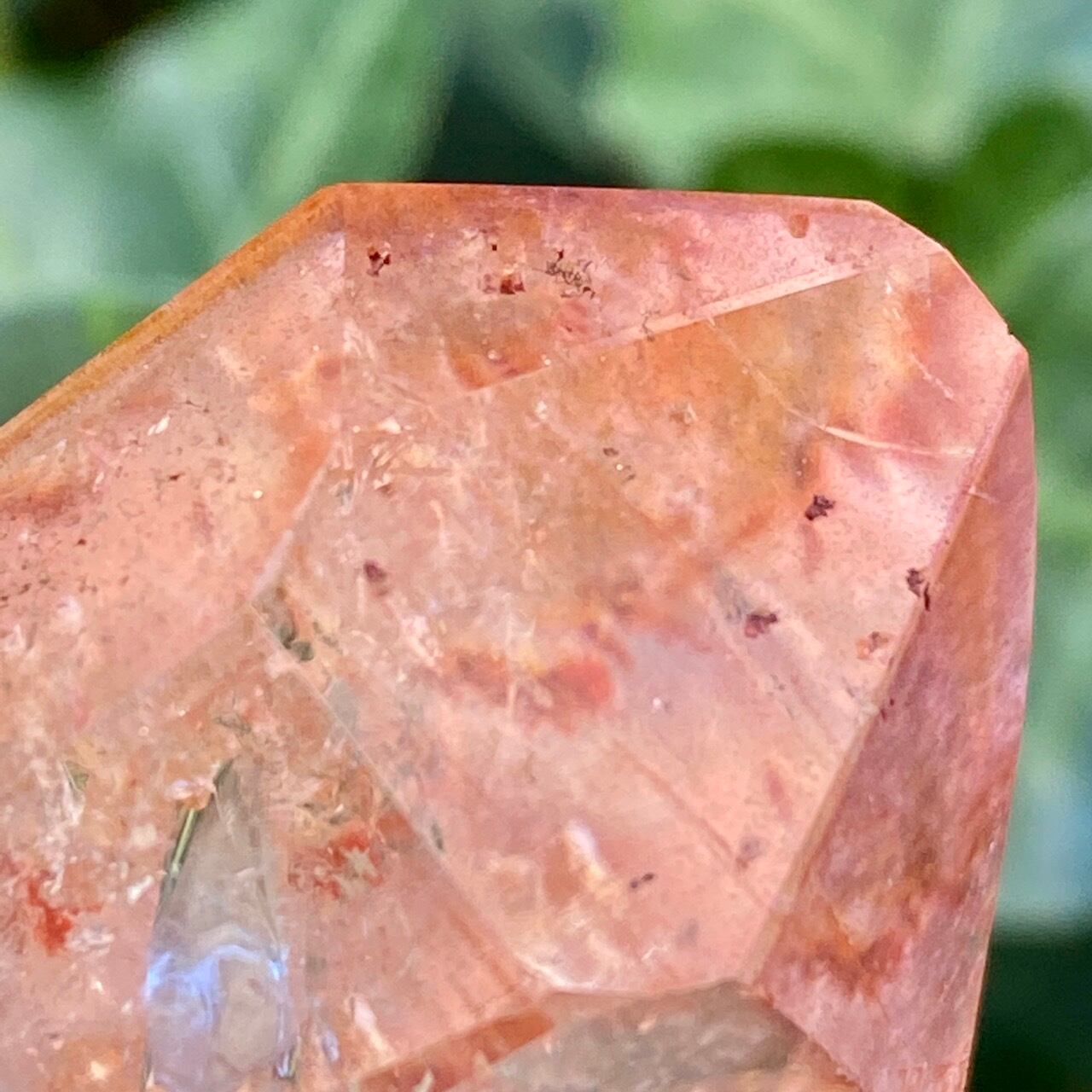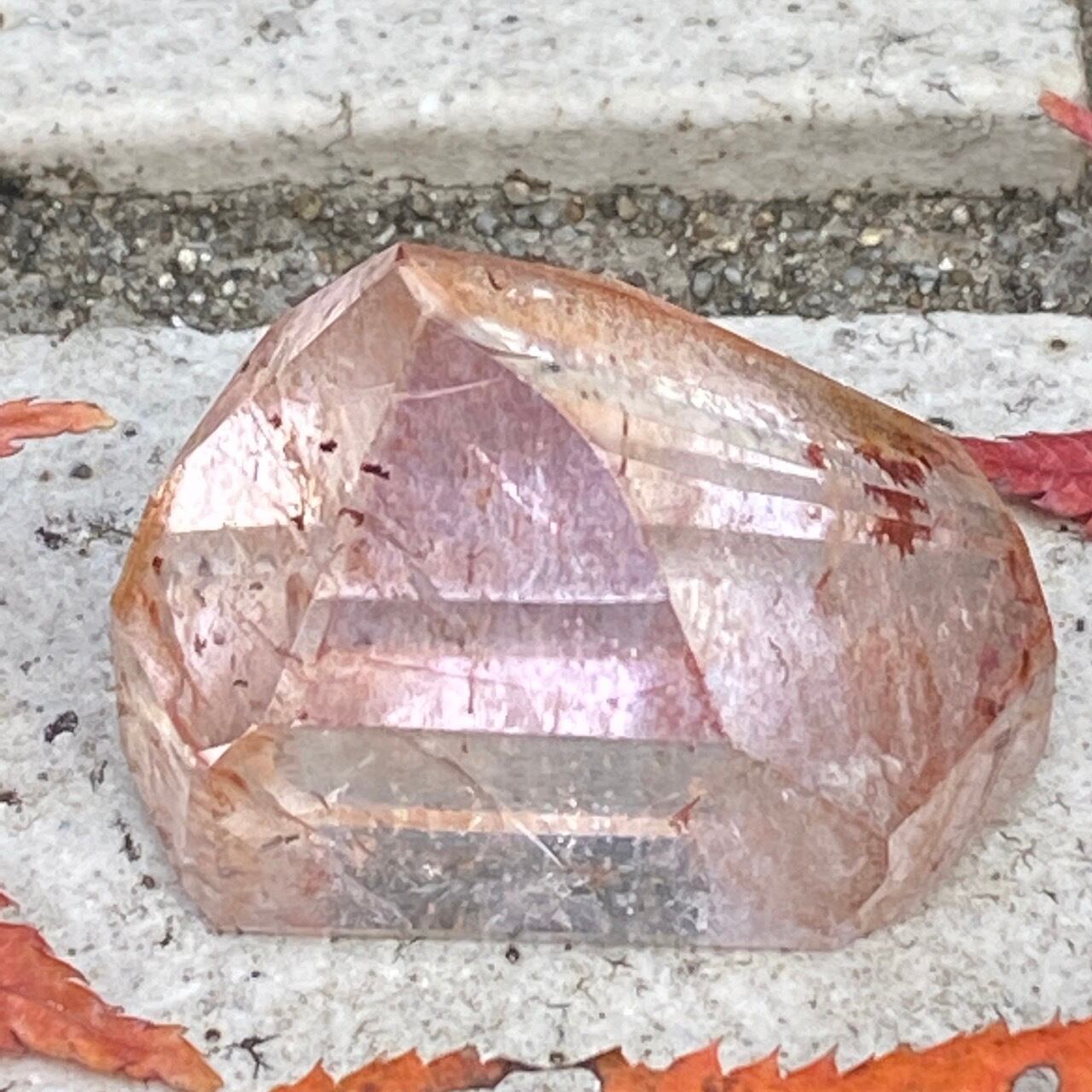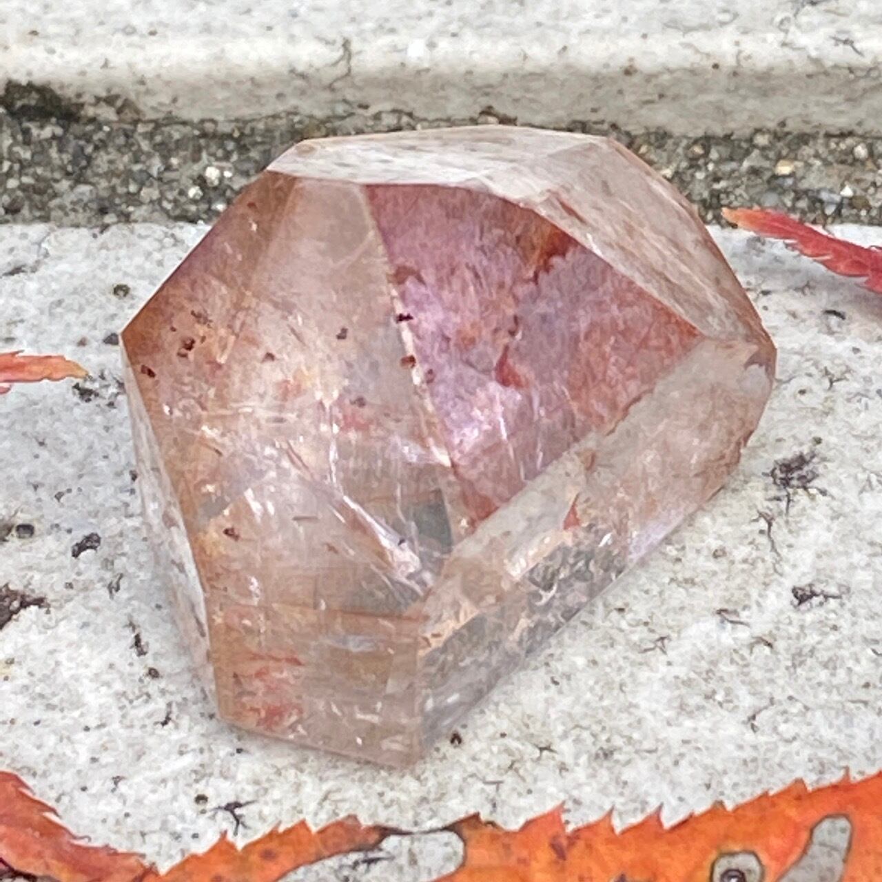 ポイント上部のコーティングは、極小のインクルージョンから構成された、非常に薄らとしたアメジストの色味(紫)にオレンジ色が混ざった色味となっています(底面から見るとわかり易いです)。画像では、紫やオレンジが鮮明に写っていますが、非常に控えめで、水晶にほんのり色が付いている感じです。コアのクリアクォーツ部分は非常に透過性が高く、点の様なインクルージョンが至る所に見られます。また虹も確認できます。