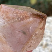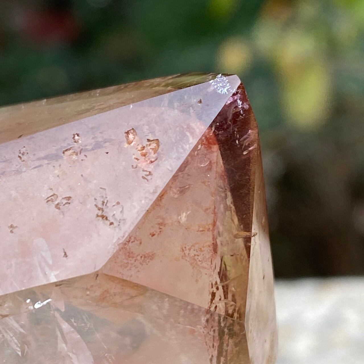 ポイント上部のコーティングはアメジストの色味(紫)にオレンジ(朱色)が混ざった様な色味で非常に薄らとしています。裏側のコアのクォーツが露出している部分からはクォーツ内部を覗く事ができ、またコーティングの断面図も確認できます。正面上部の面には、無数のインクルージョンがコーティングに見られます。ドリームコートの原石は、他の水晶よりダメージが大きいのですが、子の子は剥離とか無く、わりと綺麗な状態です。そして、ポイント上部より虹が確認できます。