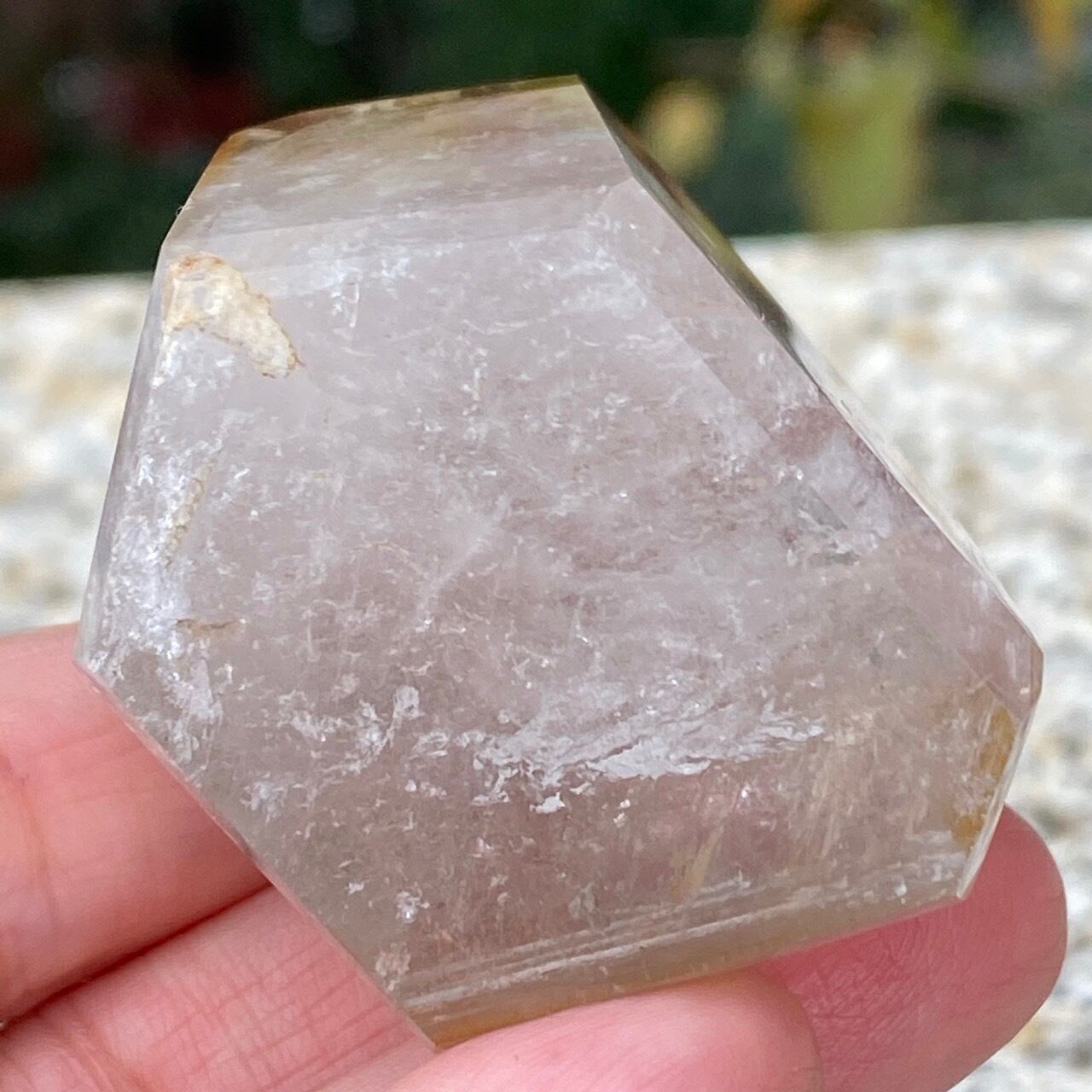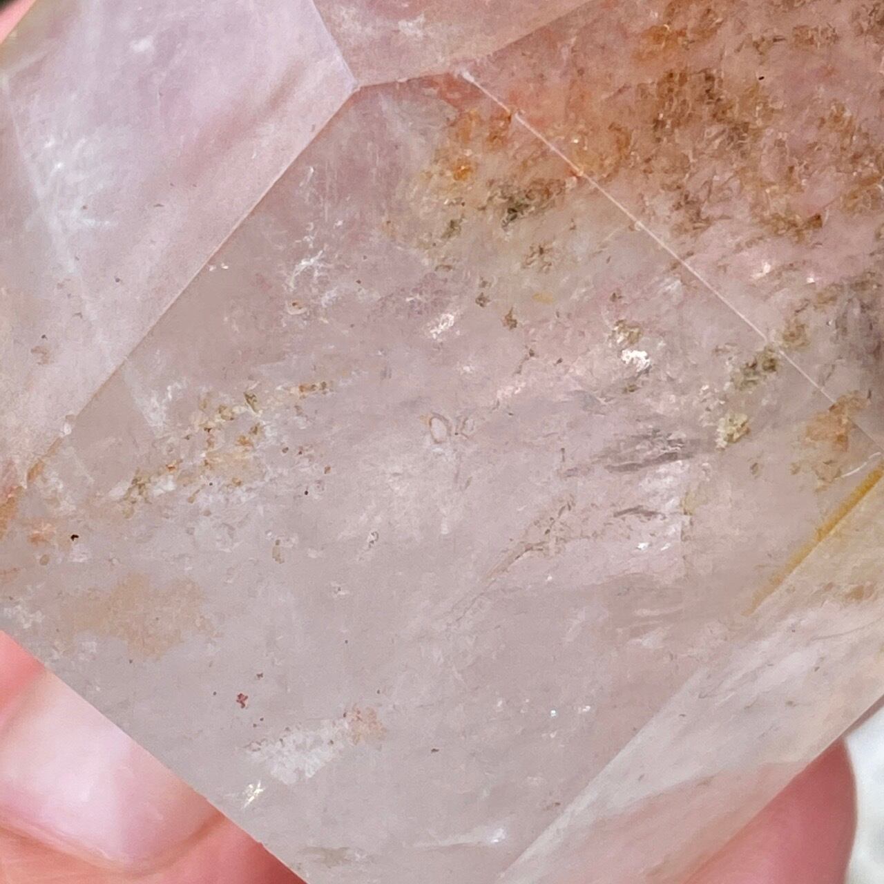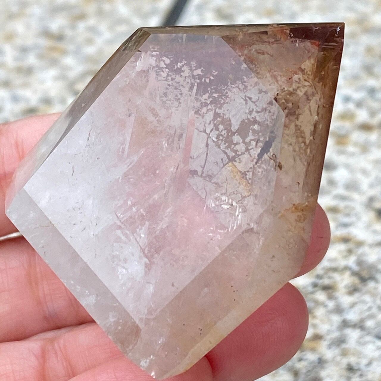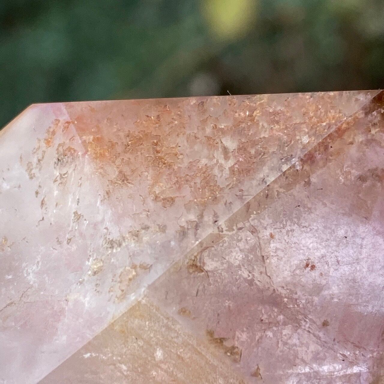 ※水晶のため、特性としてクラックやチップ、キズや凹み、内包物、そして剥離痕等がございます。特に外側のコーティング部分は、コア部分との剥離痕、そしてクラック(研磨に耐え得る様接着剤が使用されていて、接着剤が露出している箇所有り)やチップ、内包物が表面に出ている事によるラフな質感の箇所等がある場合ございます。これら全て理解して受け入れて下さる方にご購入をお願い致します。