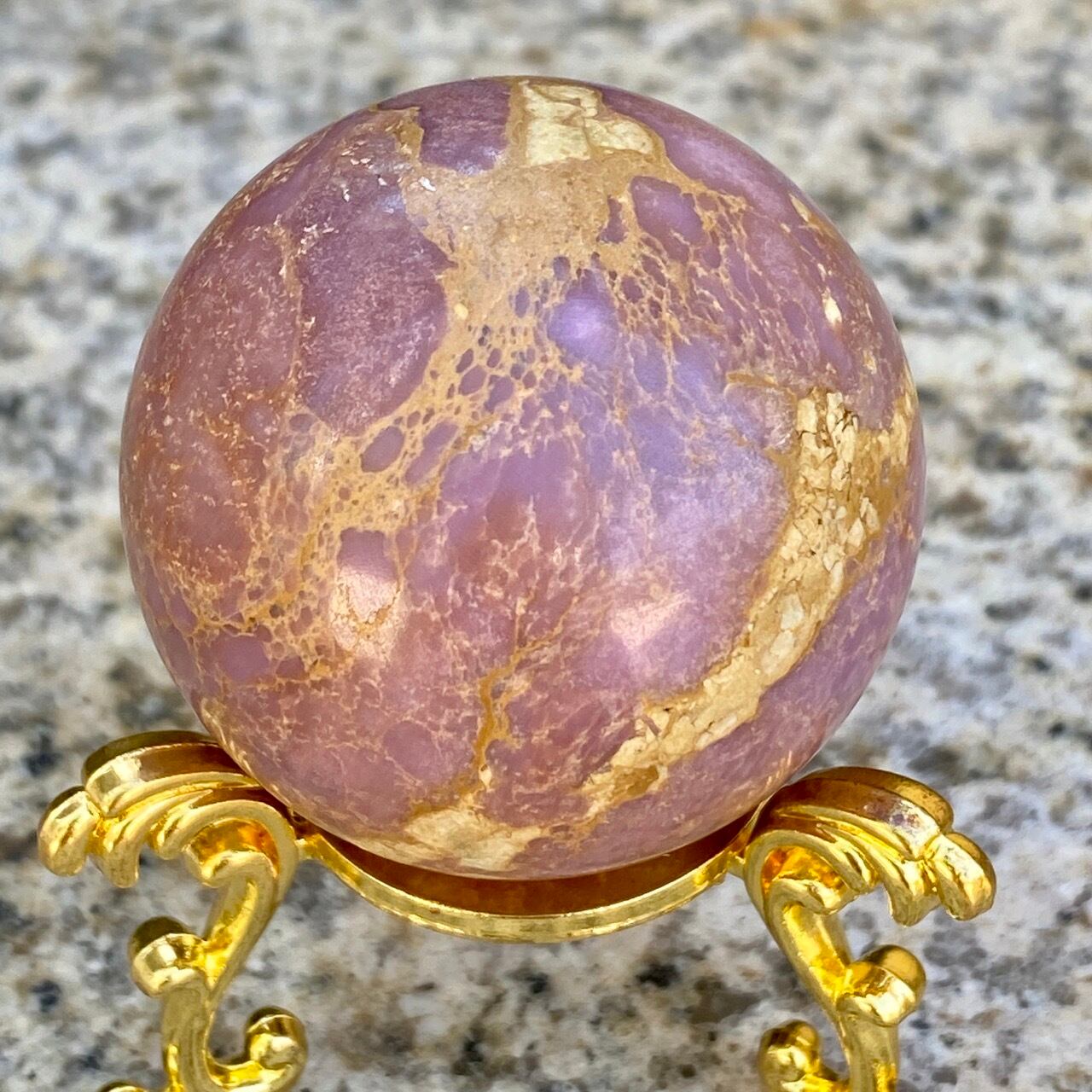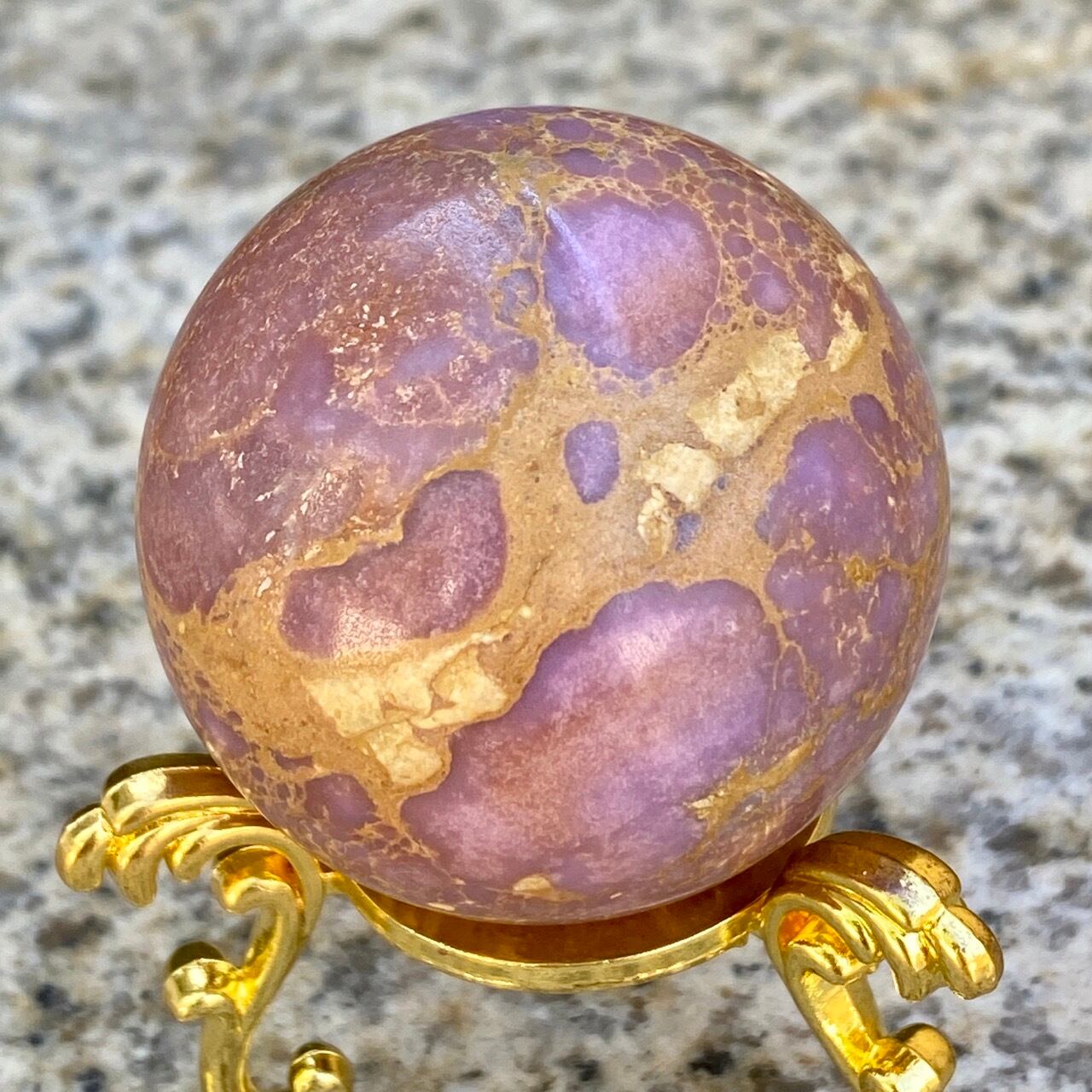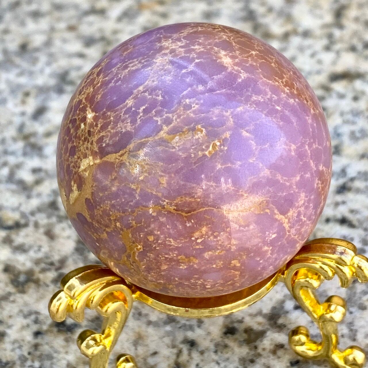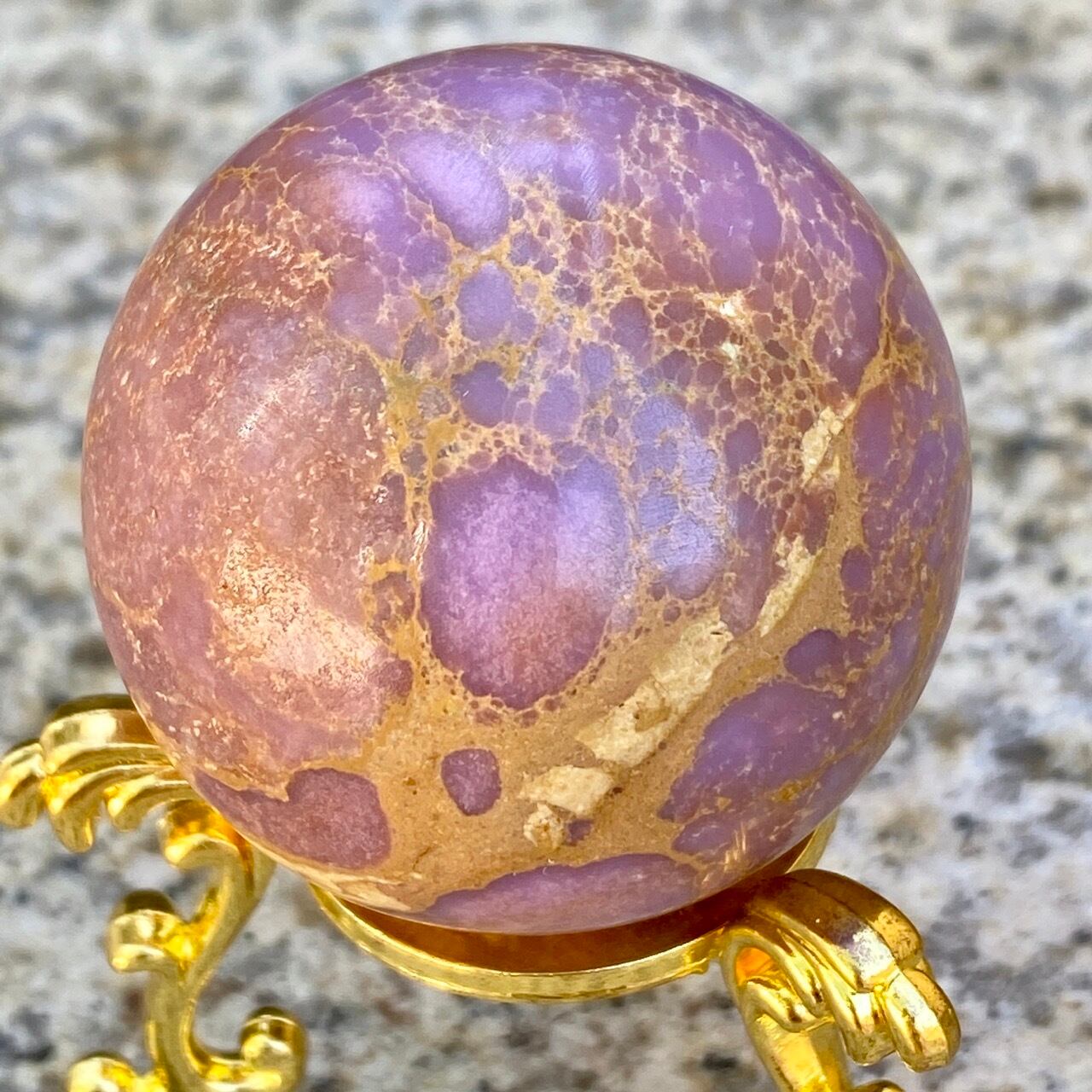優しいパープルの濃淡のベースに、黄土色〜黄色系の繊細な模様が映えます。この石は、時間を忘れて眺めていられる様な、幻想的かつ魅惑的な美しさと気品を秘めています。この優しい色味と神秘的な柄は世界中のパープルラバーを魅了します。