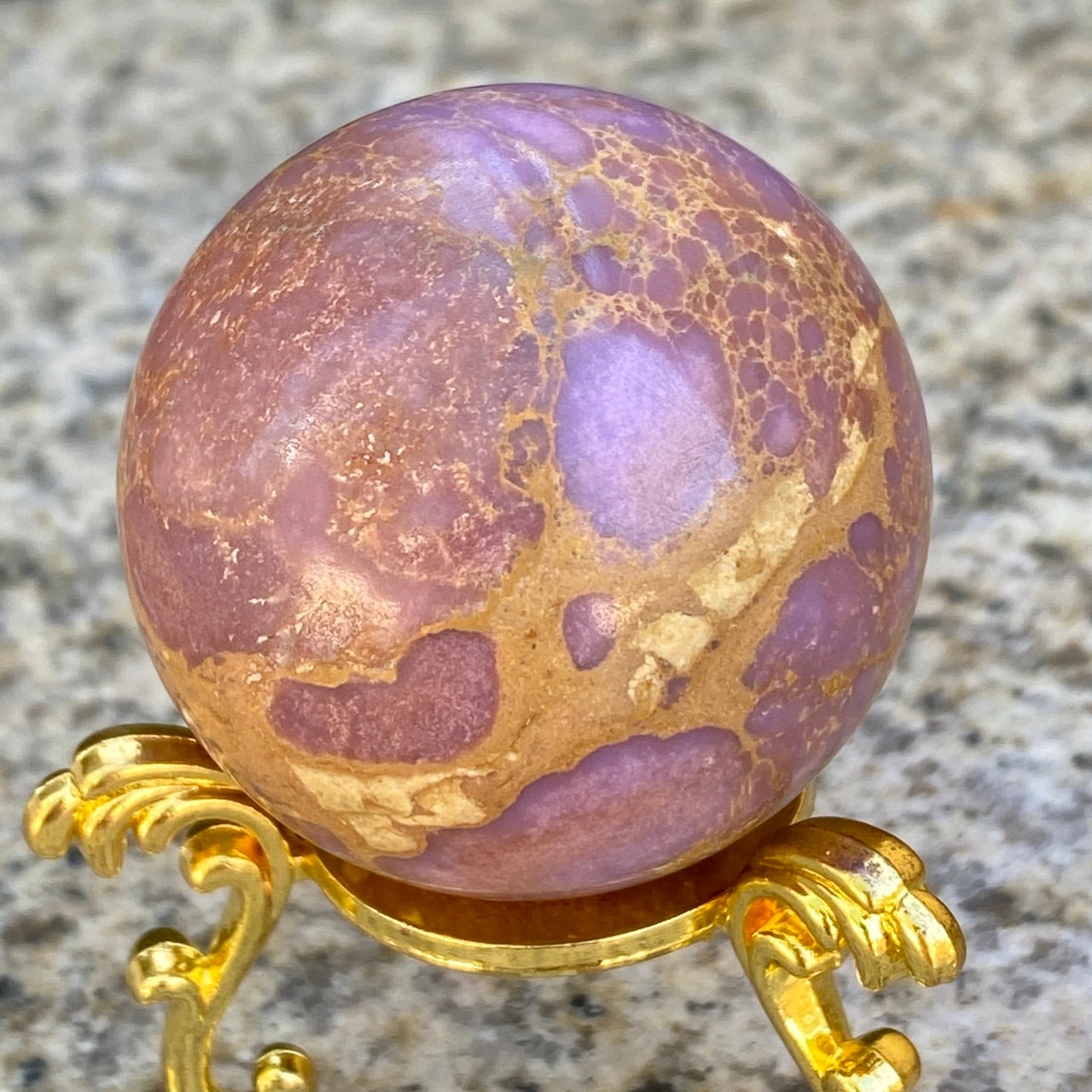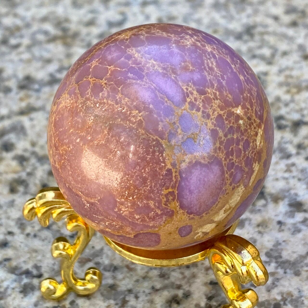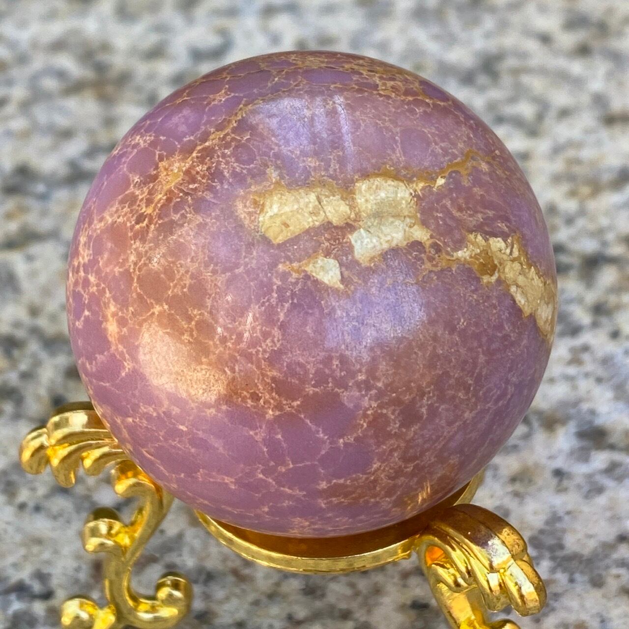 優しいパープルの濃淡のベースに、黄土色〜黄色系の繊細な模様が映えます。この石は、時間を忘れて眺めていられる様な、幻想的かつ魅惑的な美しさと気品を秘めています。この優しい色味と神秘的な柄は世界中のパープルラバーを魅了します。