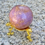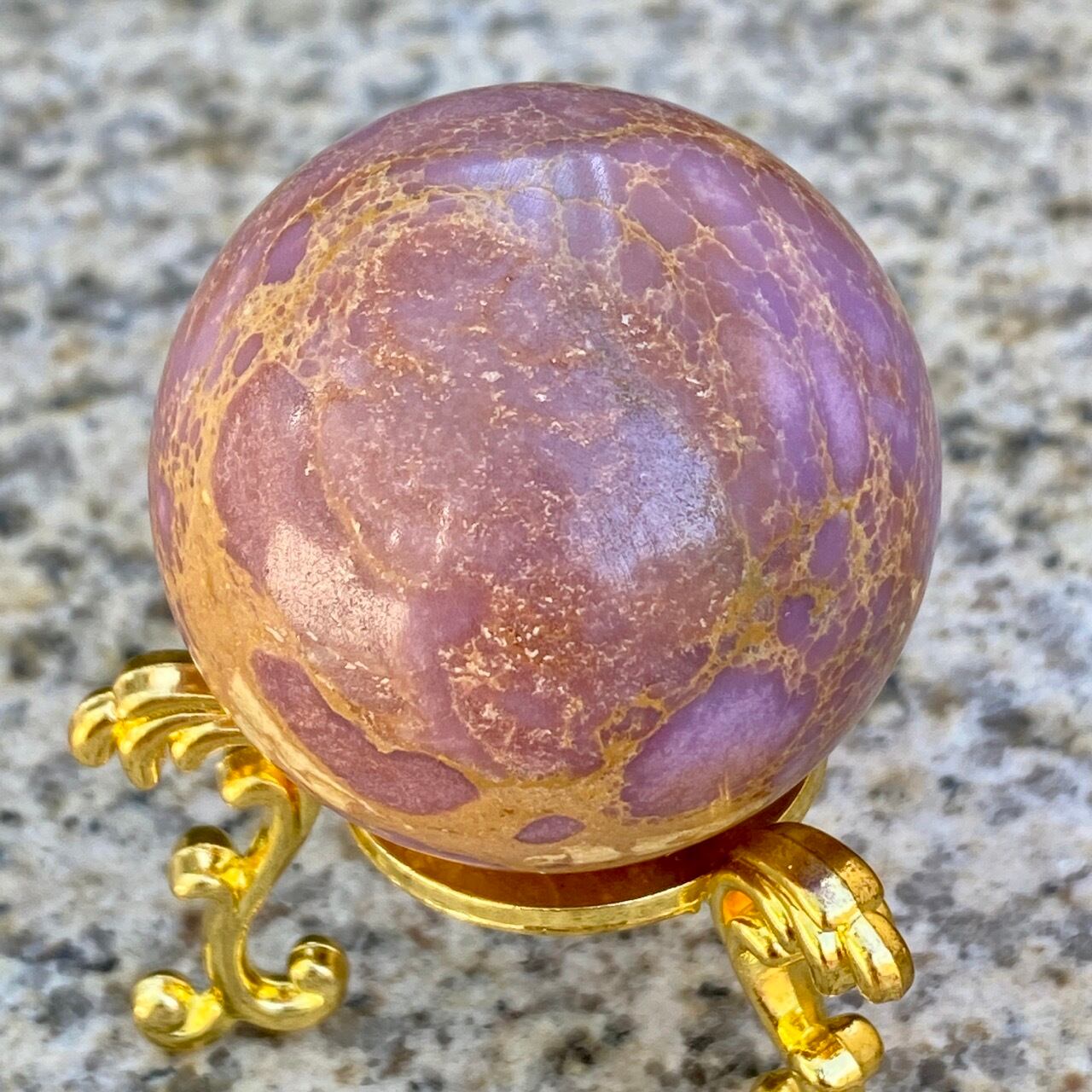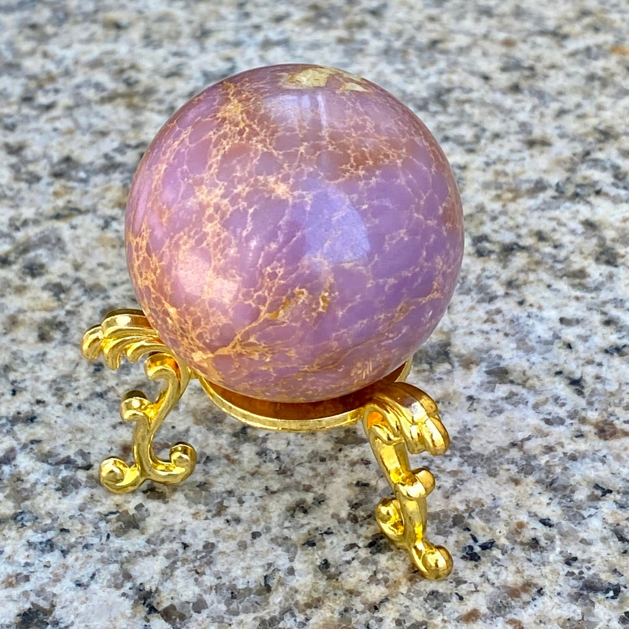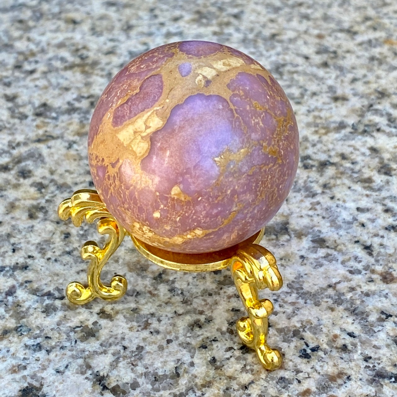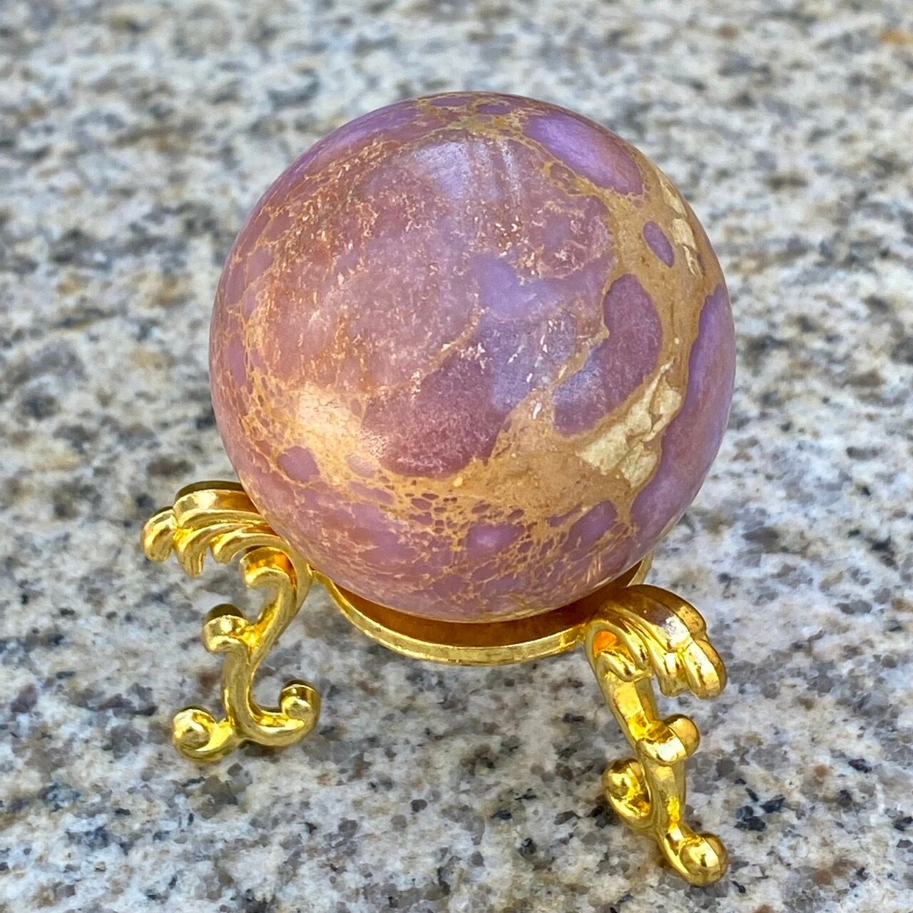 優しいパープルの濃淡のベースに、黄土色〜黄色系の繊細な模様が映えます。この石は、時間を忘れて眺めていられる様な、幻想的かつ魅惑的な美しさと気品を秘めています。この優しい色味と神秘的な柄は世界中のパープルラバーを魅了します。