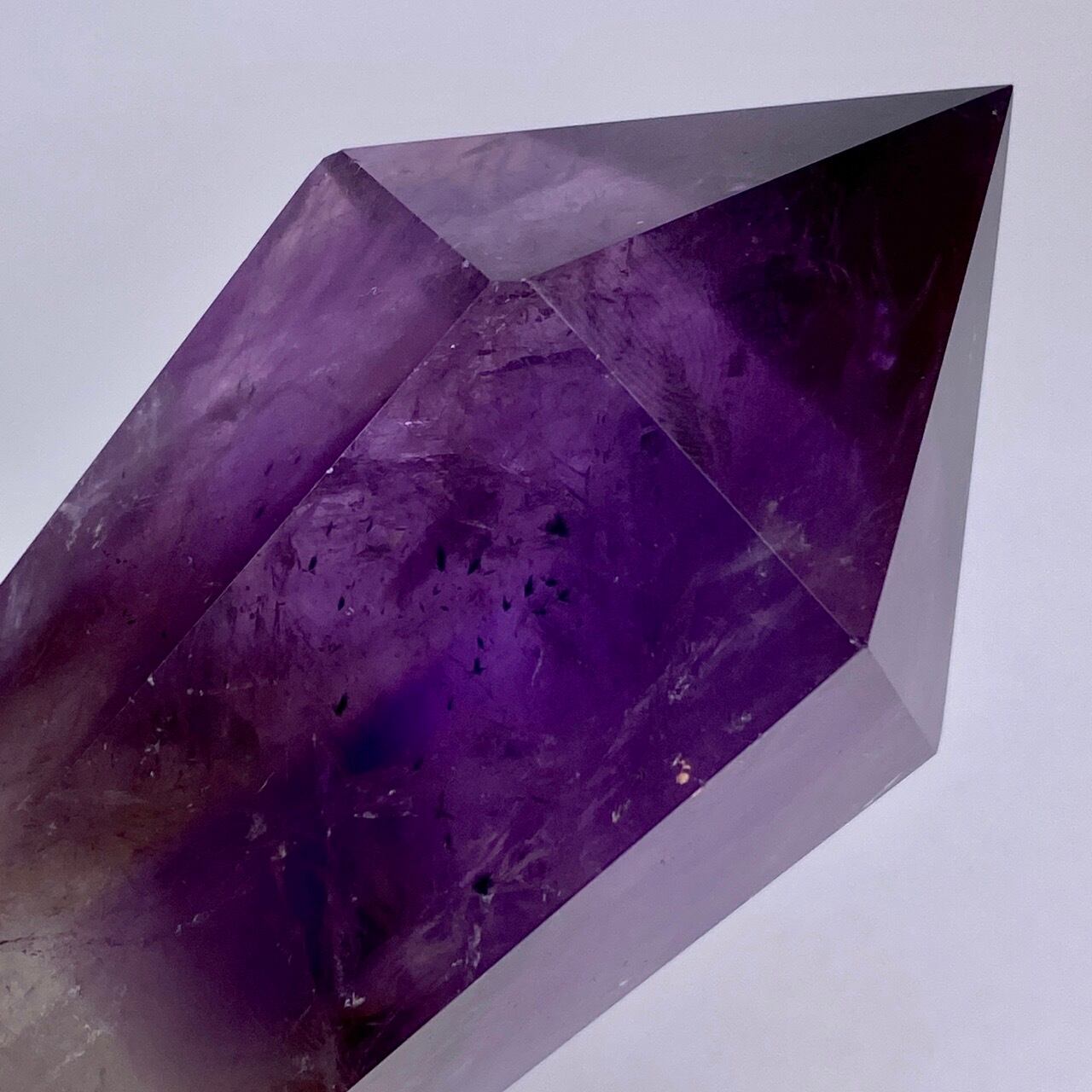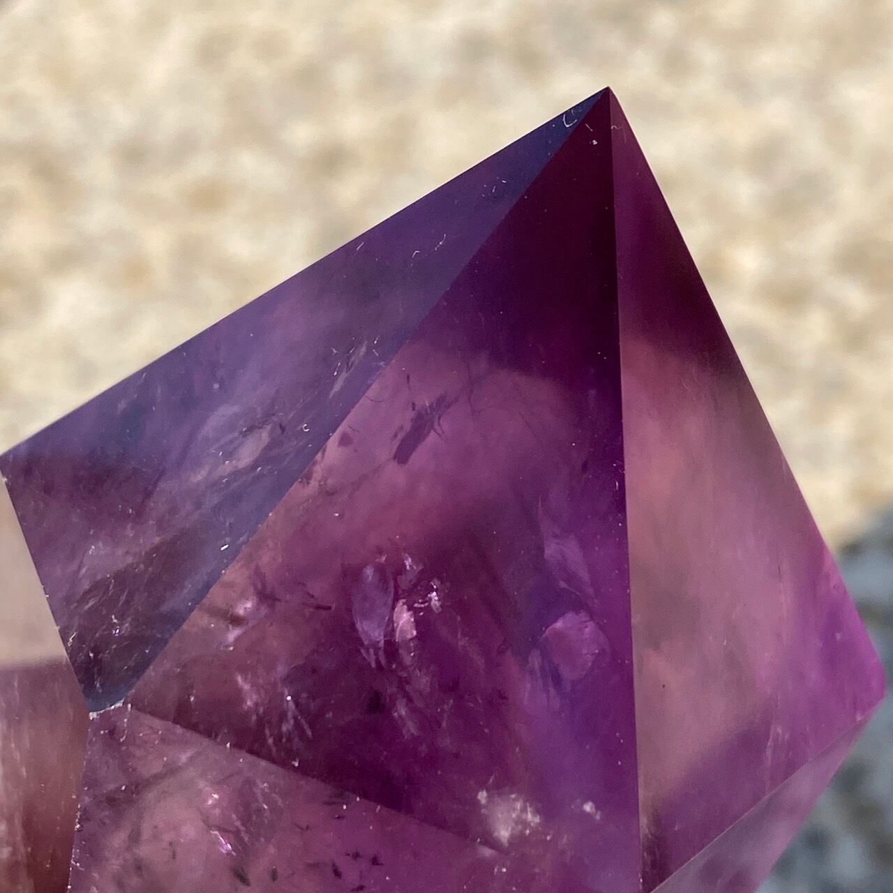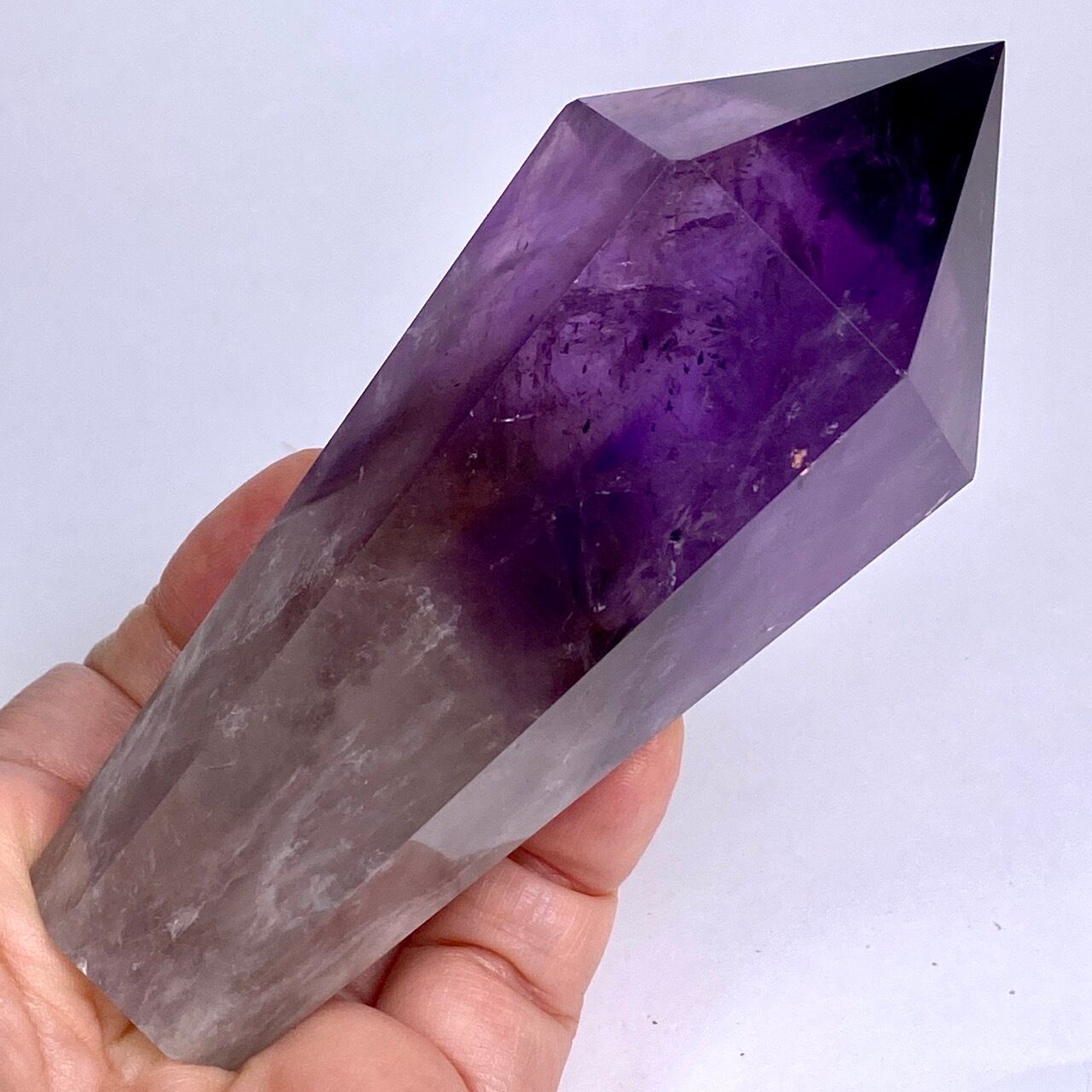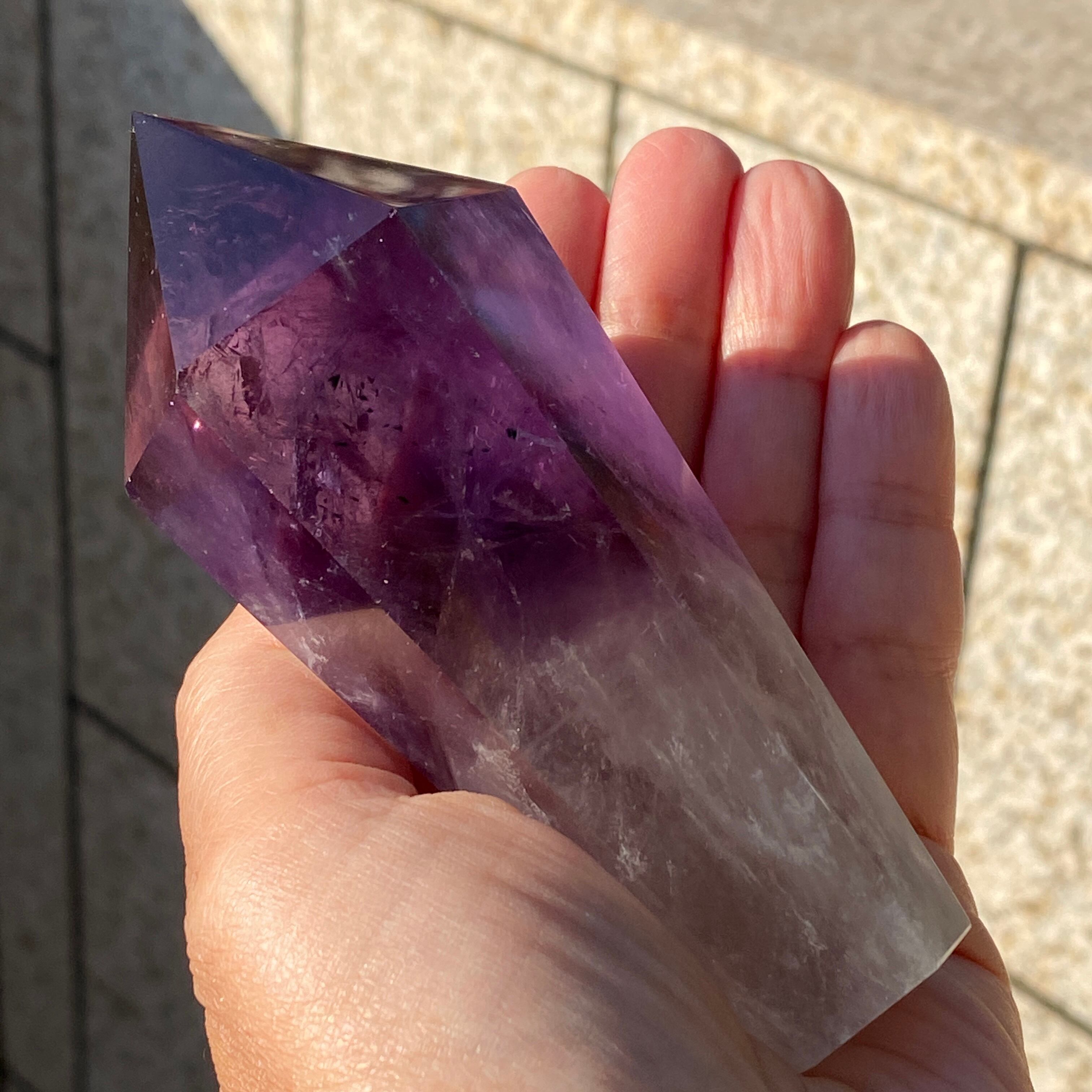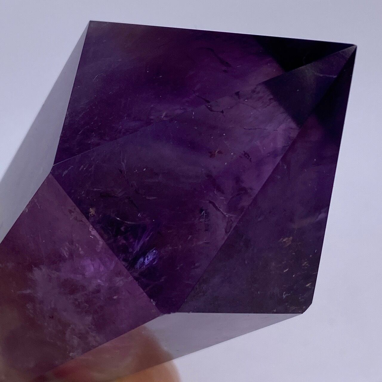 重量感と存在感があり、握り易い様に、先にいくにつれ細くカットされています。上部から見ると六面から成る六角形をしています。また、虹も確認できます。手に握って、とにかく深い色味を眺めていたい、そして美しい子です。