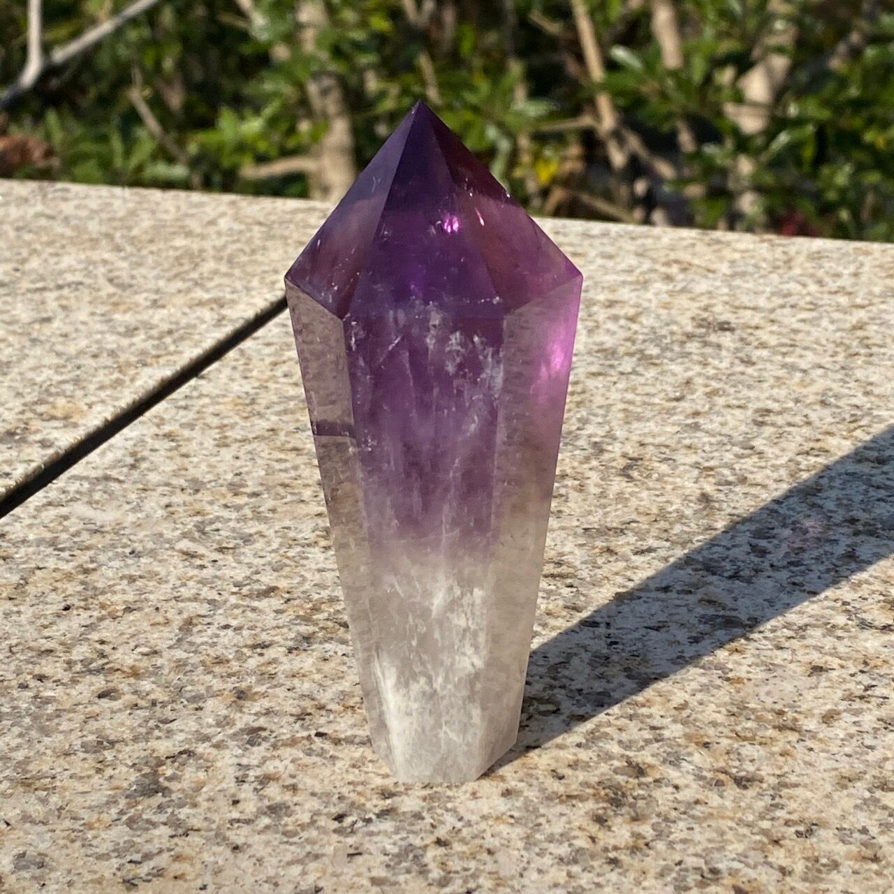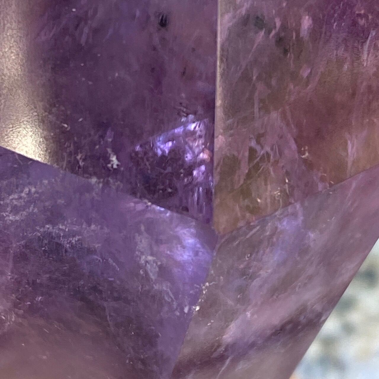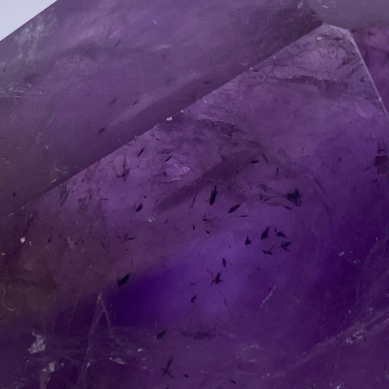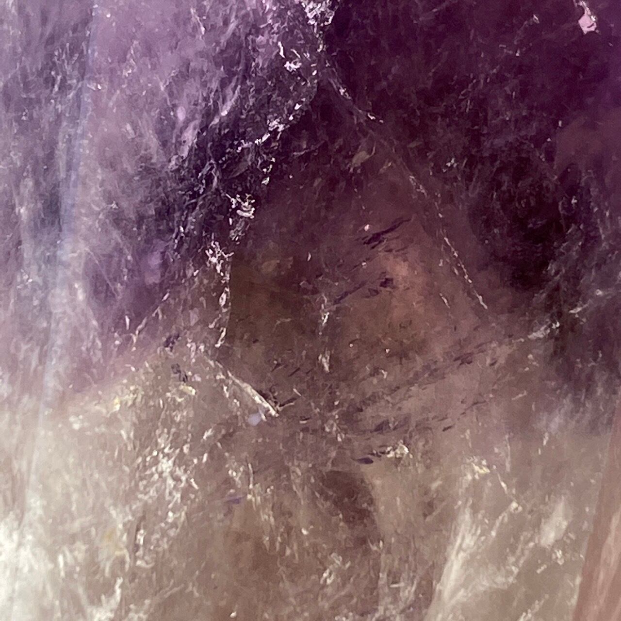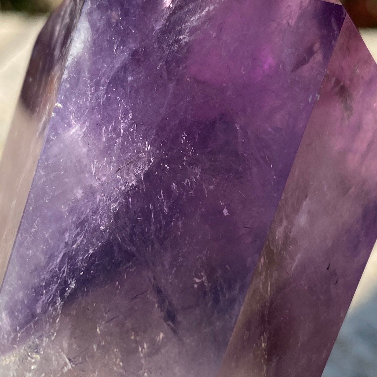 重量感と存在感があり、握り易い様に、先にいくにつれ細くカットされています。上部から見ると六面から成る六角形をしています。また、虹も確認できます。手に握って、とにかく深い色味を眺めていたい、そして美しい子です。