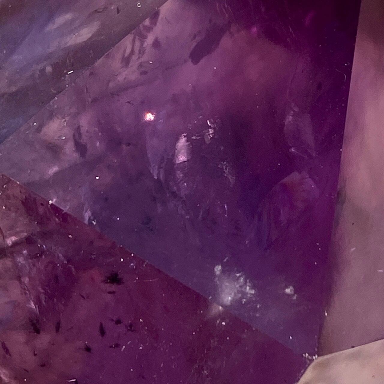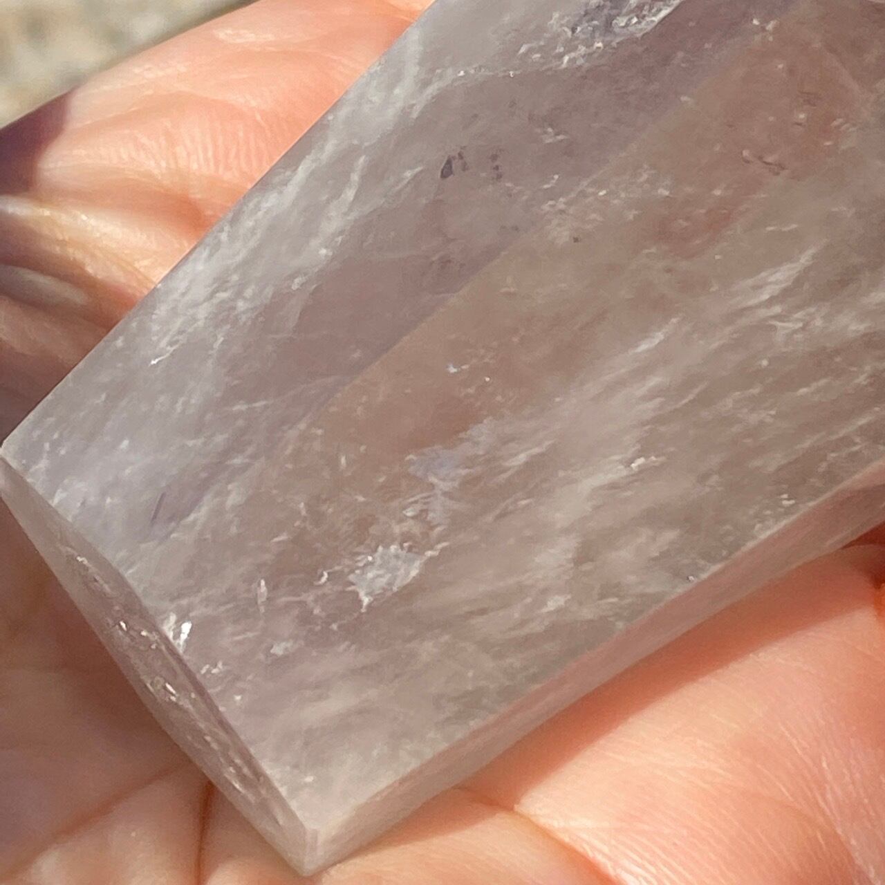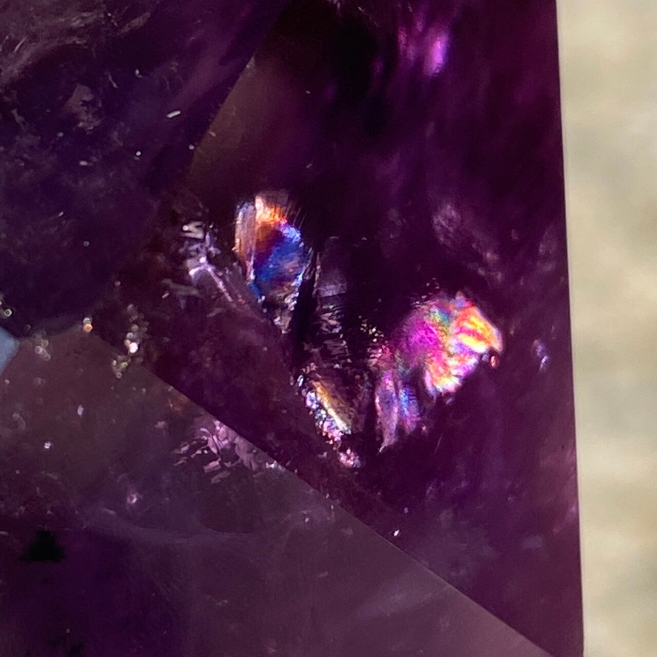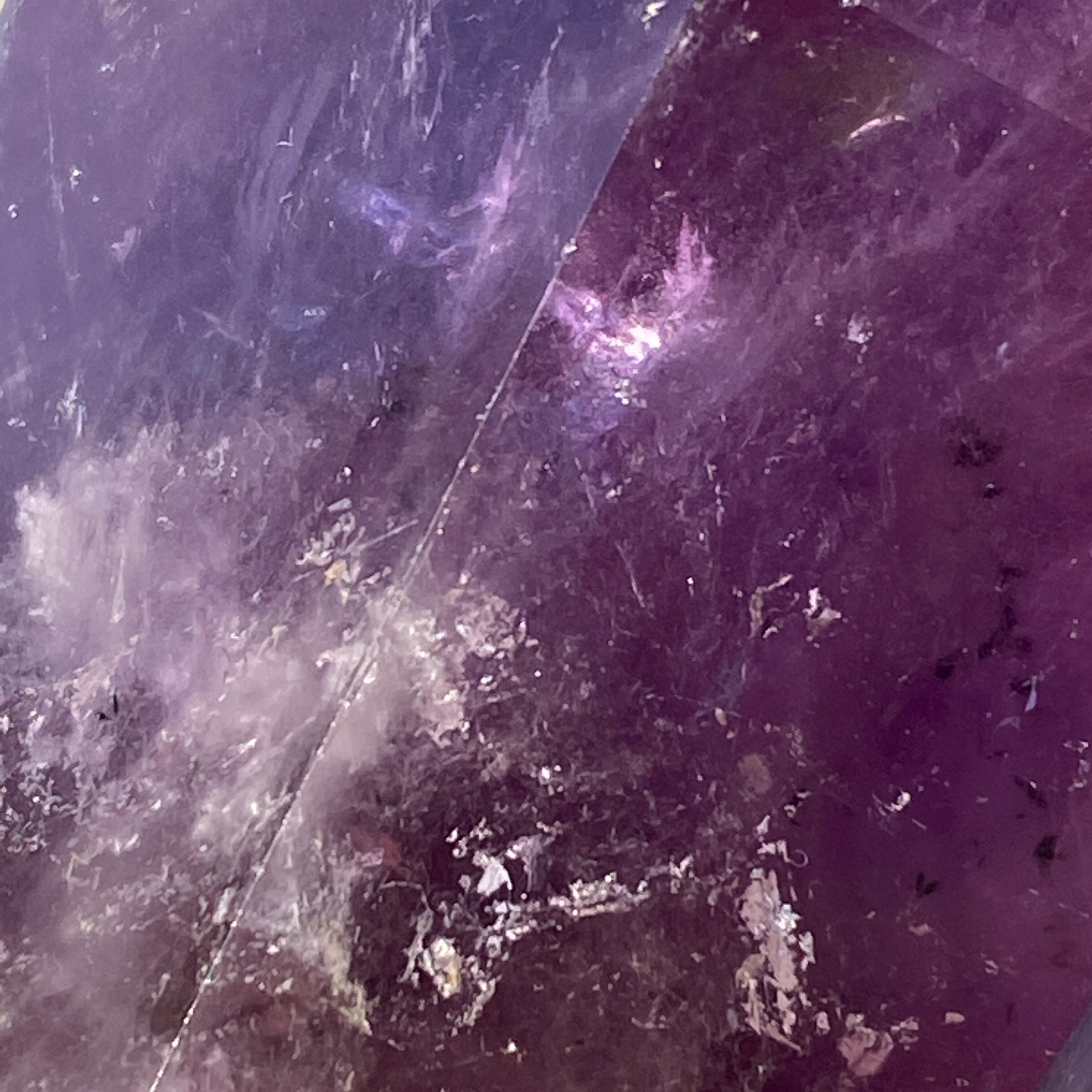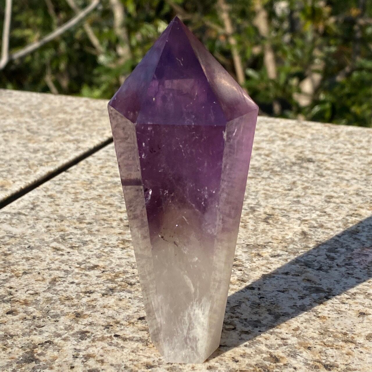 重量感と存在感があり、握り易い様に、先にいくにつれ細くカットされています。上部から見ると六面から成る六角形をしています。また、虹も確認できます。手に握って、とにかく深い色味を眺めていたい、そして美しい子です。