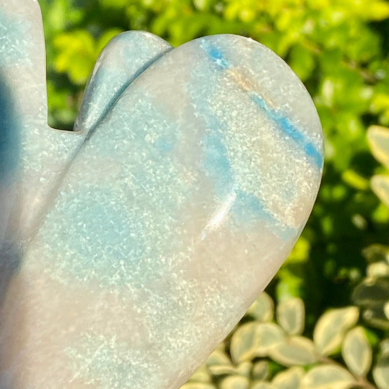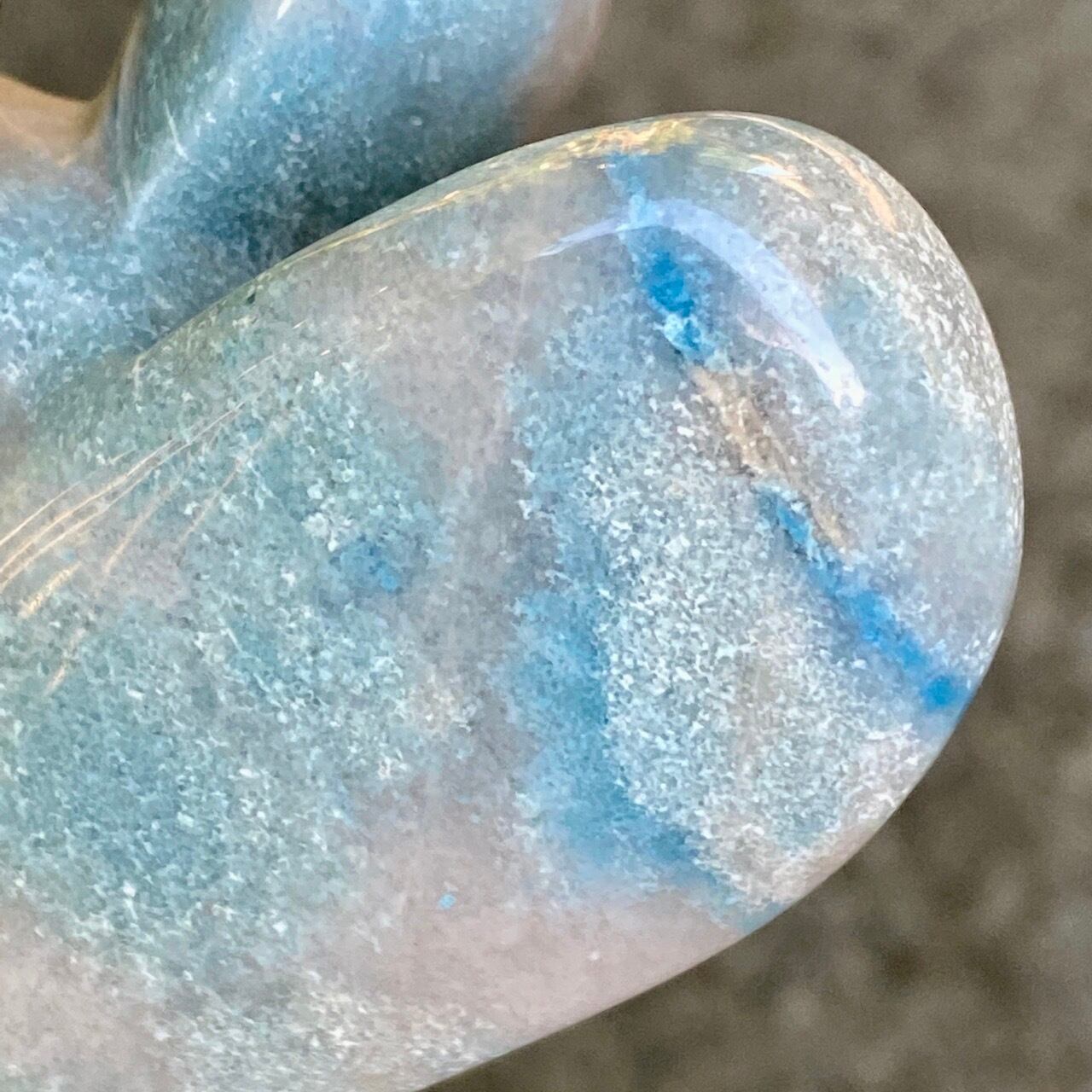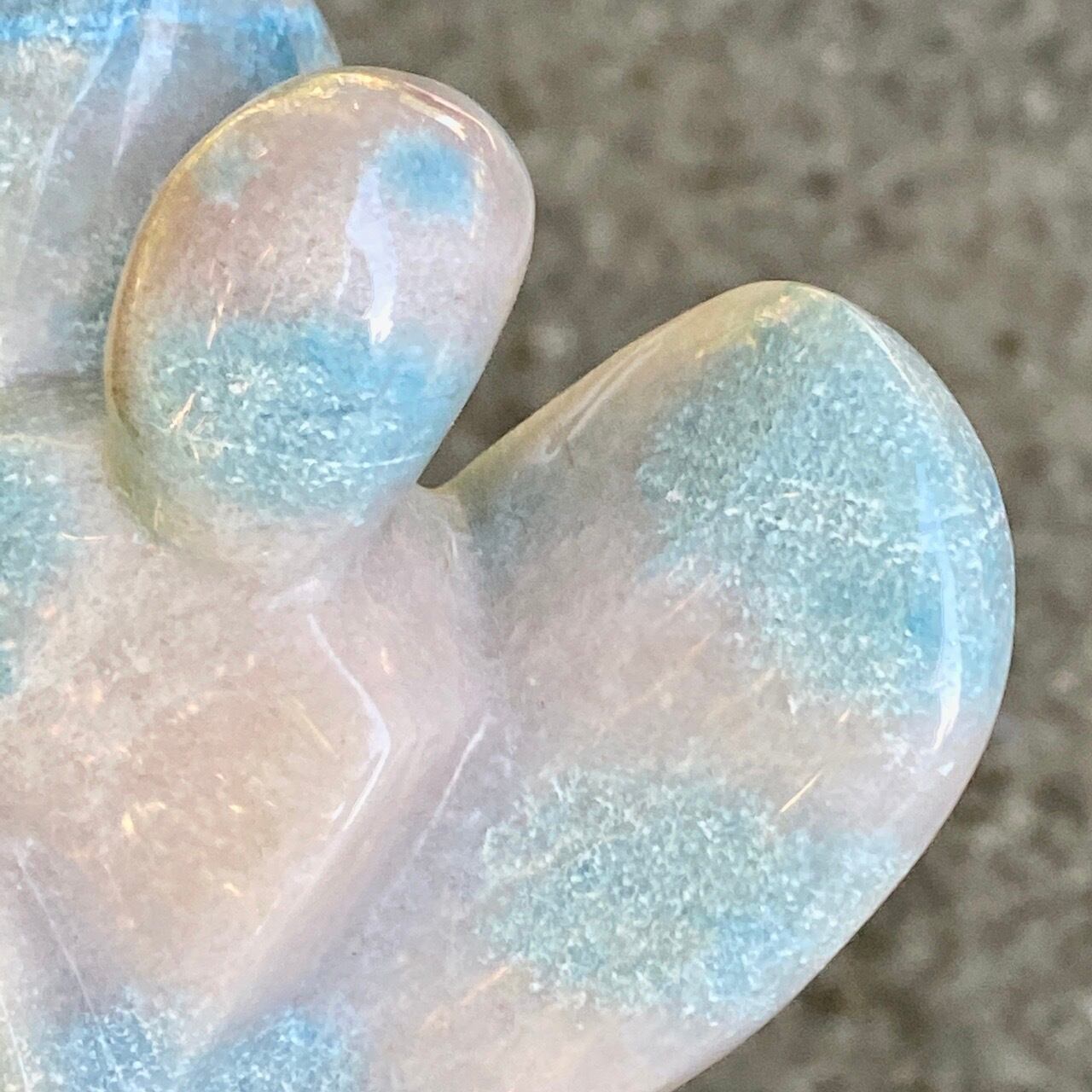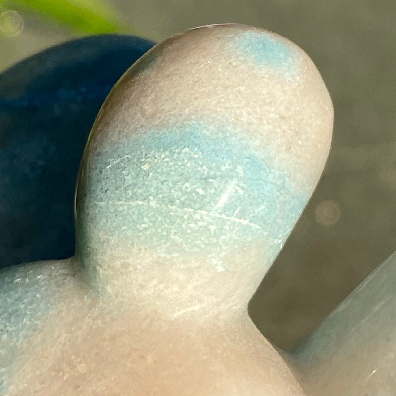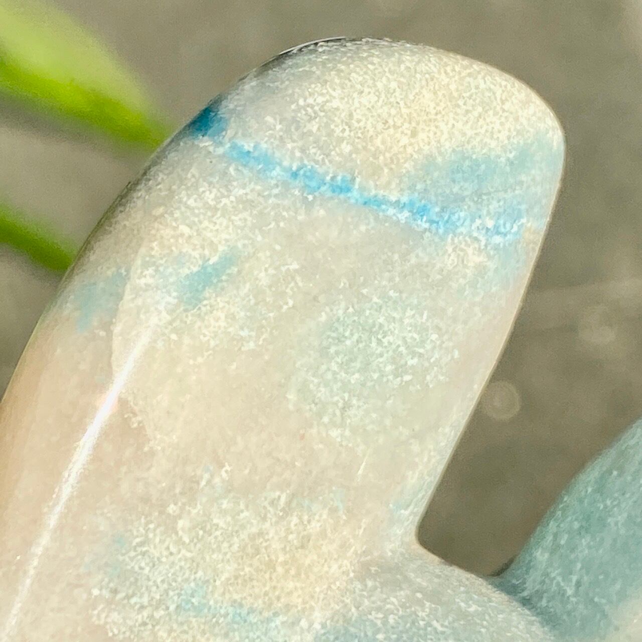 店主の大好きな石、トロレアイトの天使で、ベースの色はトロレアイトの色味の中でも白っぽい、乳白色のような色味で、ベイビーブルーの雲の様なパッチが配された素敵な子です。トロレアイトの本当に素晴らしいところは、粒子のような点が表面に浮き出るところで、白とベビーブルーがミックスしているところは非常に美しく、魅力的で、時を忘れて愛でてしまいます。