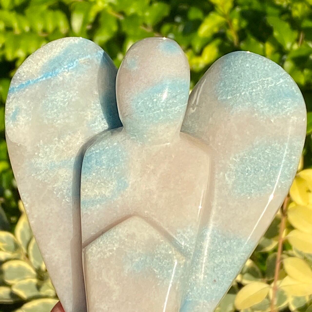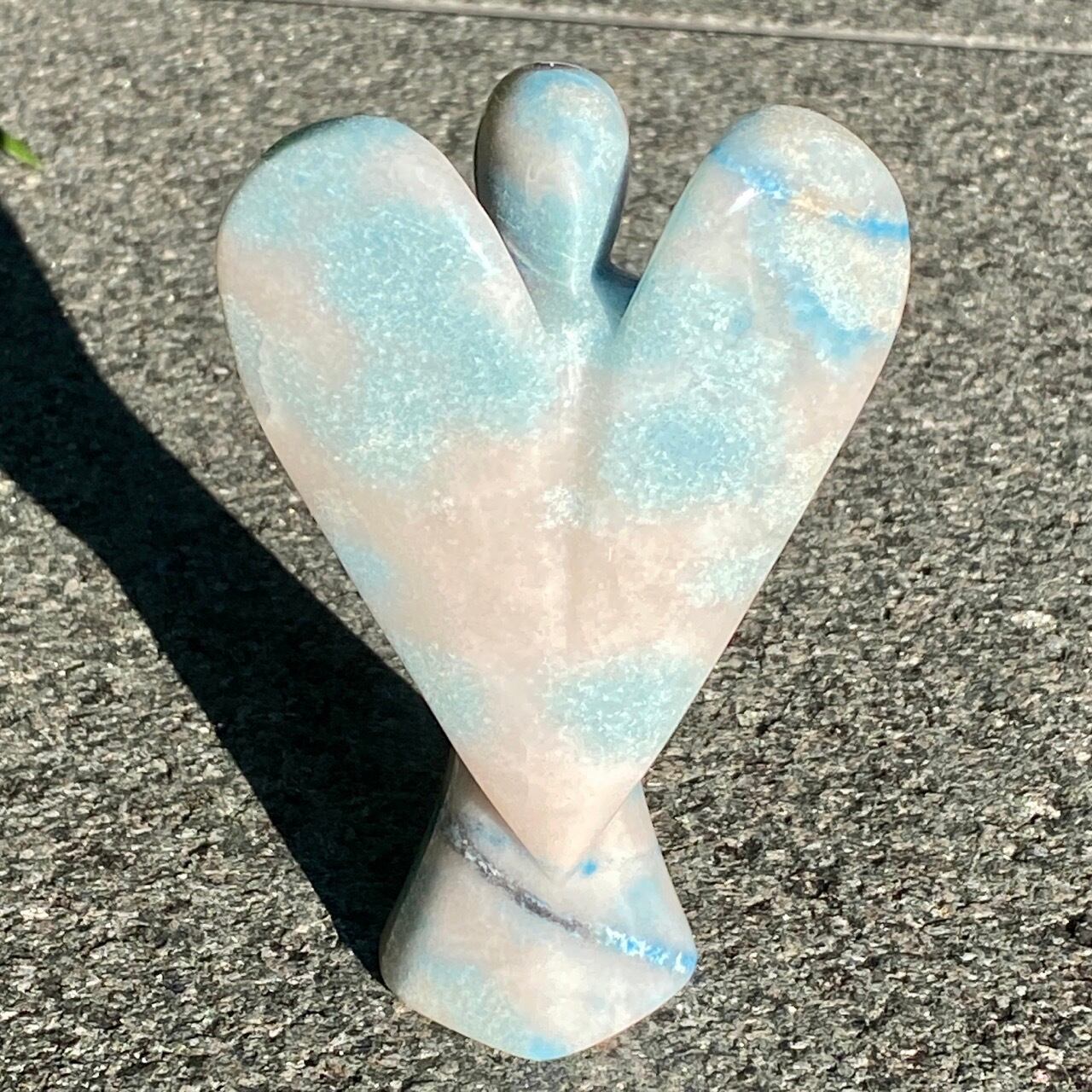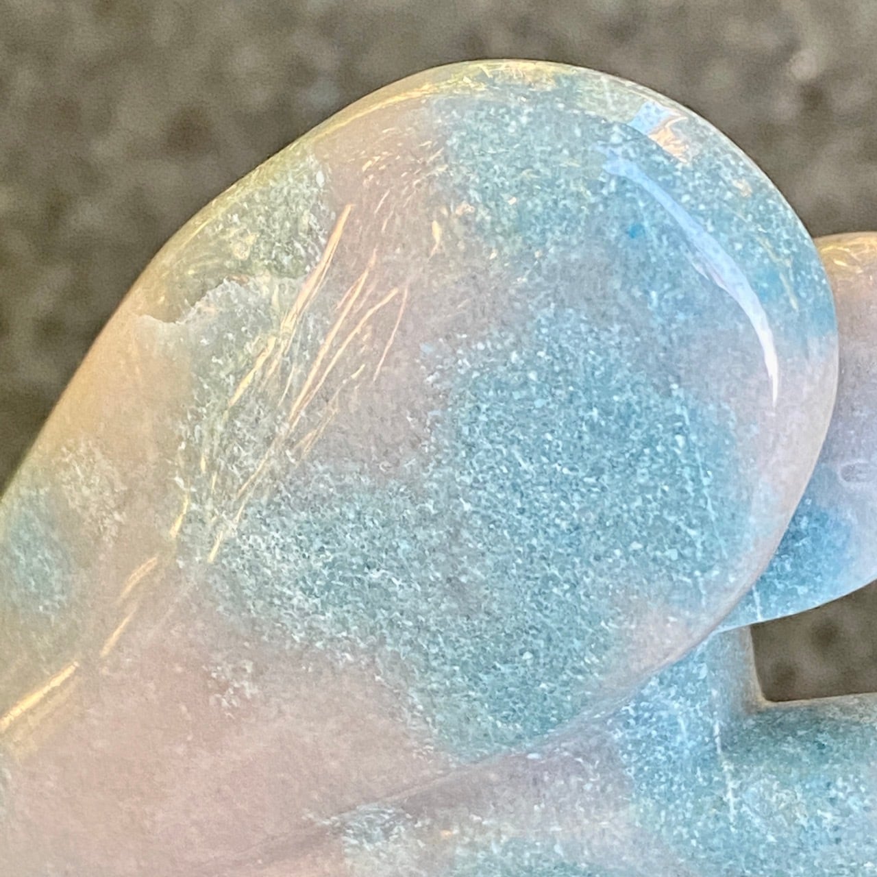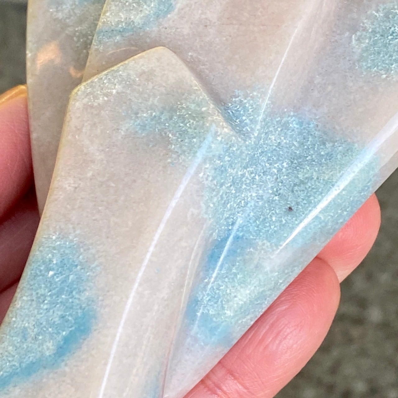 店主の大好きな石、トロレアイトの天使で、ベースの色はトロレアイトの色味の中でも白っぽい、乳白色のような色味で、ベイビーブルーの雲の様なパッチが配された素敵な子です。トロレアイトの本当に素晴らしいところは、粒子のような点が表面に浮き出るところで、白とベビーブルーがミックスしているところは非常に美しく、魅力的で、時を忘れて愛でてしまいます。