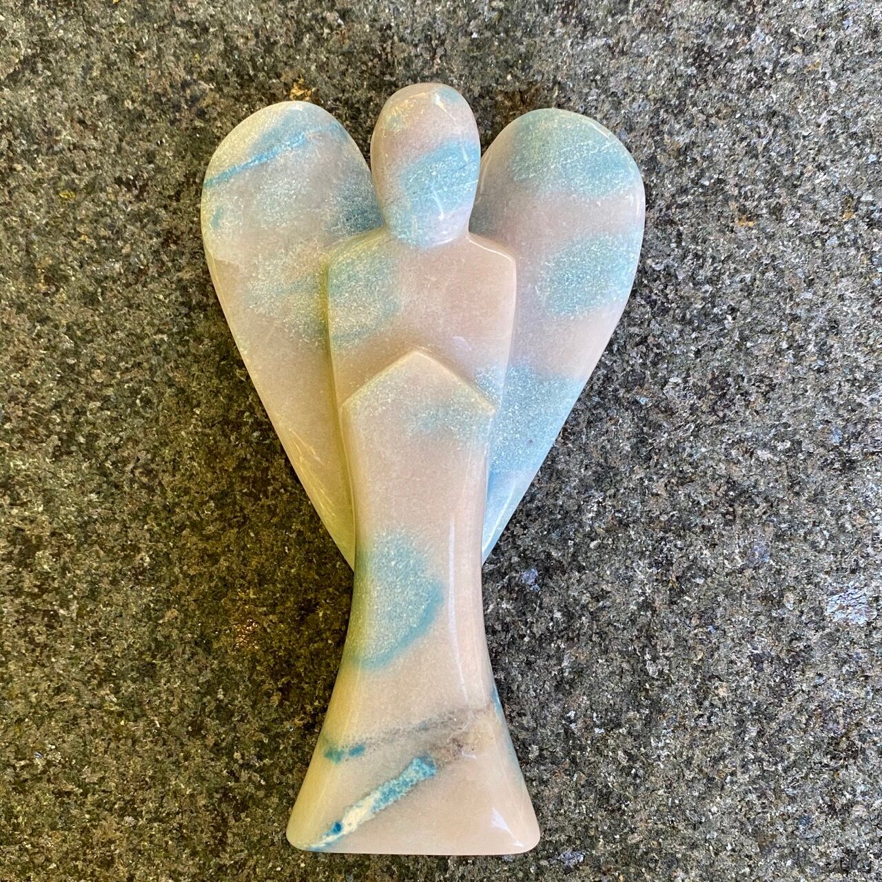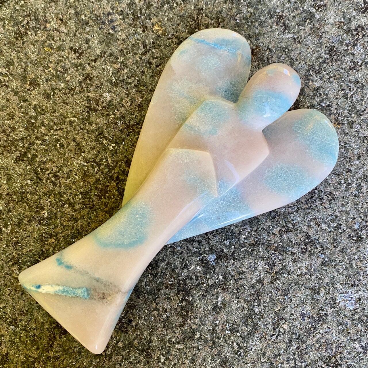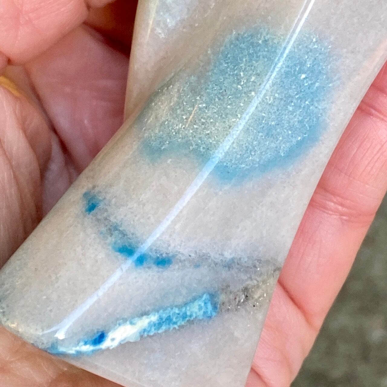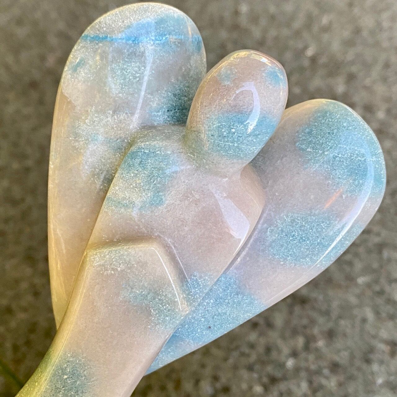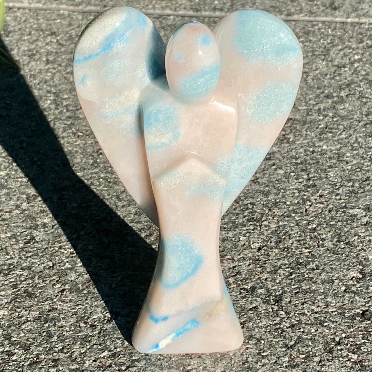 店主の大好きな石、トロレアイトの天使で、ベースの色はトロレアイトの色味の中でも白っぽい、乳白色のような色味で、ベイビーブルーの雲の様なパッチが配された素敵な子です。トロレアイトの本当に素晴らしいところは、粒子のような点が表面に浮き出るところで、白とベビーブルーがミックスしているところは非常に美しく、魅力的で、時を忘れて愛でてしまいます。