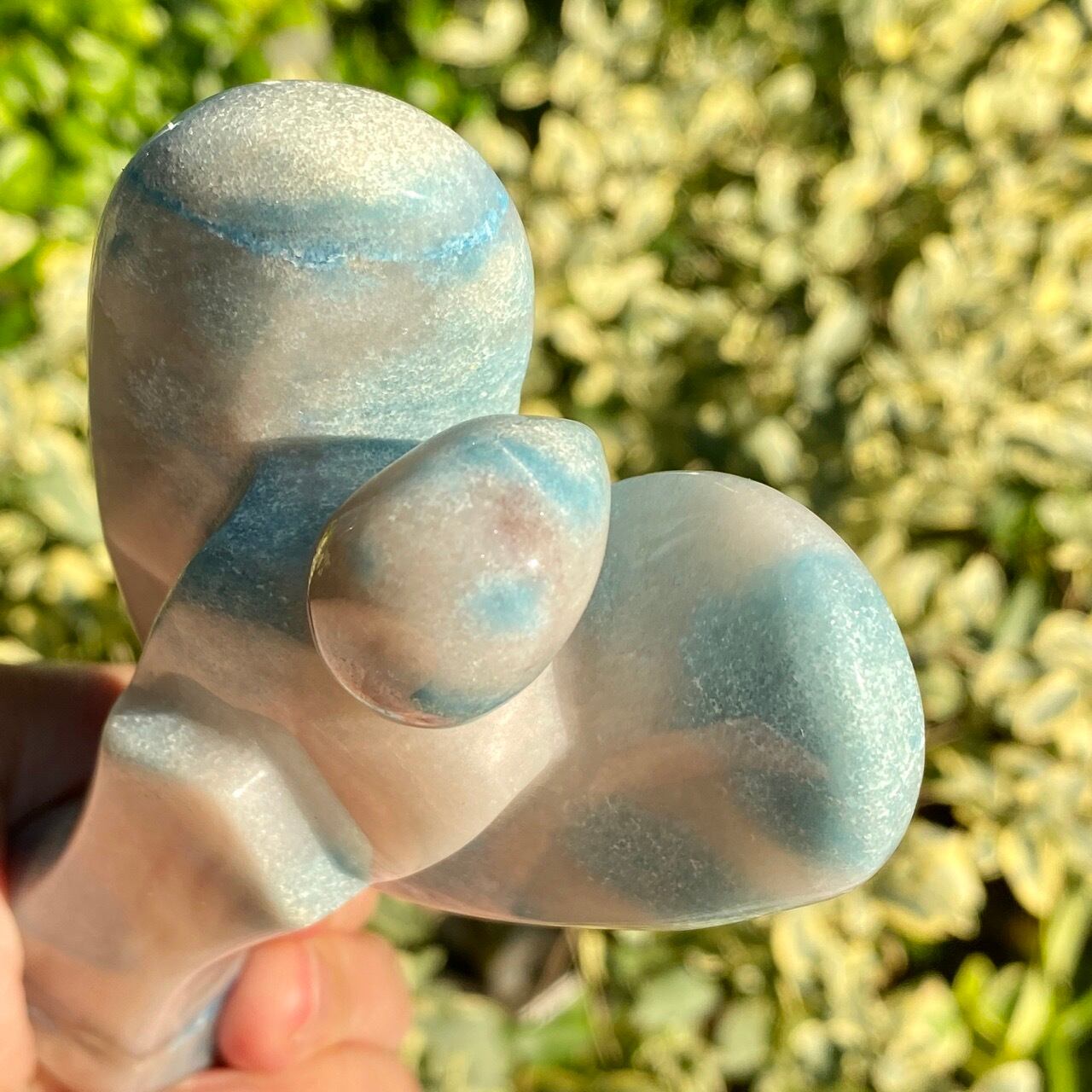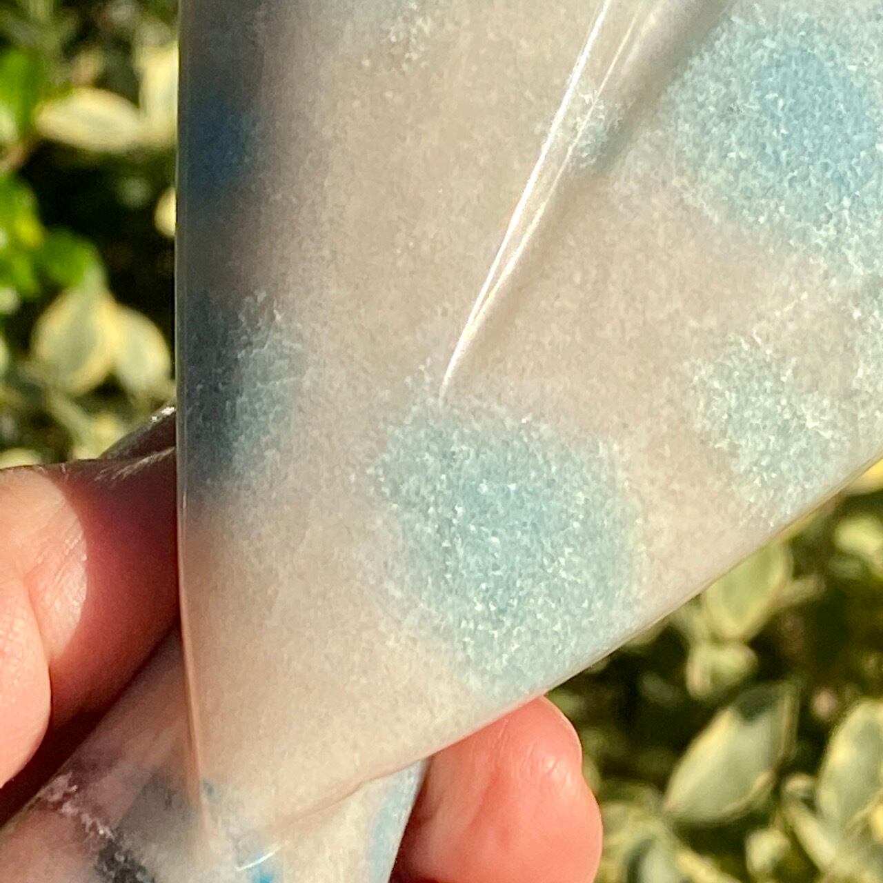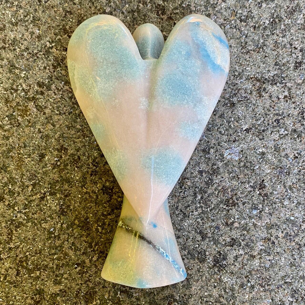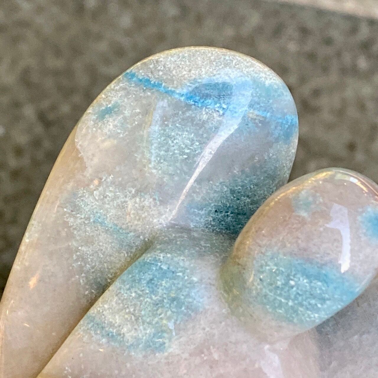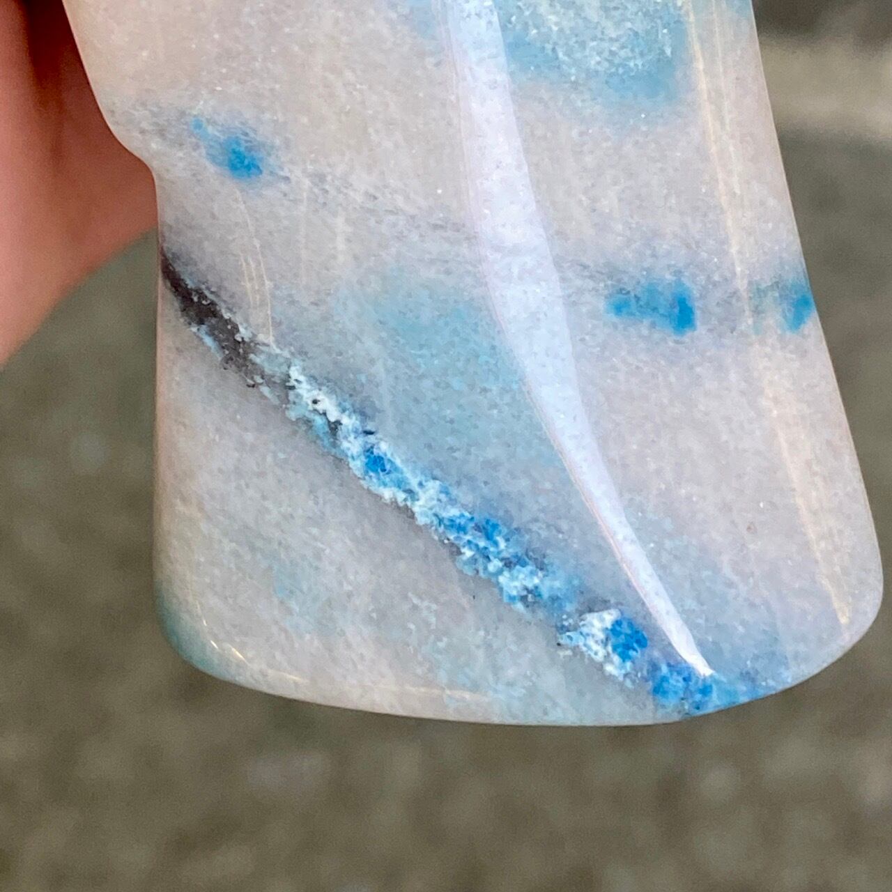 店主の大好きな石、トロレアイトの天使で、ベースの色はトロレアイトの色味の中でも白っぽい、乳白色のような色味で、ベイビーブルーの雲の様なパッチが配された素敵な子です。トロレアイトの本当に素晴らしいところは、粒子のような点が表面に浮き出るところで、白とベビーブルーがミックスしているところは非常に美しく、魅力的で、時を忘れて愛でてしまいます。