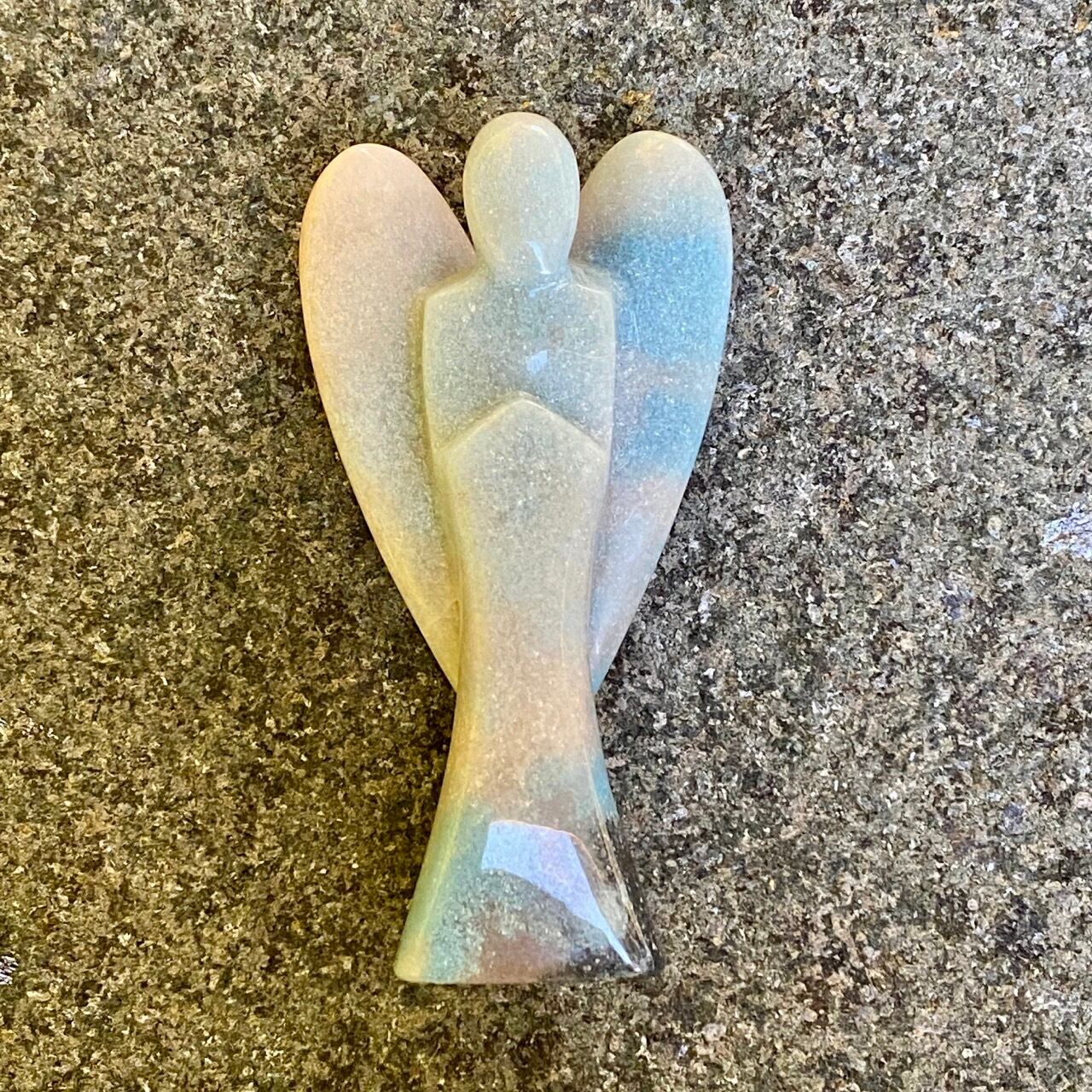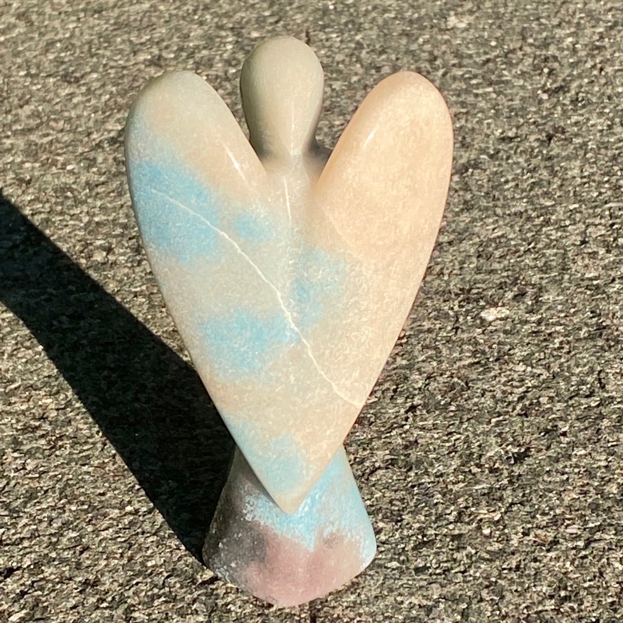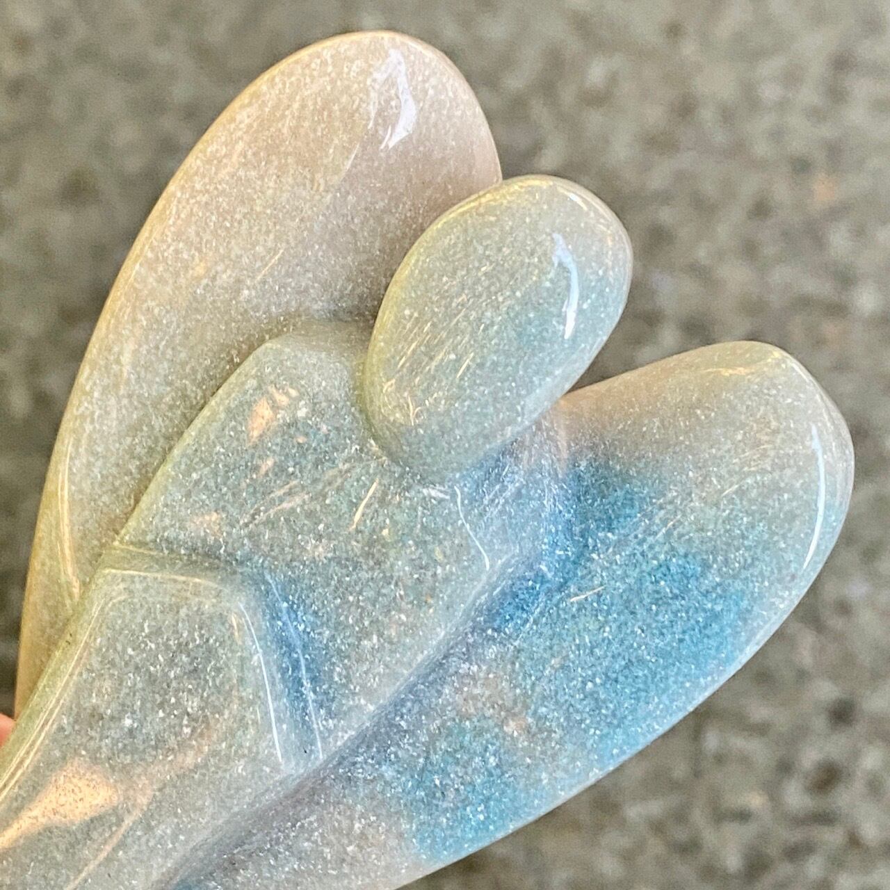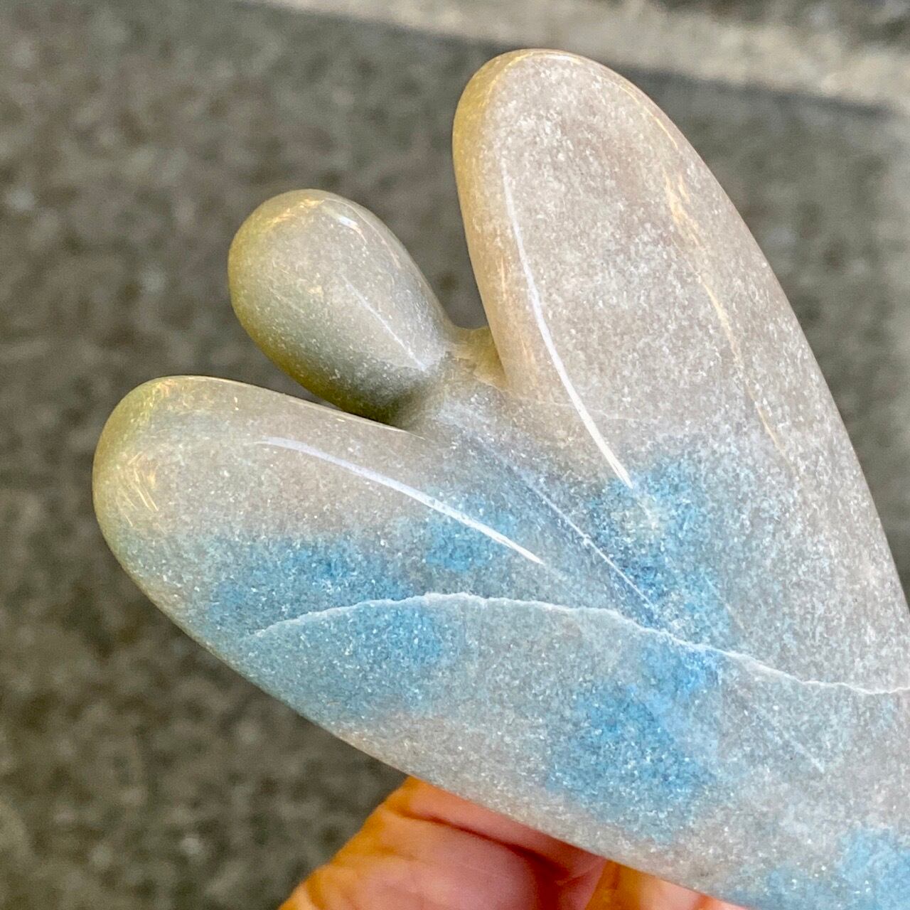 店主の大好きな石、トロレアイトの天使で、べースのは葛餅のような色味で、水色のとネイビーの雲の様なパッチが配された素敵な子です。後ろ面の翼を横切る(一部前面ボディまで達している)ふわっと入った白っぽいラインは触れてもクラックを感じる事はできません。模様として美しかったので、直感でお迎えしました。
