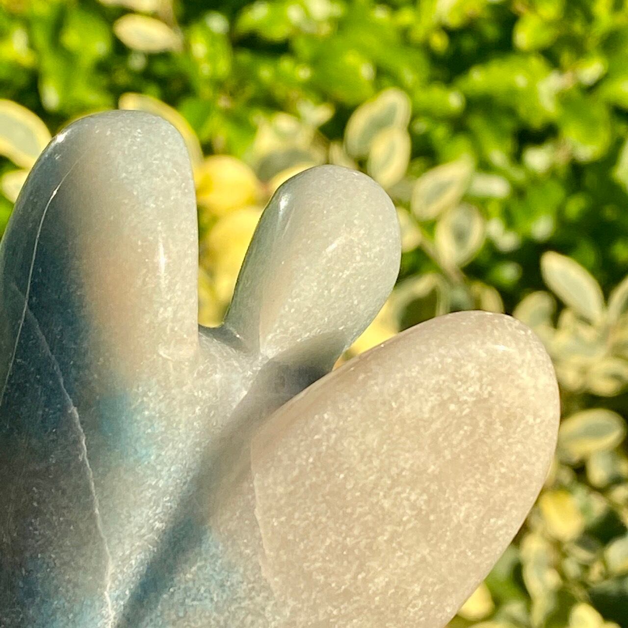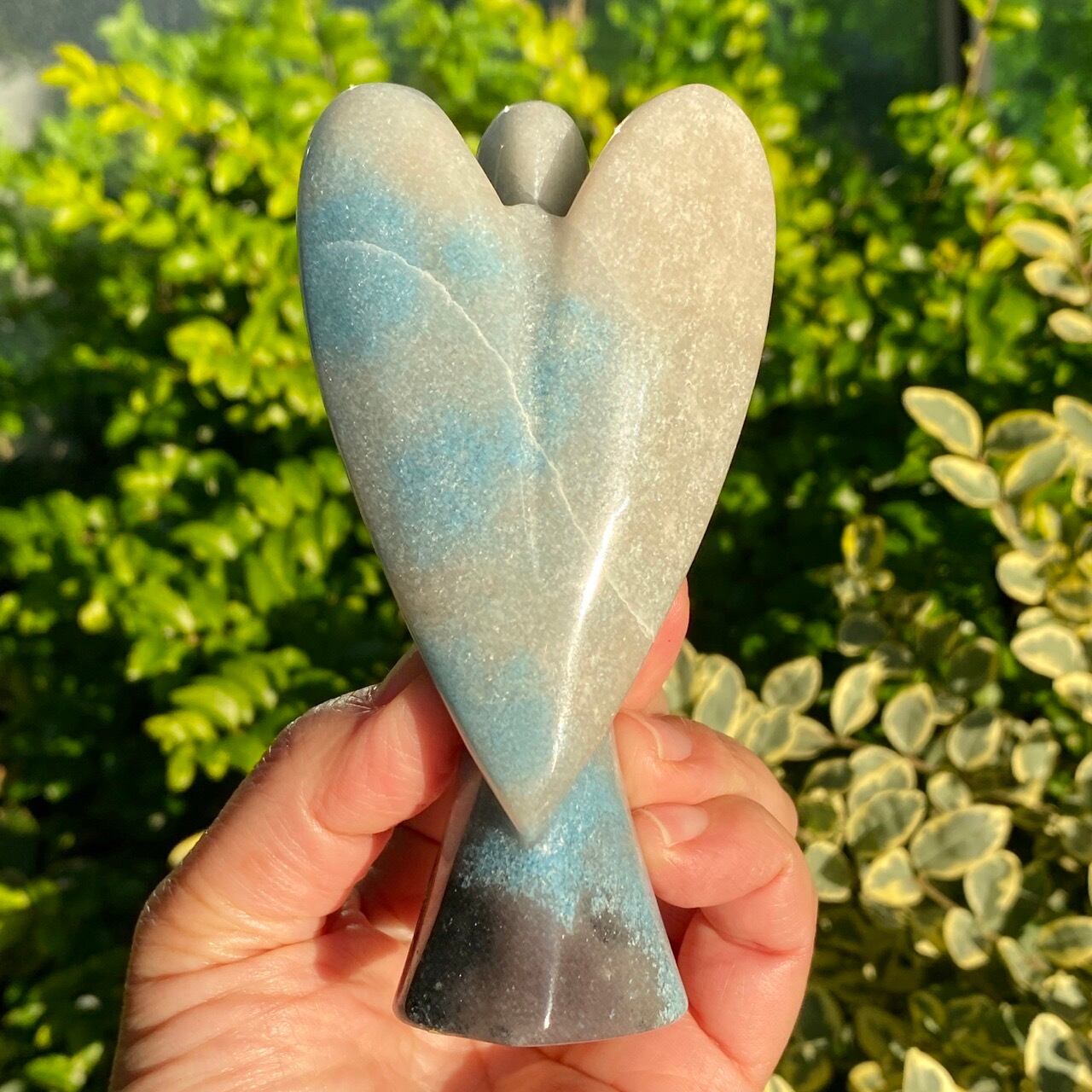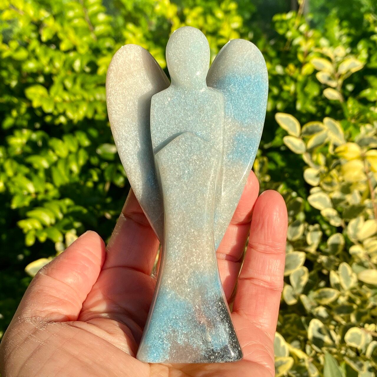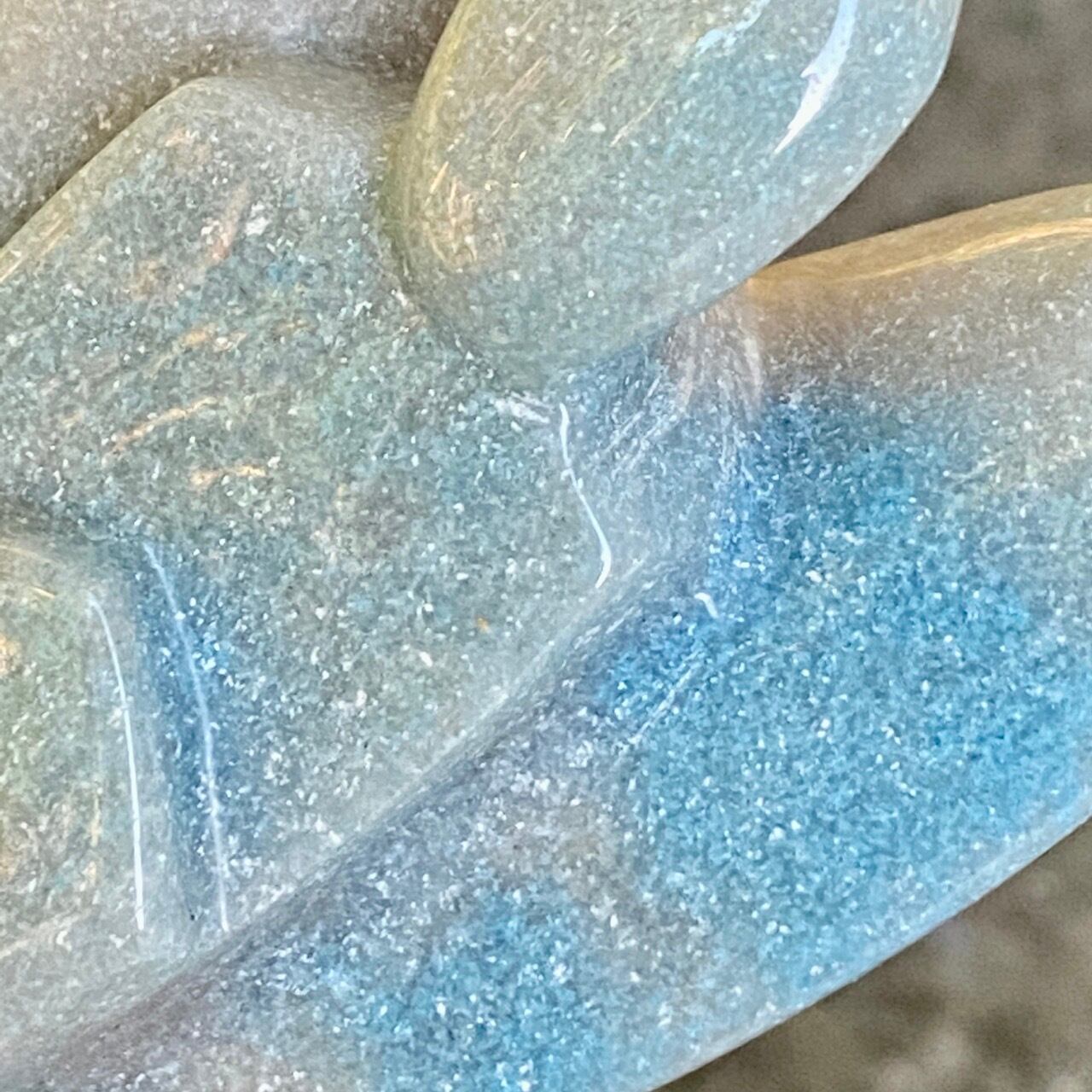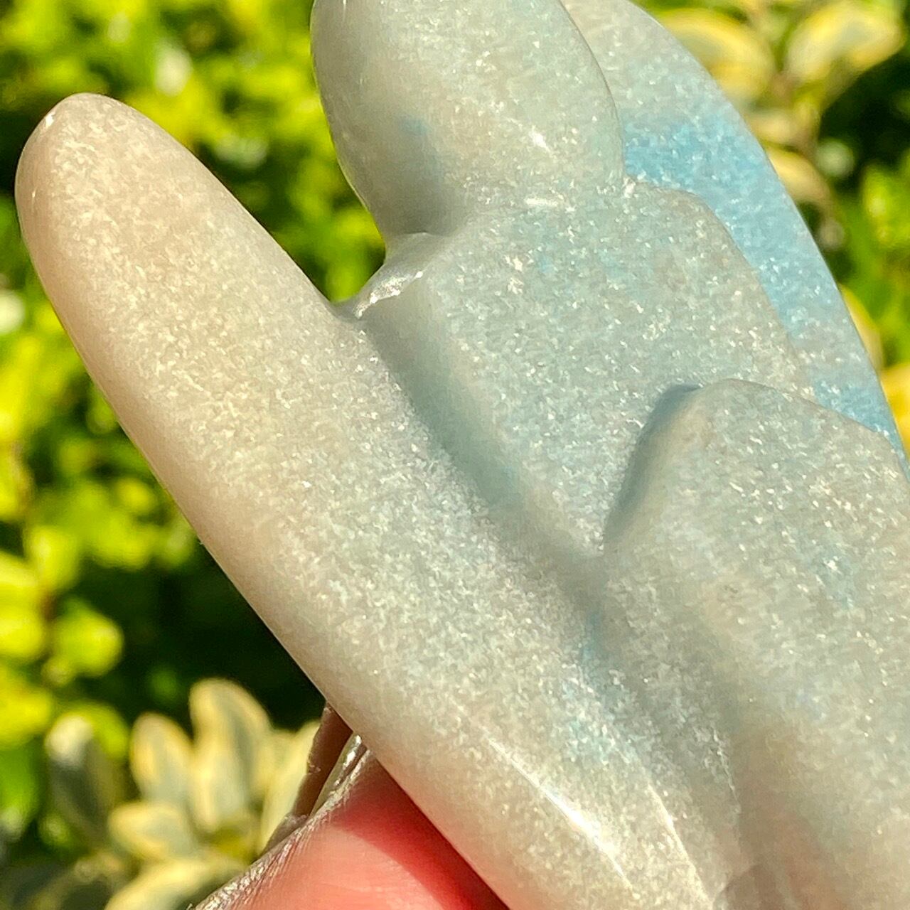 店主の大好きな石、トロレアイトの天使で、べースのは葛餅のような色味で、水色のとネイビーの雲の様なパッチが配された素敵な子です。後ろ面の翼を横切る(一部前面ボディまで達している)ふわっと入った白っぽいラインは触れてもクラックを感じる事はできません。模様として美しかったので、直感でお迎えしました。