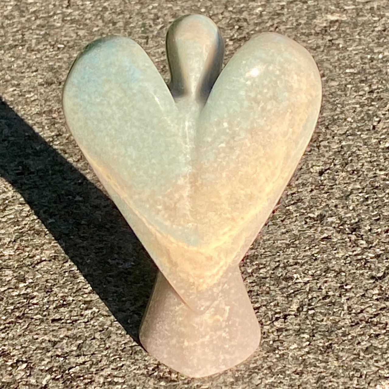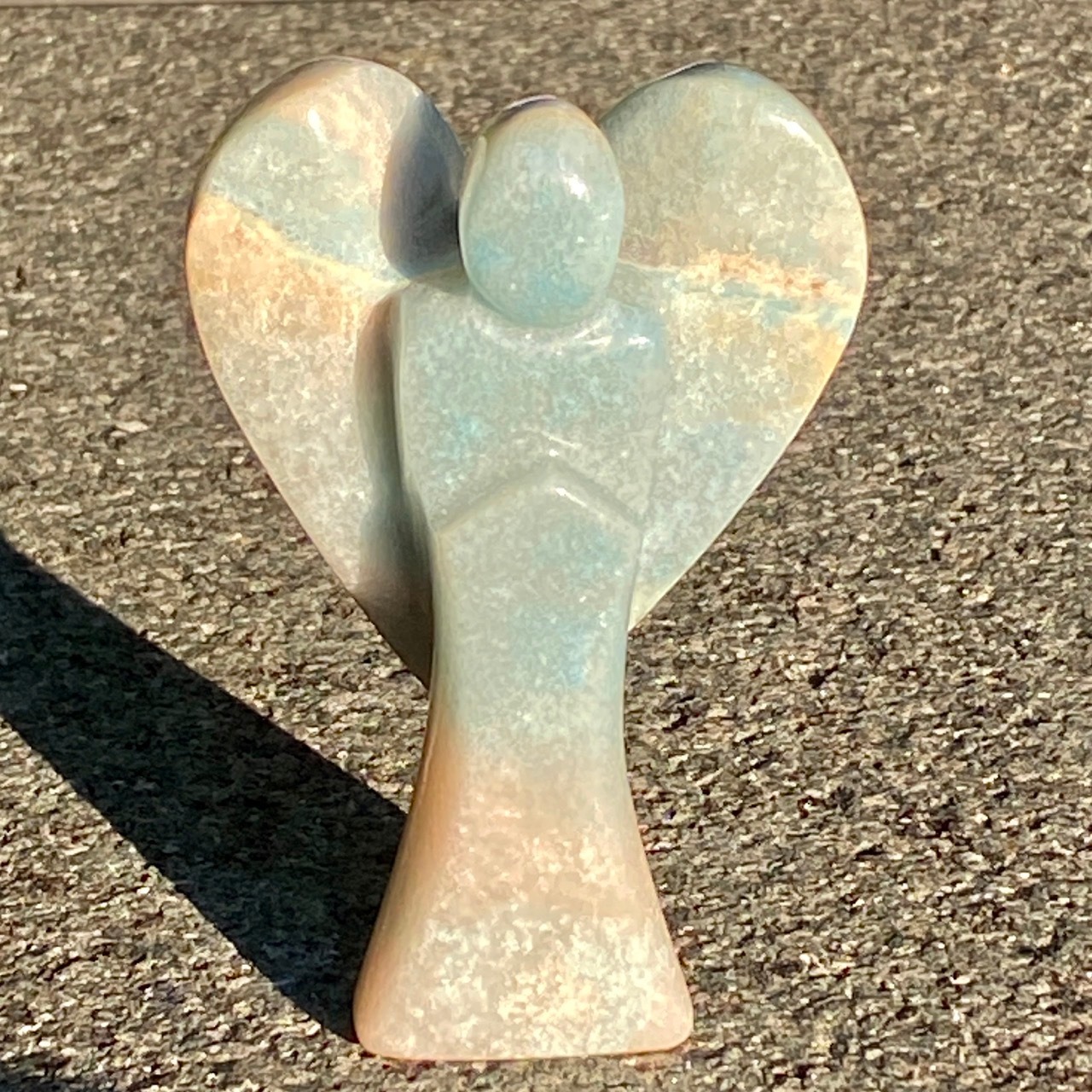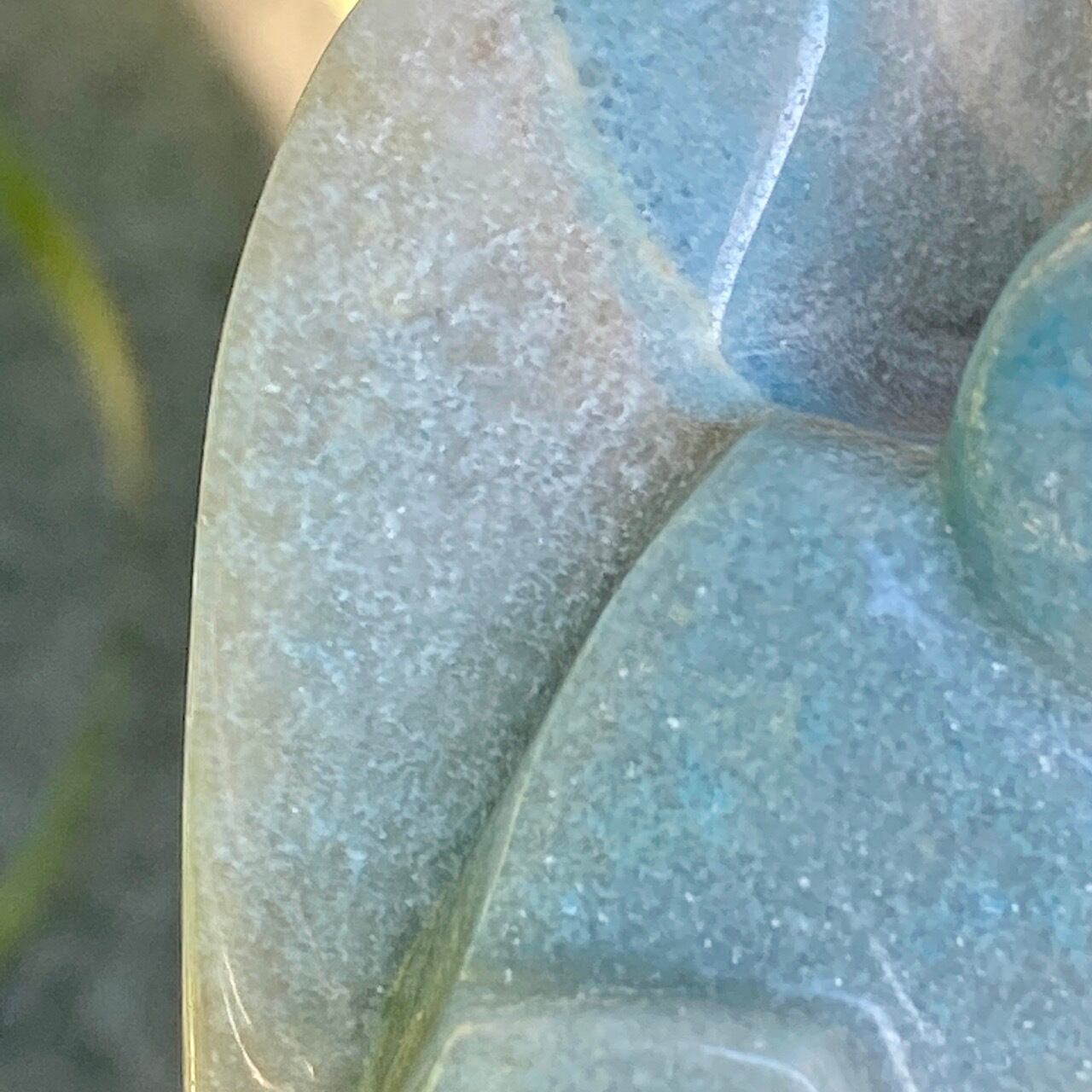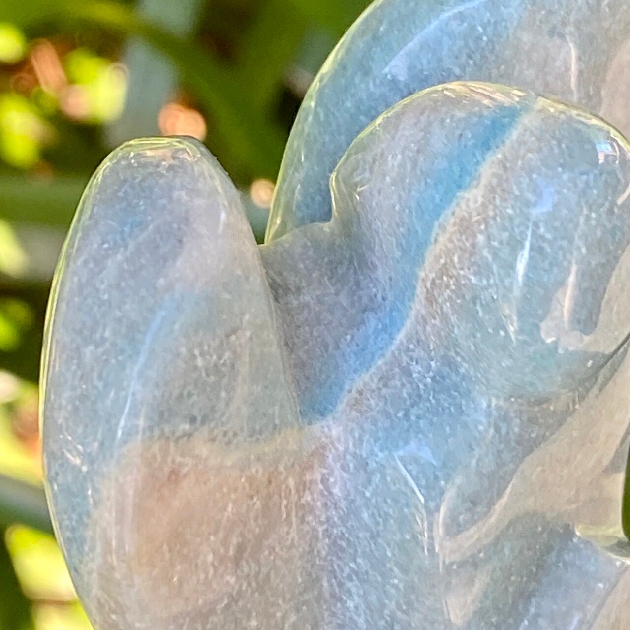 店主の大好きな石、トロレアイトの天使で、ベースはベビーブルーで、乳白色の色味がところどころ配されていて、何ともラブリーなカラーコンビネーションです。目を引くのは、前面の翼を横切るラインというか色の切り替えで、肩から頭頂部を横切って美しい水色と白の縞が走っているので画像でご確認ください。また魅力的なのは、後ろ面の翼に配された光の筋のような白いV字模様(VGが交わる部分に数ミリ僅かに凹んだ部分有り)で、光の存在である天使の神聖さを表しているようで、直感でお迎えしました。