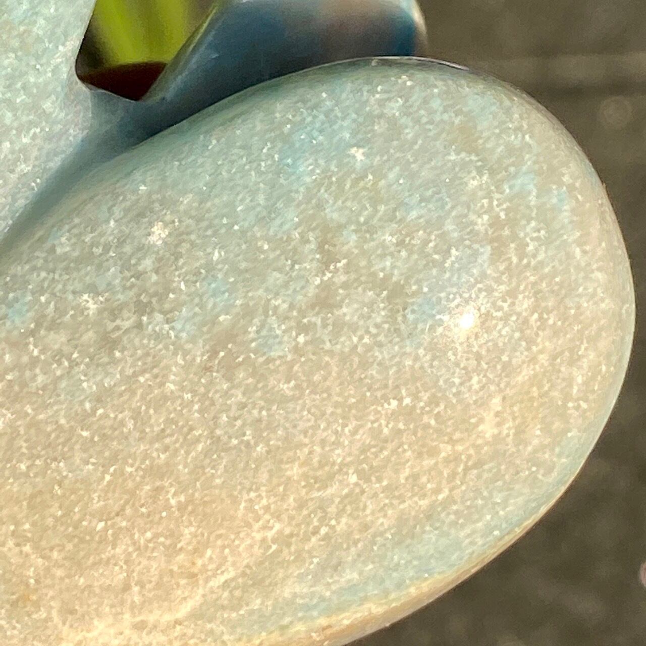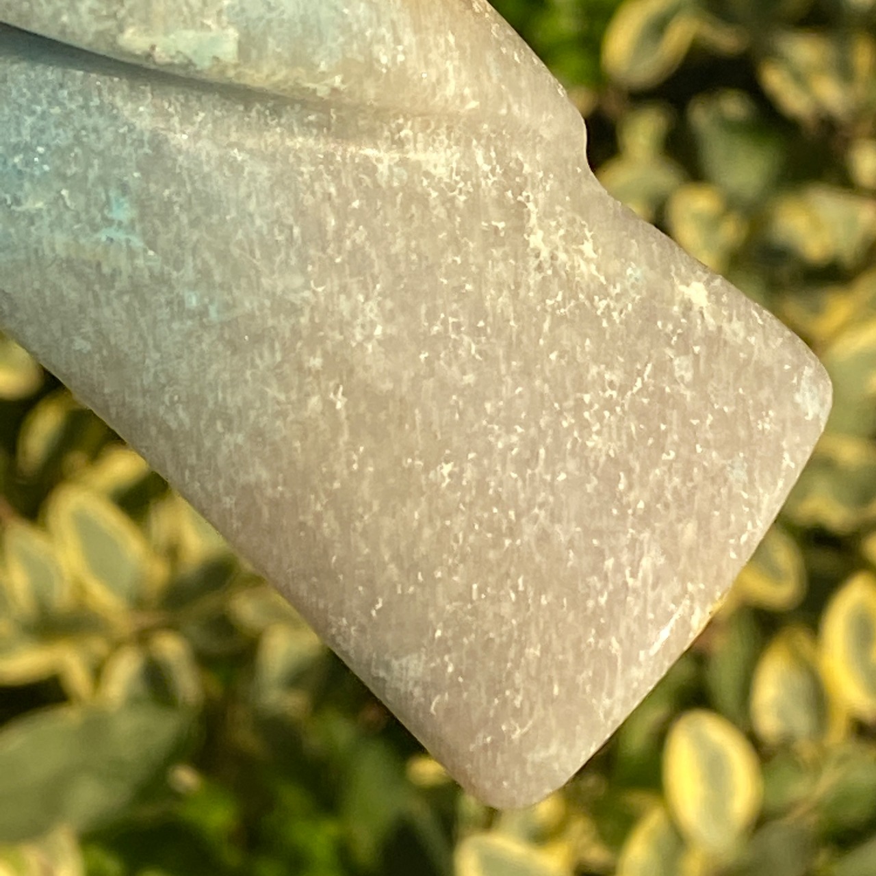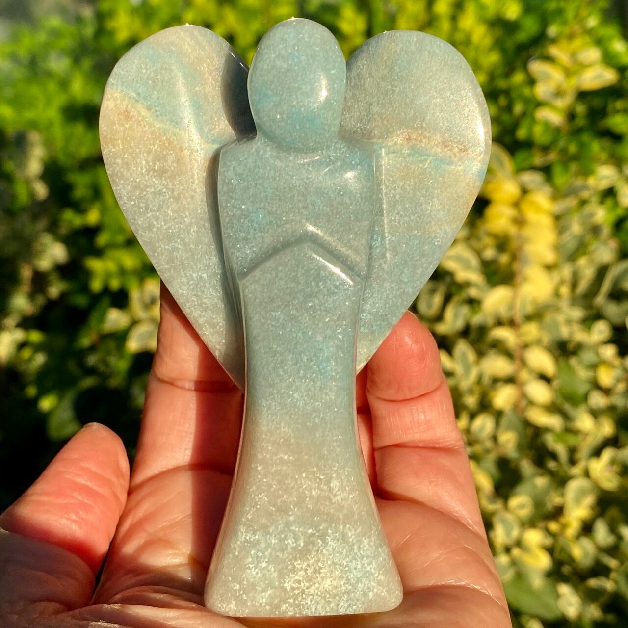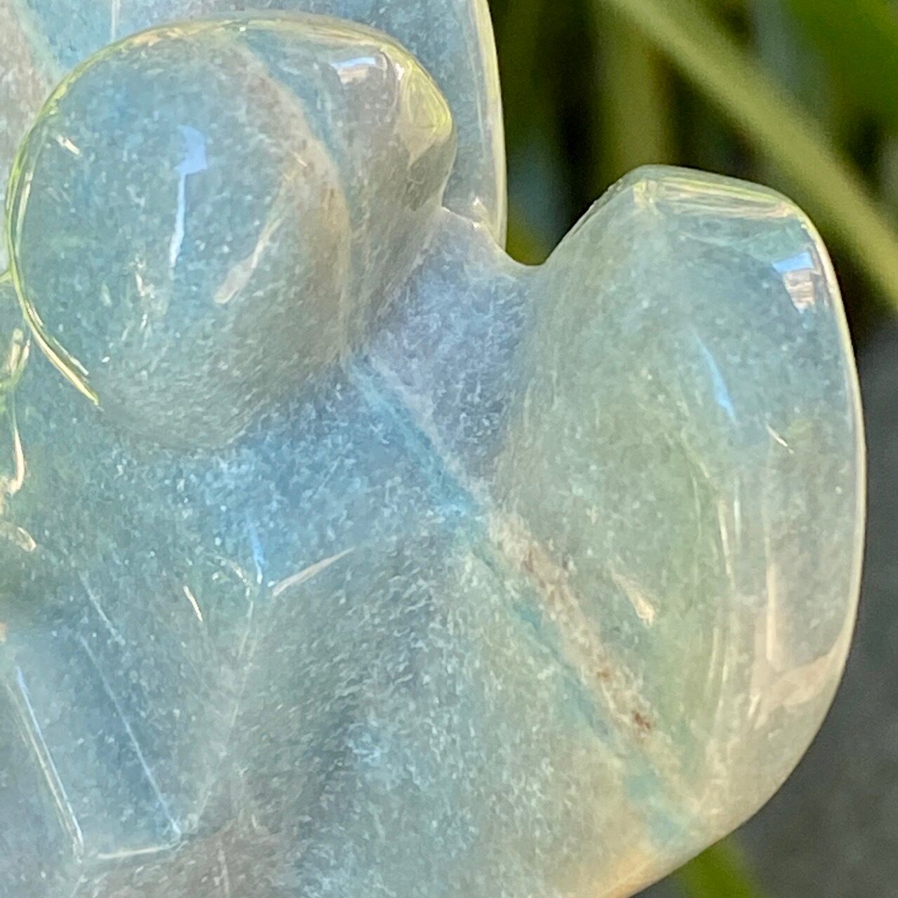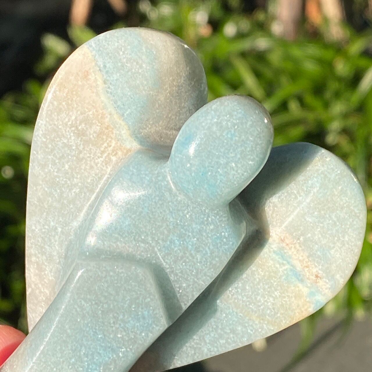 店主の大好きな石、トロレアイトの天使で、ベースはベビーブルーで、乳白色の色味がところどころ配されていて、何ともラブリーなカラーコンビネーションです。目を引くのは、前面の翼を横切るラインというか色の切り替えで、肩から頭頂部を横切って美しい水色と白の縞が走っているので画像でご確認ください。また魅力的なのは、後ろ面の翼に配された光の筋のような白いV字模様(VGが交わる部分に数ミリ僅かに凹んだ部分有り)で、光の存在である天使の神聖さを表しているようで、直感でお迎えしました。