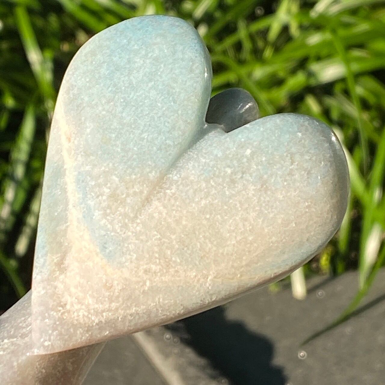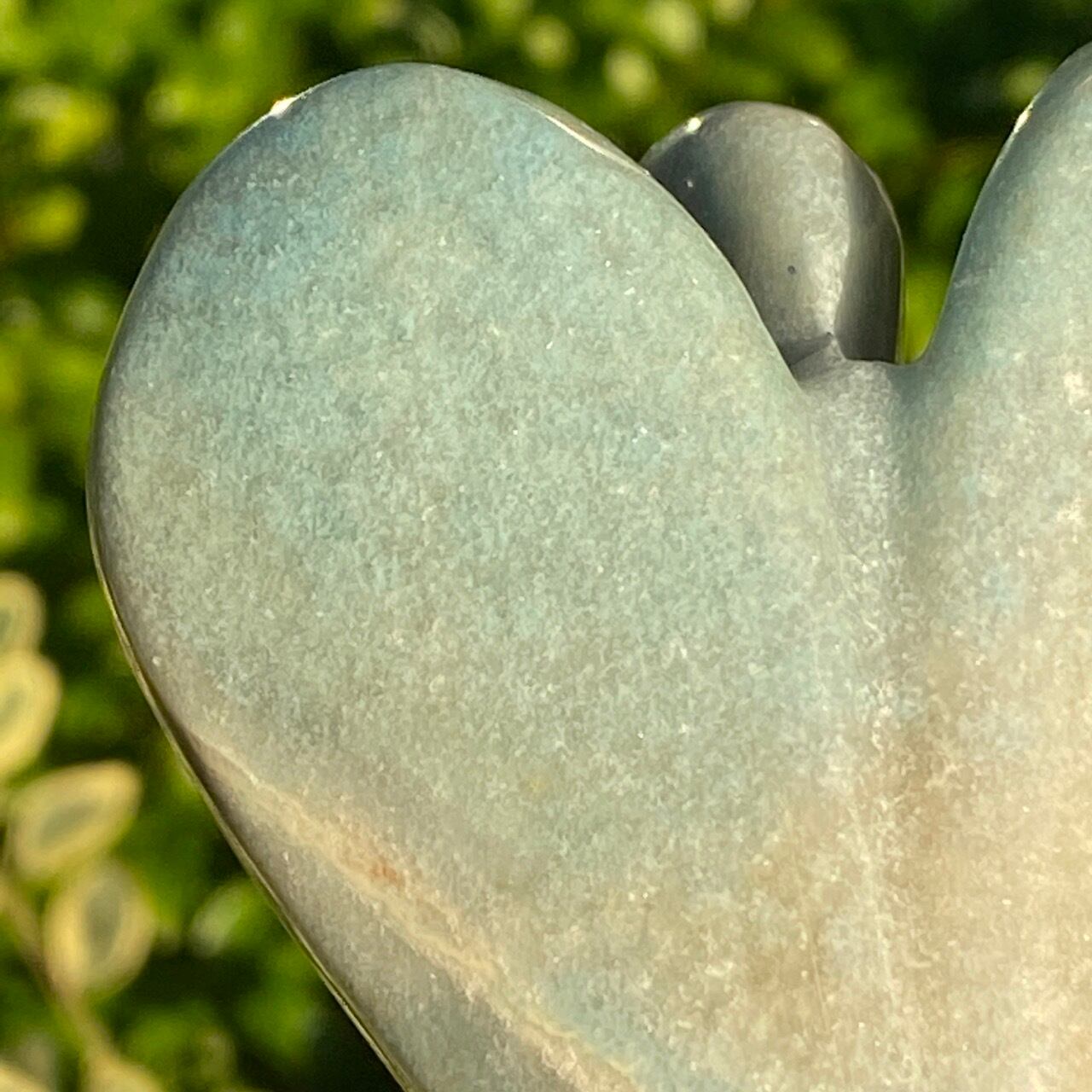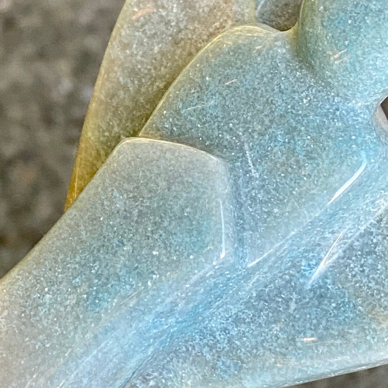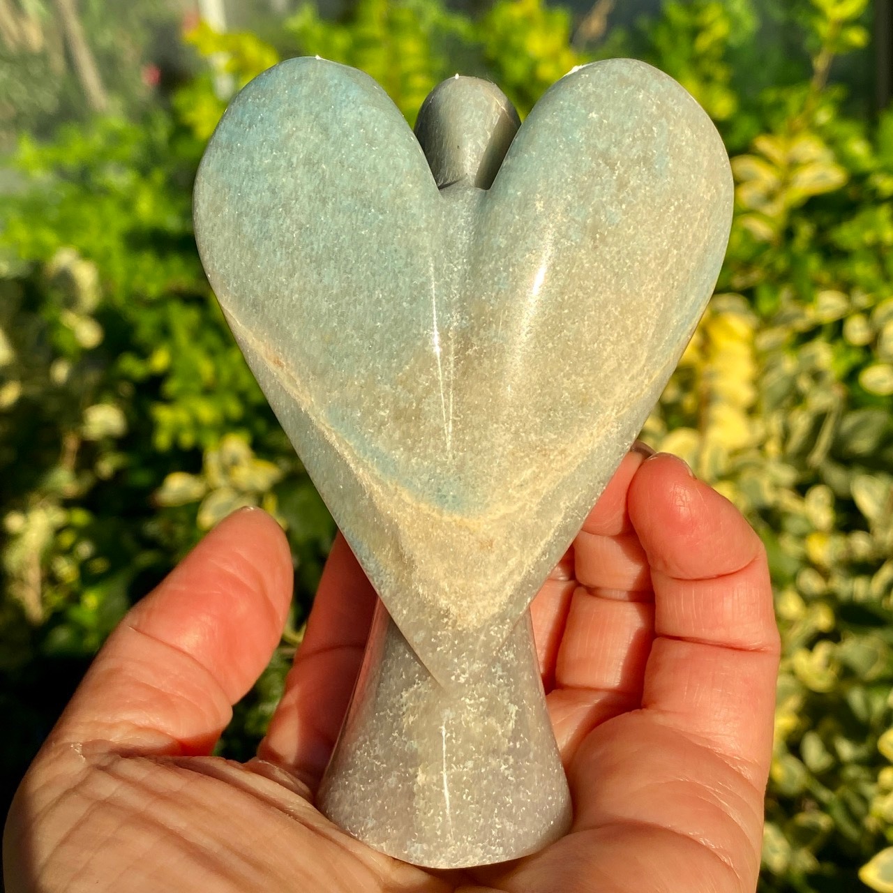 店主の大好きな石、トロレアイトの天使で、ベースはベビーブルーで、乳白色の色味がところどころ配されていて、何ともラブリーなカラーコンビネーションです。目を引くのは、前面の翼を横切るラインというか色の切り替えで、肩から頭頂部を横切って美しい水色と白の縞が走っているので画像でご確認ください。また魅力的なのは、後ろ面の翼に配された光の筋のような白いV字模様(VGが交わる部分に数ミリ僅かに凹んだ部分有り)で、光の存在である天使の神聖さを表しているようで、直感でお迎えしました。