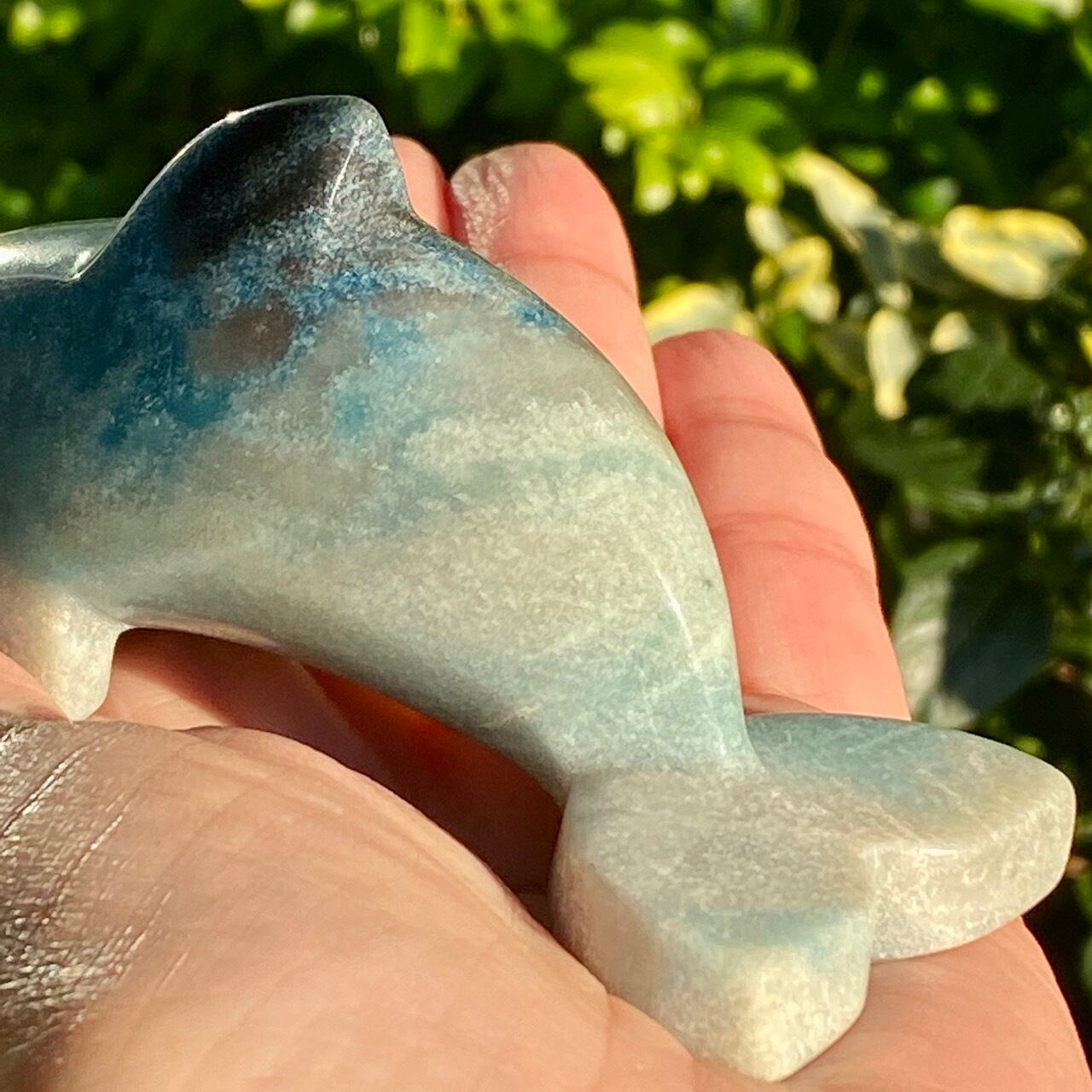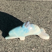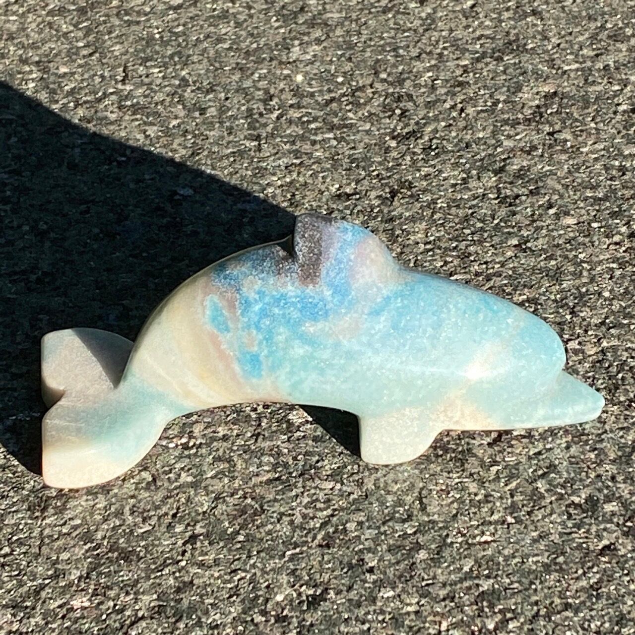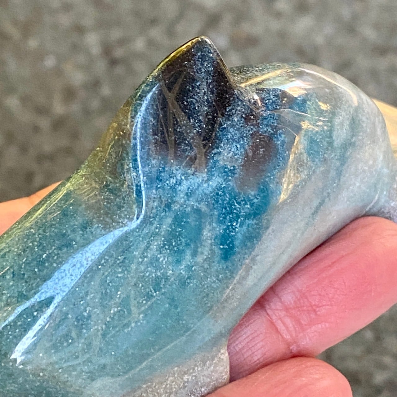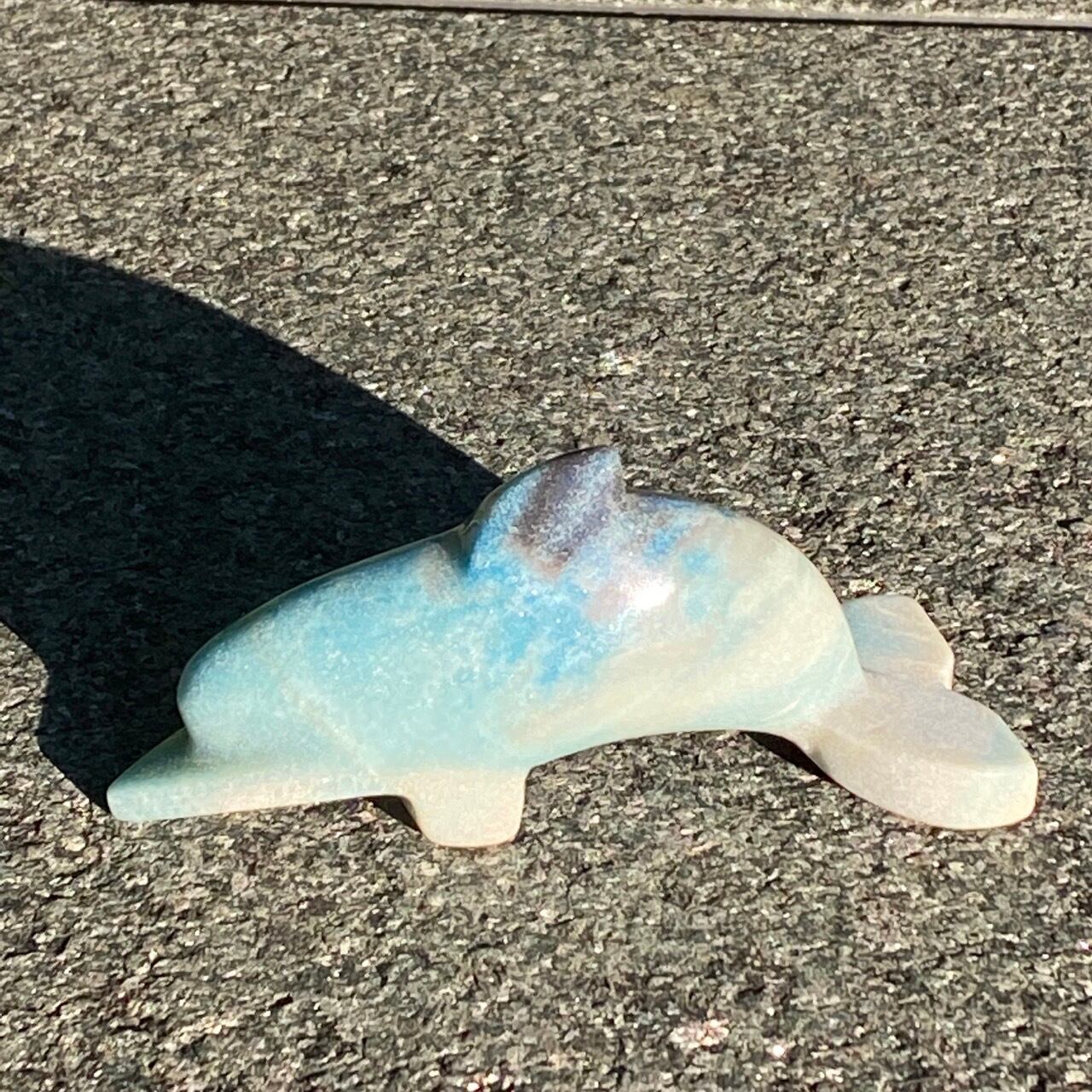 店主の大好きな石、トロレアイトのイルカで、ブルーの濃淡、ネイビー、そして乳白色のコンビネーションが非常に魅力的な子です。神聖な生き物であるイルカとアセンションストーンであるトロレアイトの組み合わせが最強です。