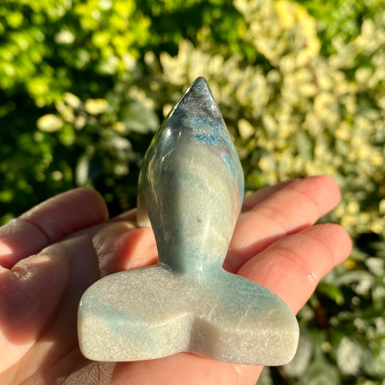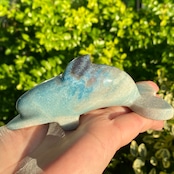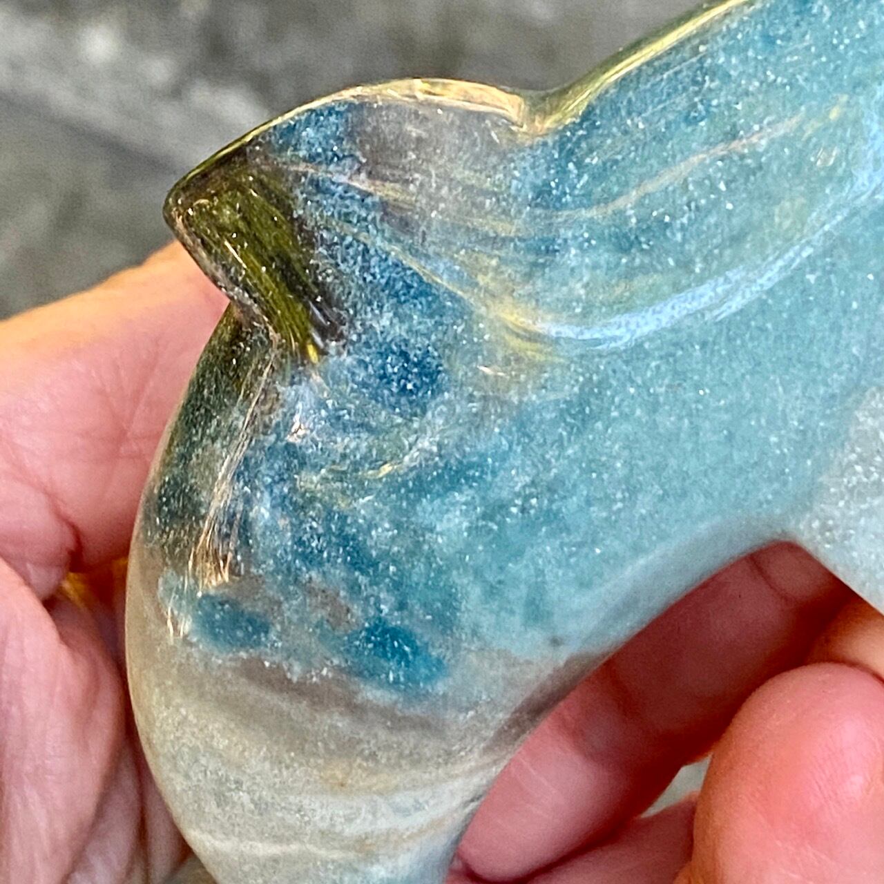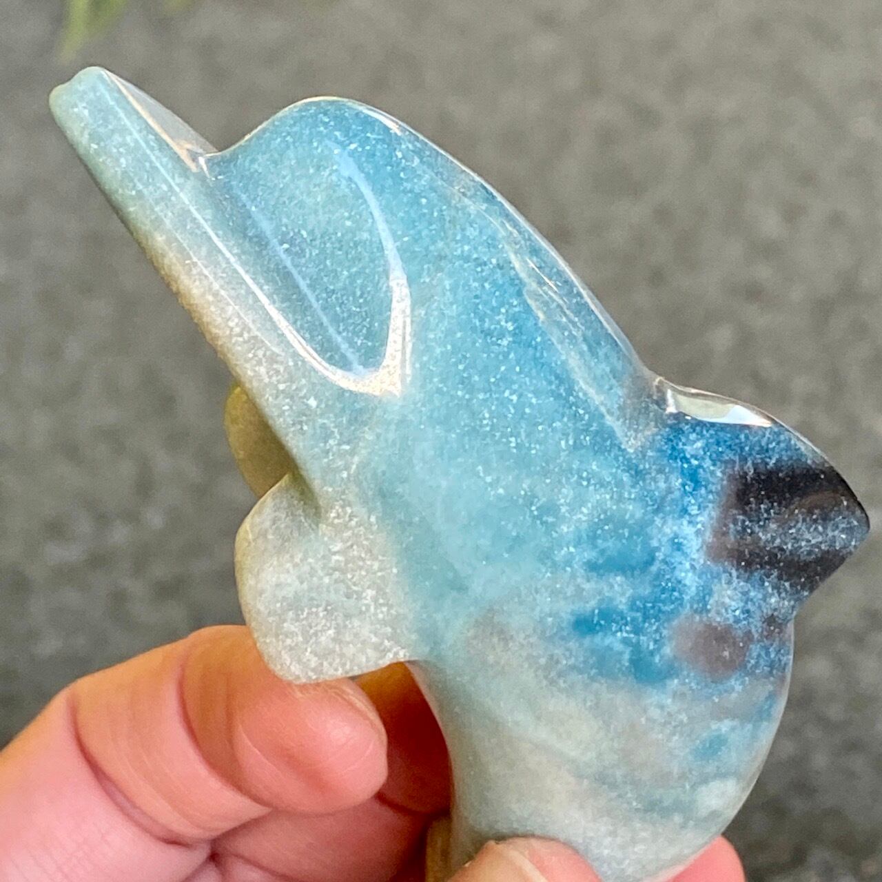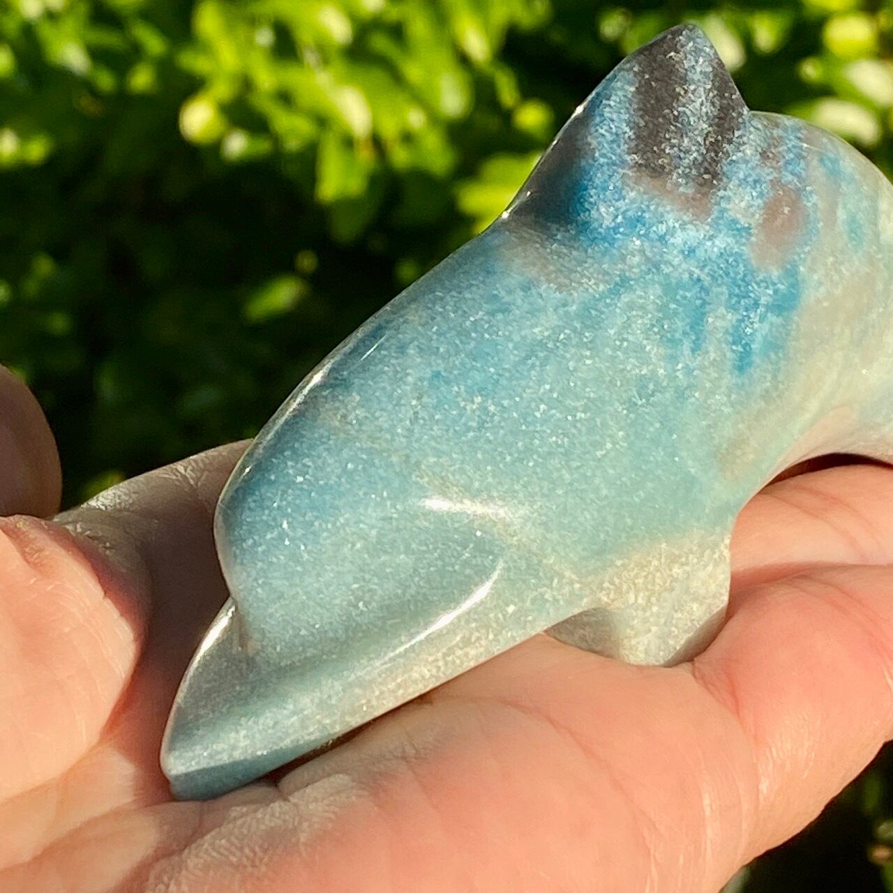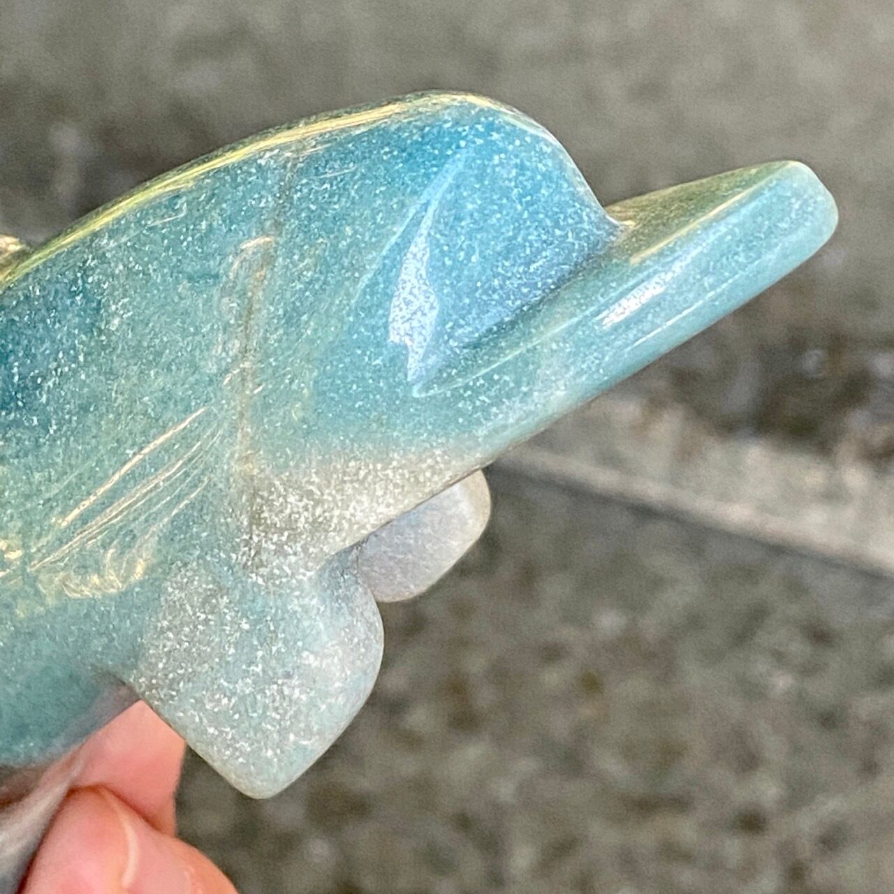 店主の大好きな石、トロレアイトのイルカで、ブルーの濃淡、ネイビー、そして乳白色のコンビネーションが非常に魅力的な子です。神聖な生き物であるイルカとアセンションストーンであるトロレアイトの組み合わせが最強です。